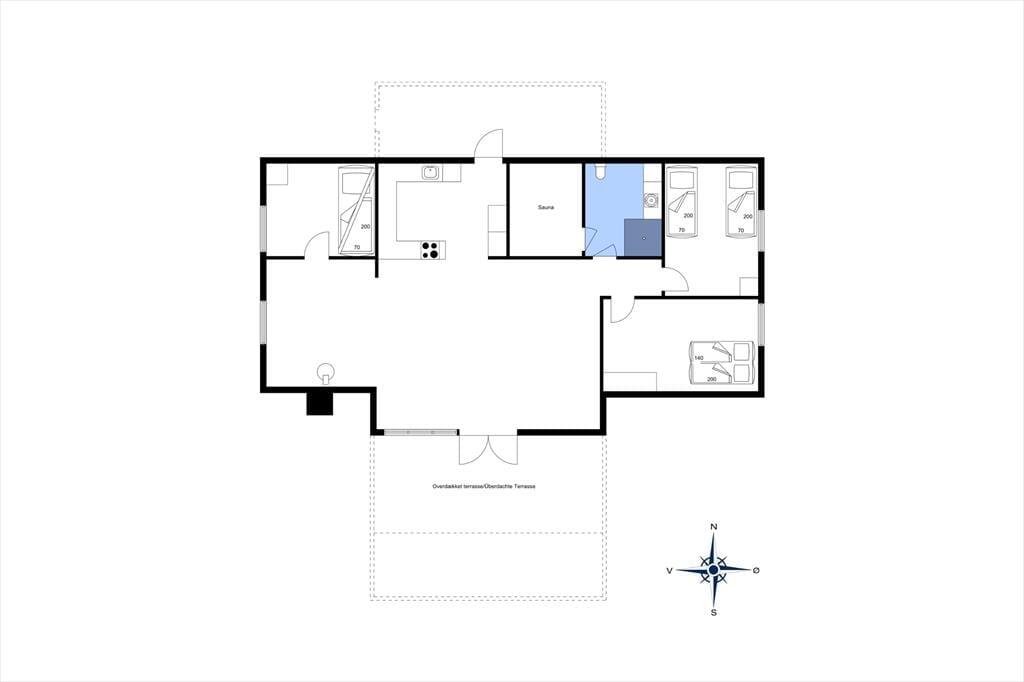 Huset er enkelt og har en standard indretning. Husets hjerte er det renoverede køkken, som er åbent mod den hyggelige stue og spiseafdelingen. I stuen er der lysindfald fra terrassen og plads til at slappe af med en god bog foran brændeovnen. Huset rummer også et badeværelse og tre værelser, hvoraf et er med dobbeltseng, et med 2 enkeltsenge og det sidste har en køjeseng. I huset forefindes trådløst internet opkobling.