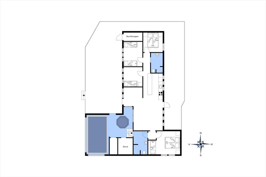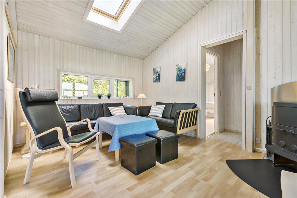 Sommerhuset er indrettet med et dejligt stort og veludstyret køkken-alrum, hvorfra man har et fint overblik over både spisestue og sofaområde. Fra husets centrum er der nem adgang til de 4 soveværelser. Over den ene soveafdeling ligger en stor hems, som man har adgang til via en stige og som fungerer fint som legeplads til de lidt større børn. Ydermere er her to badeværelser, hvoraf det ene er placeret mod vest i forbindelse med poolområdet. Husets pool og en del af stuen bliver opvarmet via oliefyret, og da huset også råder over brændeovn er her tale om et meget energivenligt sommerhus.