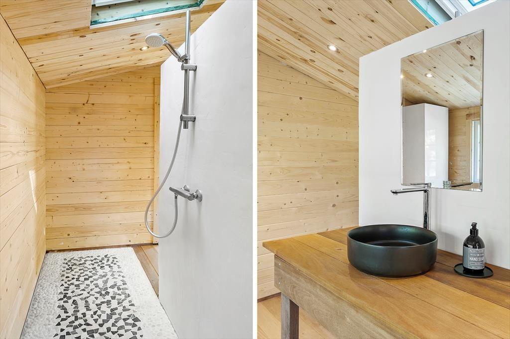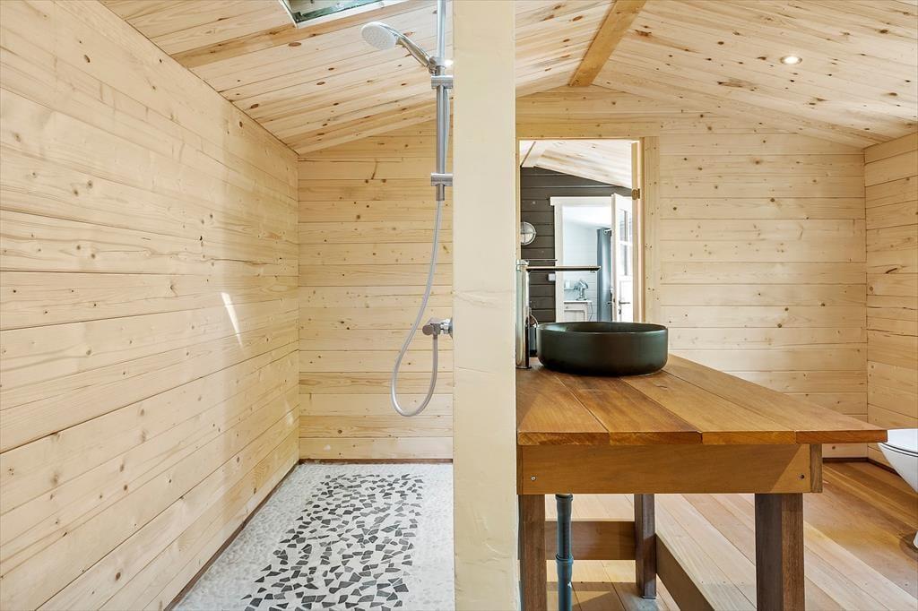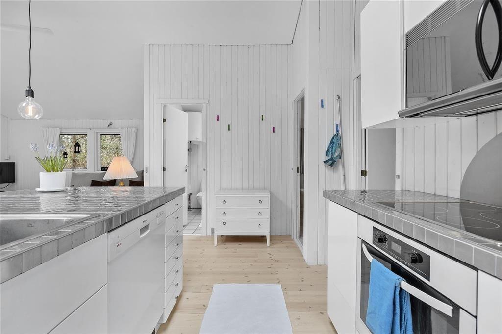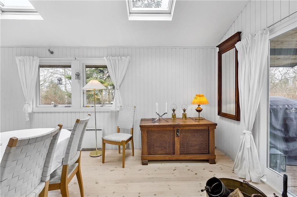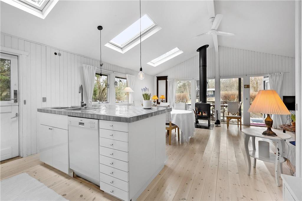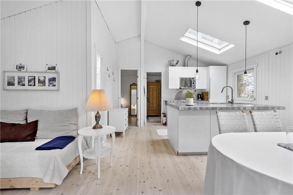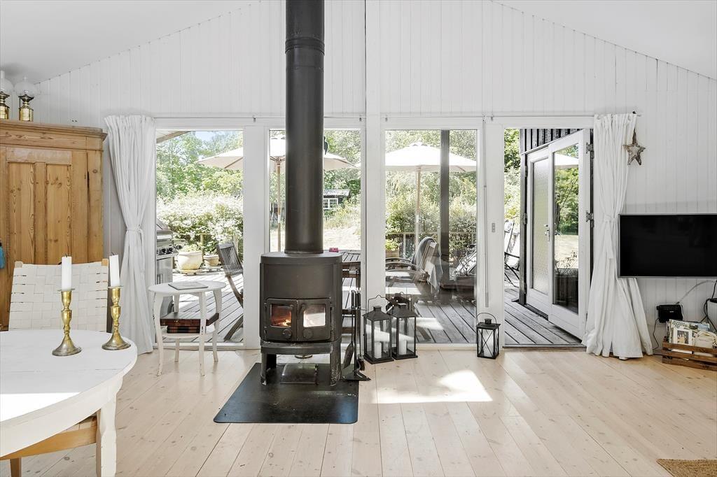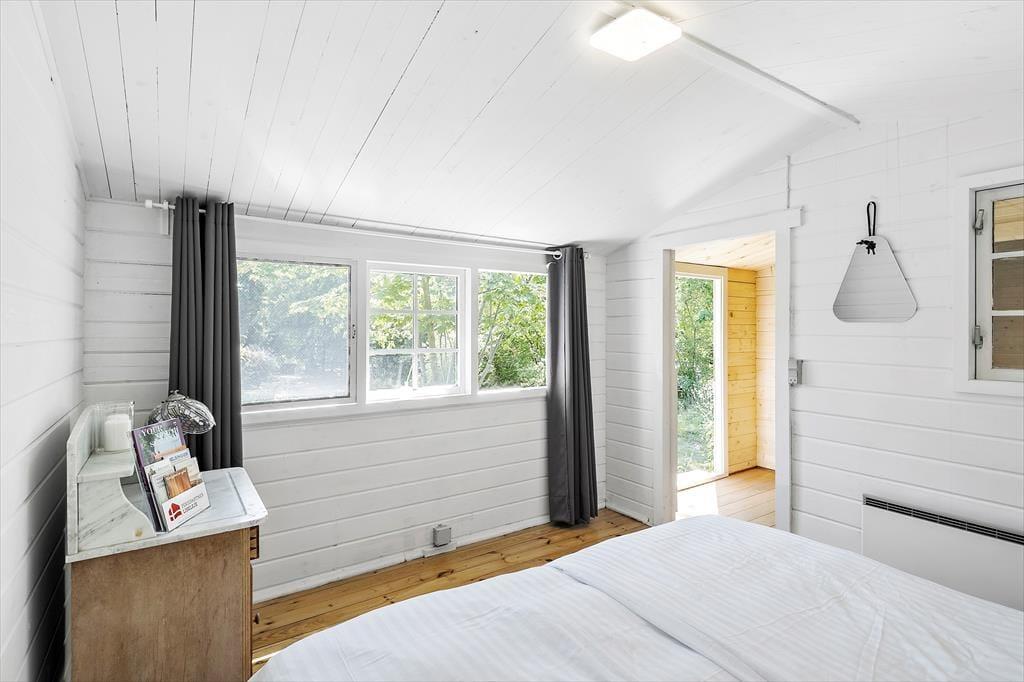Sommerhuset byder på et lyst og åbent køkken-alrum med en indbydende atmosfære. Her er der plads til hyggelige stunder ved spisebordet, mens det åbne køkken gør det nemt at være sammen, uanset om der kokkereres eller snakkes. Det hyggelige tv-hjørne indbyder til afslapning med en god film eller en bog efter en dag fuld af oplevelser. De store vinduer og terrassedøren forbinder ude og inde på smukkeste vis og lader lyset strømme ind i rummet. I annekset finder du et ekstra soveværelse samt et nyt og moderne badeværelse, der giver ekstra komfort for gæsterne.
