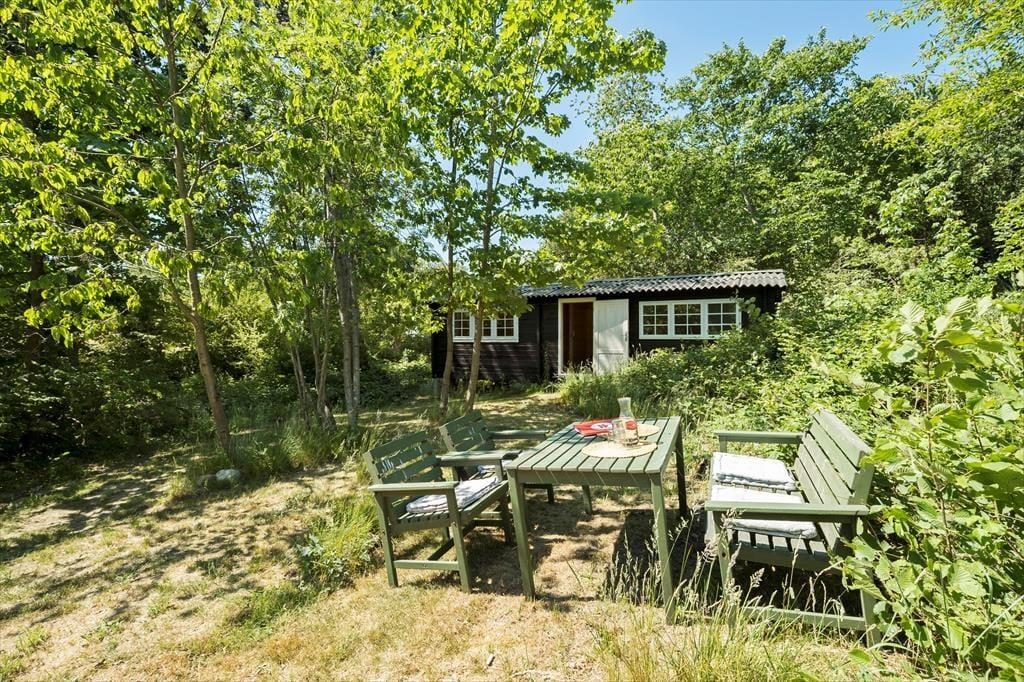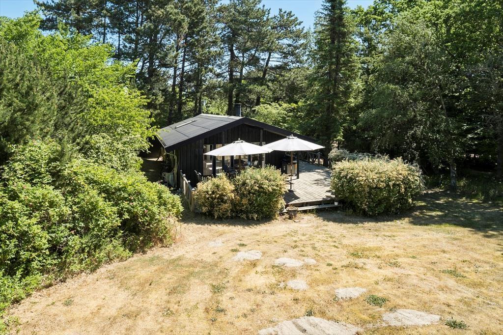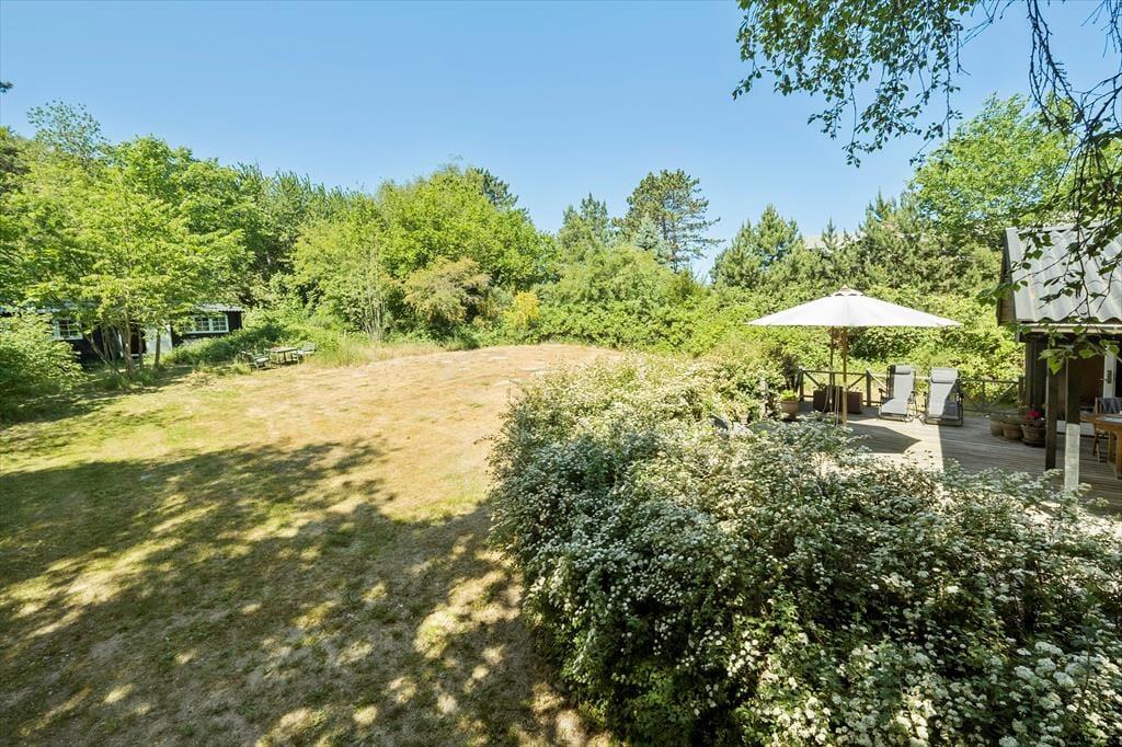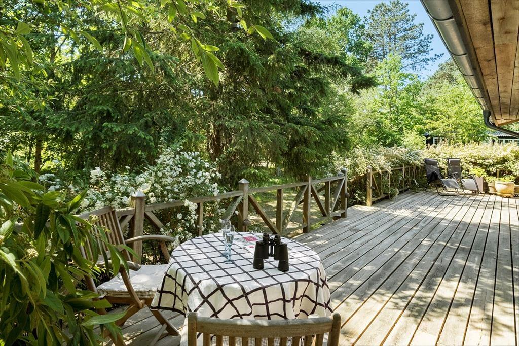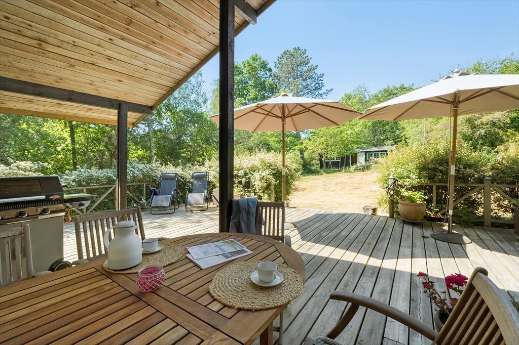 Udendørs venter en stor hævet træterrasse, hvor du kan nyde sommerens lange dage og lune aftener. En del af terrassen er overdækket, så du kan sidde i læ for solen eller aftenduggen, mens du nyder middagen eller et glas vin. Haven er omkranset af træer og buske og byder på en græsplæne, der er perfekt til boldspil eller leg med hunden. Her er der plads til både afslapning og aktiviteter i den friske luft, mens freden og roen i det omkringliggende sommerhusområde skaber den perfekte ramme for total afkobling.