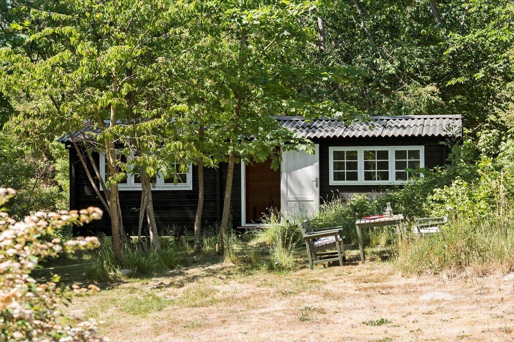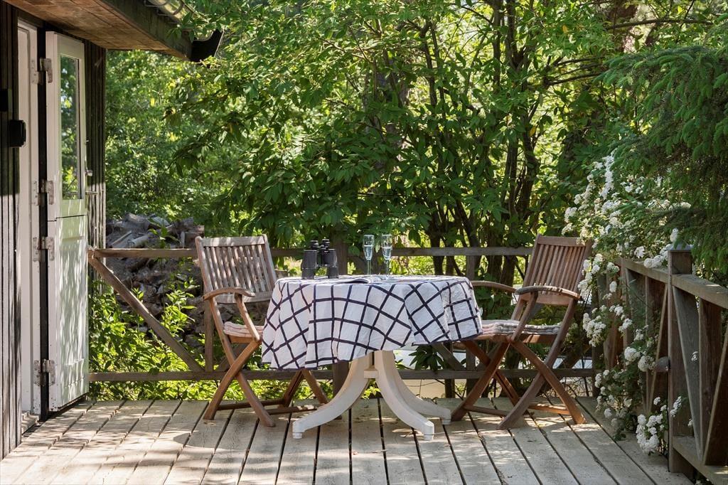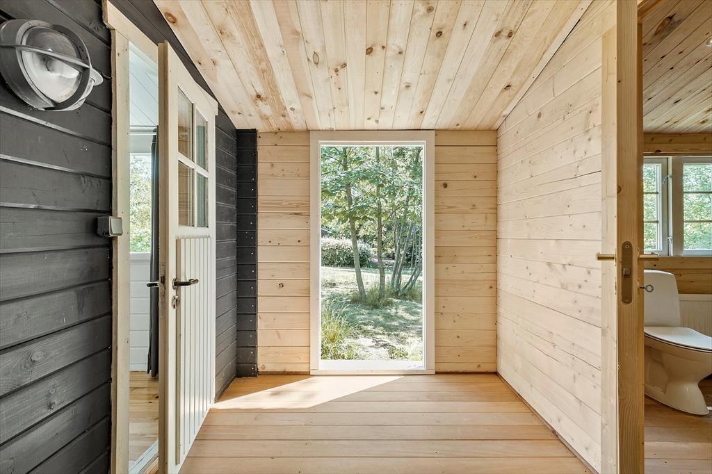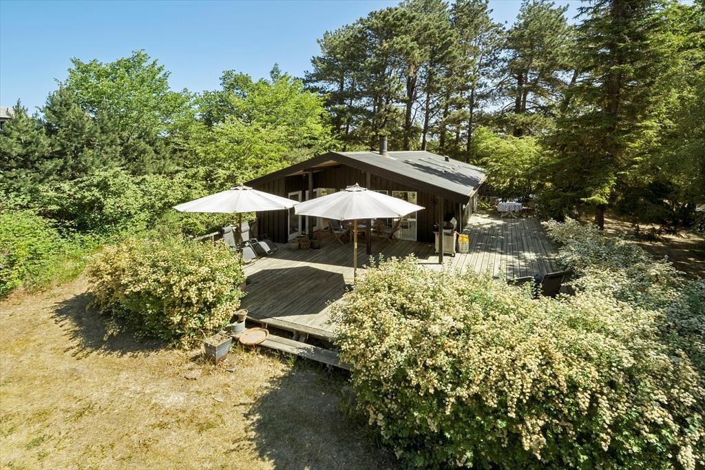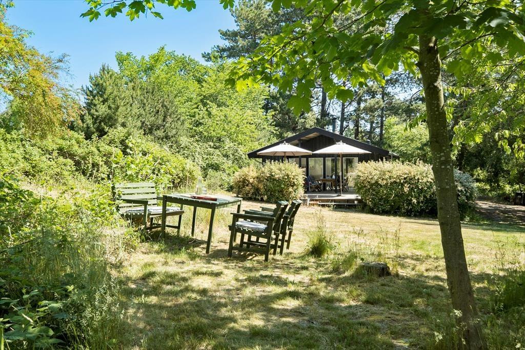 Udendørs venter en stor hævet træterrasse, hvor du kan nyde sommerens lange dage og lune aftener. En del af terrassen er overdækket, så du kan sidde i læ for solen eller aftenduggen, mens du nyder middagen eller et glas vin. Haven er omkranset af træer og buske og byder på en græsplæne, der er perfekt til boldspil eller leg med hunden. Her er der plads til både afslapning og aktiviteter i den friske luft, mens freden og roen i det omkringliggende sommerhusområde skaber den perfekte ramme for total afkobling.