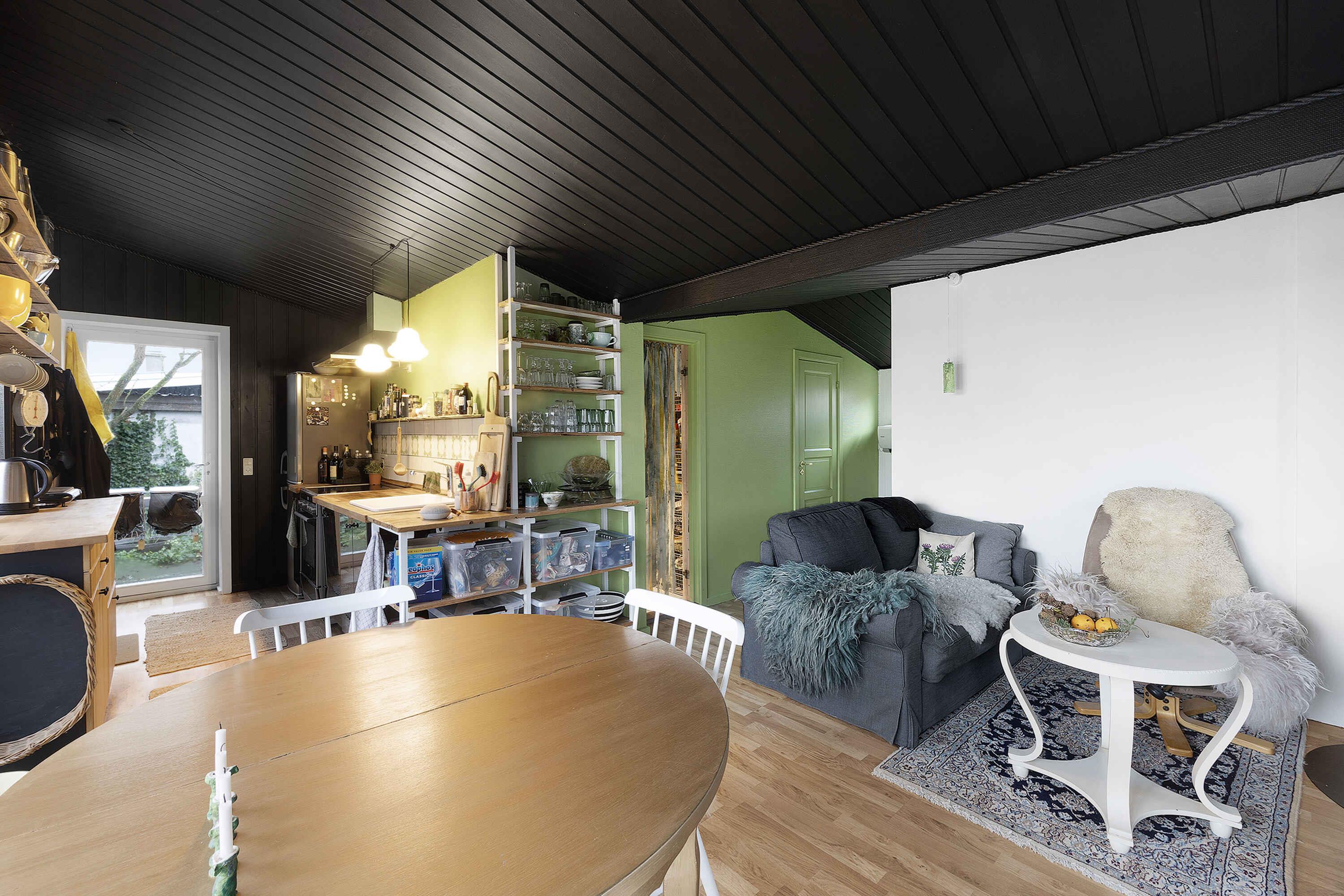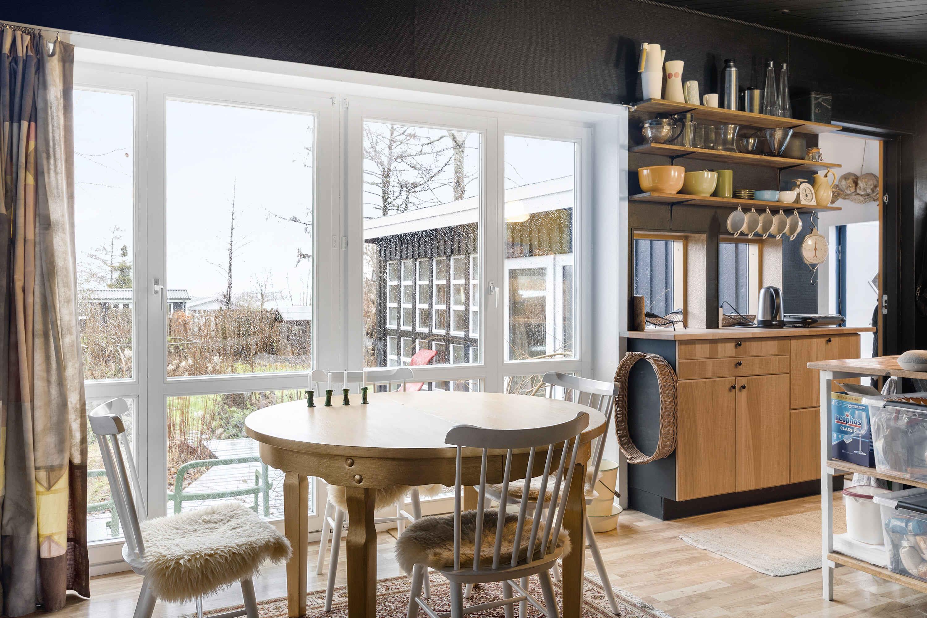 Hyggeligt sortmalet hus med fin plads til fire på to små værelser. Dejligt køkken/alrum med brændeovn og stort vinduesparti ud mod den frodige have, træterrassen ved en lille sø og kig til Holbæk Fjord. I kommer ind via gårdhaven og gennem havestuen.