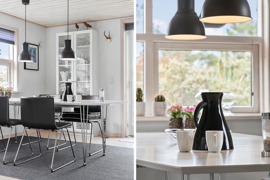 Indenfor mødes du af et lyst og hyggeligt indrettet opholdsrum, hvor køkken og stue ligger i åben forbindelse. Det giver en dejlig fornemmelse af nærvær, uanset om du er i gang med madlavningen eller slapper af i sofaen. I stuen sørger brændeovnen for, at hyggen kan brede sig på kølige dage, mens store vinduer inviterer naturen helt ind og giver dig et smukt kig til klitterne udenfor. Indretningen er enkel, varm og hjemlig – et sted, hvor man straks føler, at tempoet falder, og ferien kan begynde.