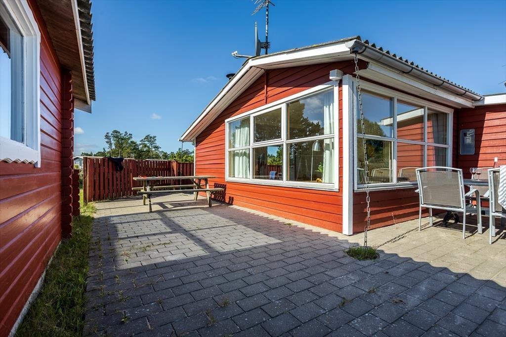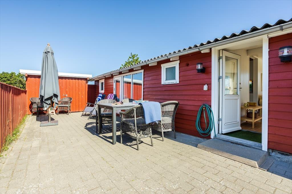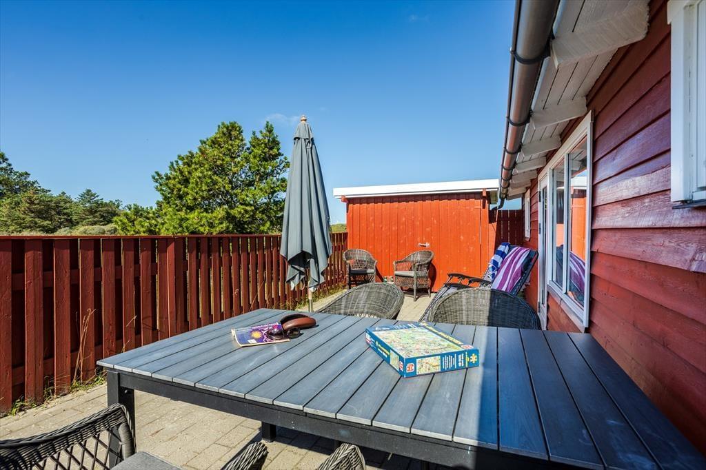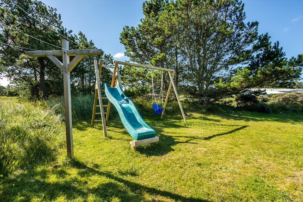 En dejlig terrasse breder sig omkring huset, så I kan vælge netop det sted, hvor solen og vinden leger bedst. Hvis I foretrækker skygge, kan parasollen slås op, og I kan sidde godt til rette i havestolene, mens I tænker over, hvad I har lyst til at grille til aften. Til børnene er der en sandkasse og et legetårn med gynge og rutsjebane, og på græsplænen er der masser af plads til leg og udendørs spil.
