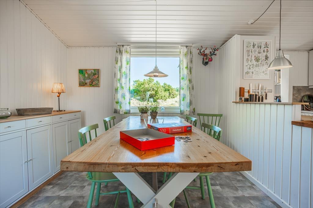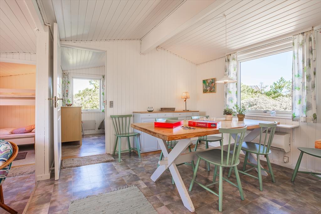 Selvom den nordjyske natur lokker med sine skønheder, er det fristende at blive hjemme i husets hyggelige rammer. Forestil jer at have al den tid i verden til at læse, løse puslespil, strikke og se film; det er hvad stuen og køkken-alrummet indbyder til. Her er der et spisebord, en brændeovn og to sofaarrangementer, der indbyder til at tage feriedagene i et behageligt tempo. Midt i det hele findes et køkken, udstyret med alt det nødvendige for at lave lækker mad. Et brusebadeværelse og to soveværelser fuldender indretningen, og i annekset er der yderligere sovepladser til dem, der foretrækker det.