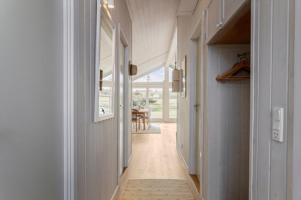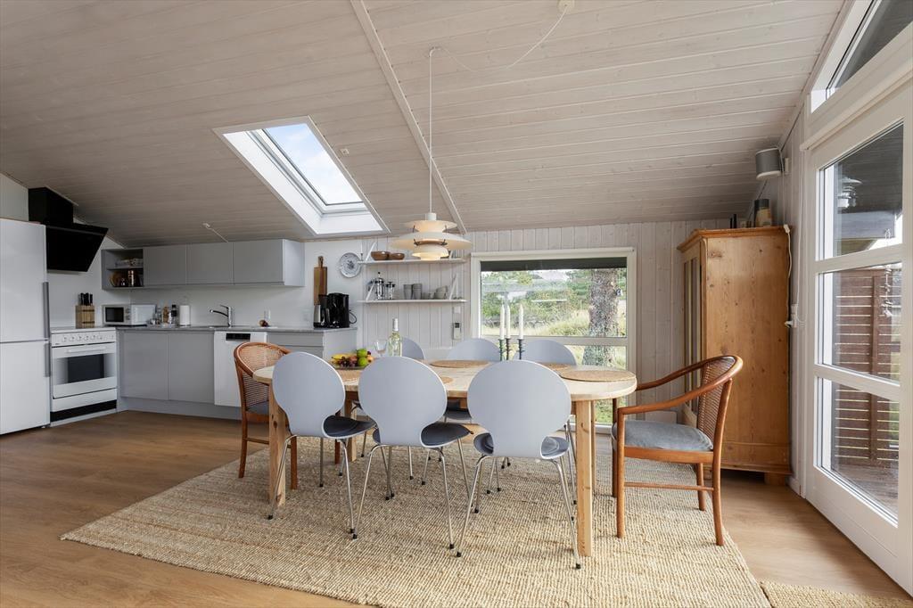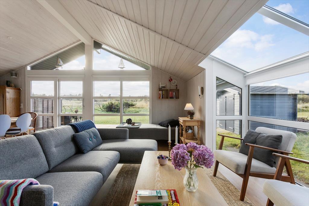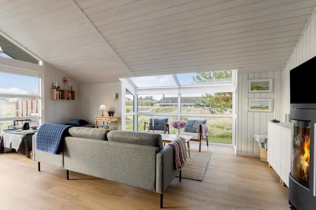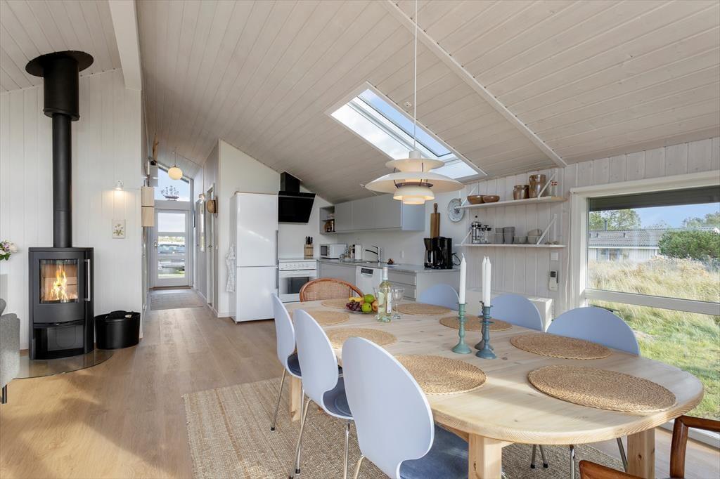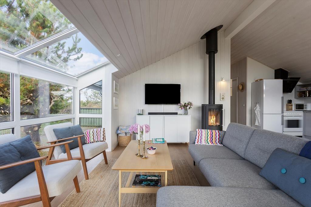Når I træder indenfor i huset, bliver I mødt af en lys og indbydende atmosfære. Loftet til kip og de store vinduespartier får rummet til at virke luftigt og åbent, mens naturen udenfor danner et smukt bagtæppe for jeres ferieliv. Her er plads til at sænke skuldrene, finde en god bog frem eller blot nyde stilheden, der kun brydes af fuglefløjt og vindens susen i trætoppene. Brændeovnen er husets naturlige samlingspunkt – især på kølige dage, hvor flammernes knitren og varmen spreder den helt særlige sommerhusstemning, man kun finder ved Vesterhavet. Indretningen er både enkel og funktionel med fokus på komfort og et allergivenligt miljø, der gør det nemt at slappe helt af.