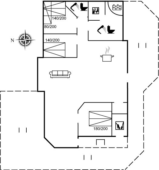 Der er i alt 3 soveværelser. Sovepladserne fordeler sig på: 6 sovepladser i dobbeltsenge.1 soveplads i køjeseng. Derudover er der 1 stk. barneseng.