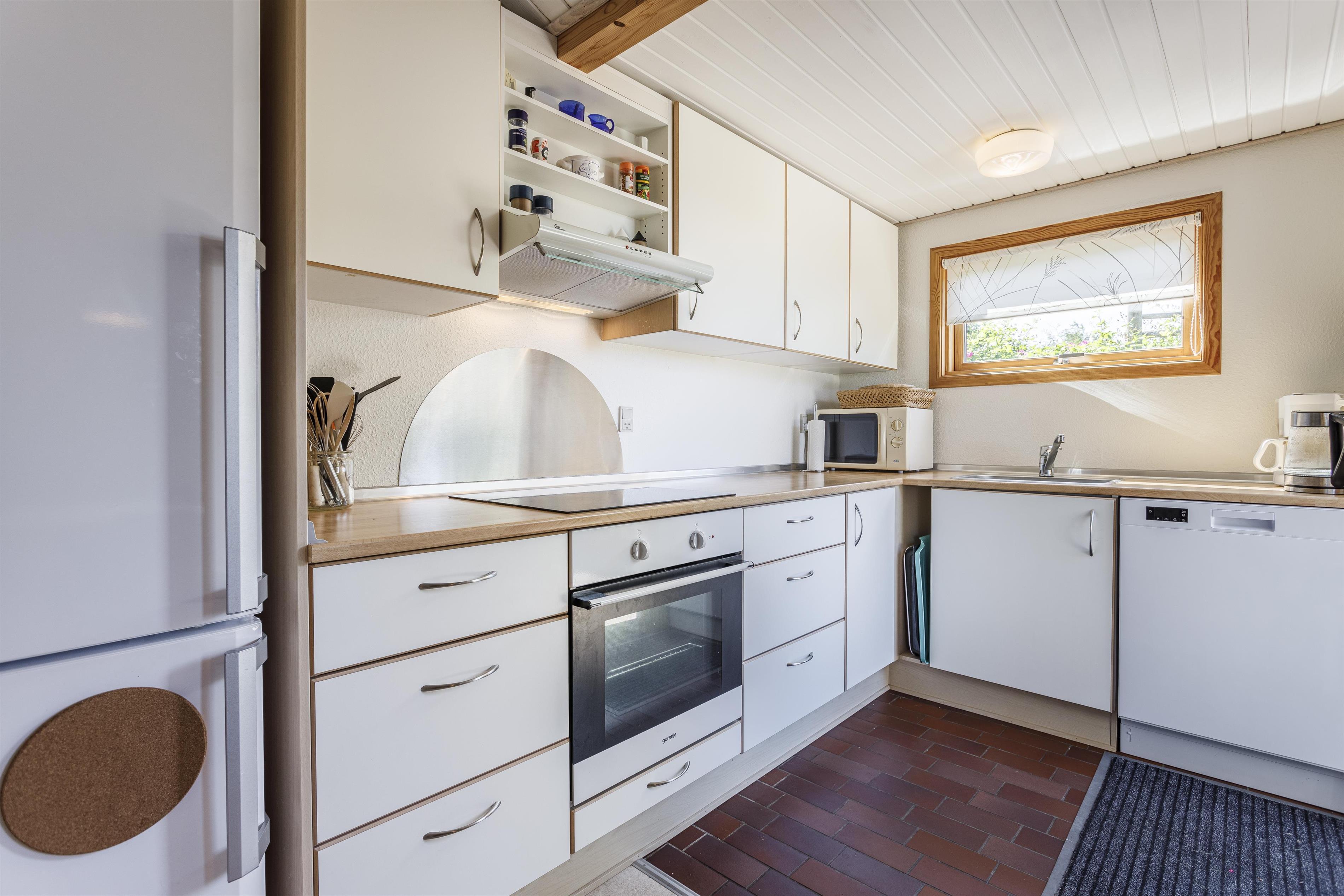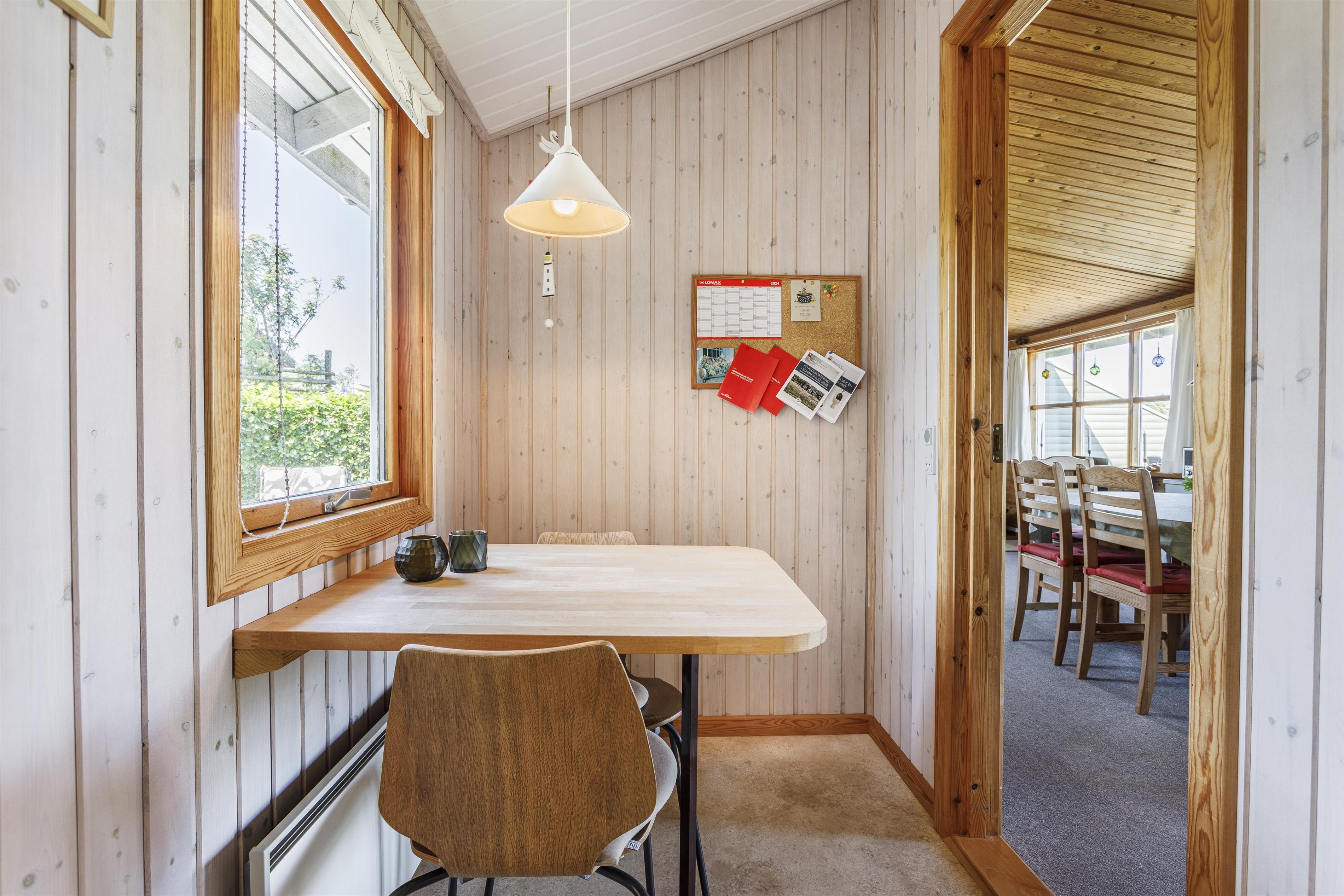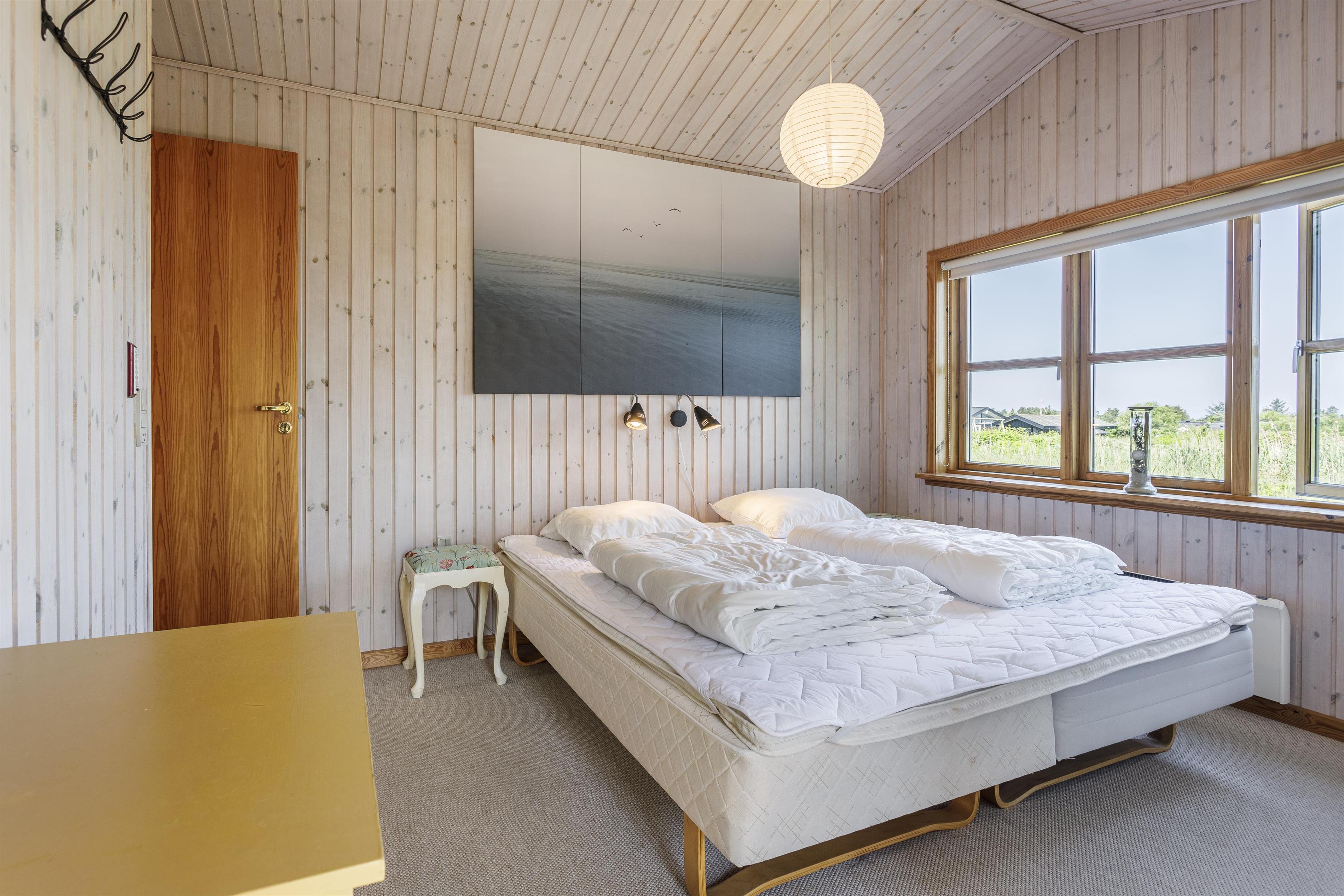 Dette feriehus emmer af hygge og byder jer indenfor til en stemningsfuld atmosfære, hvor I straks føler jer hjemme. Det veludstyrede køkken har en lille siddeplads, perfekt til en kop morgenkaffe, mens den åbne spiseplads og opholdsstue indbyder til fællesskab og nærvær. Her finder I også en brændeovn, som skaber varme og hygge på kølige aftener. Både sommer og vinter har I den skønneste udsigt ud over det bakkede klitlandskab og havet, og inde som ude er der tænkt over at skabe hyggelige kroge, hvor man kan slappe af og nyde udsigten i ro og mag. Derudover er huset indrettet med to gode soverum og et rummeligt badeværelse med bruseniche.