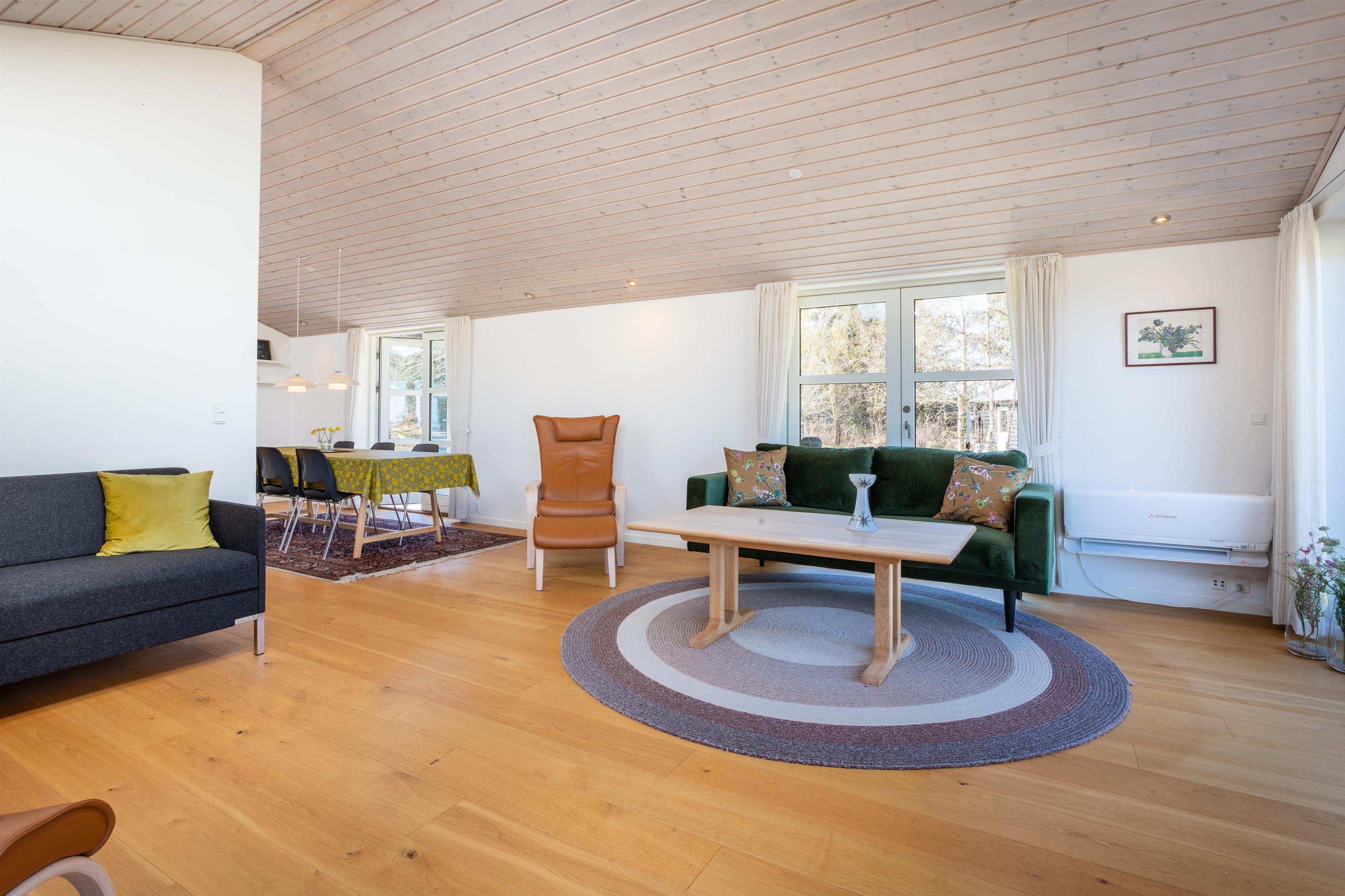 Når I træder indenfor, bliver I mødt af et lyst og indbydende køkken/alrum, der er udstyret med et praktisk gaskomfur og ligger i åben forbindelse med spisepladsen og den rummelige stue. Med højt til loftet og store vinduespartier trækkes både lys og natur ind i huset og skaber en harmonisk atmosfære. Feriehuset er meget velholdt og funktionelt indrettet med fokus på både komfort og æstetik.
