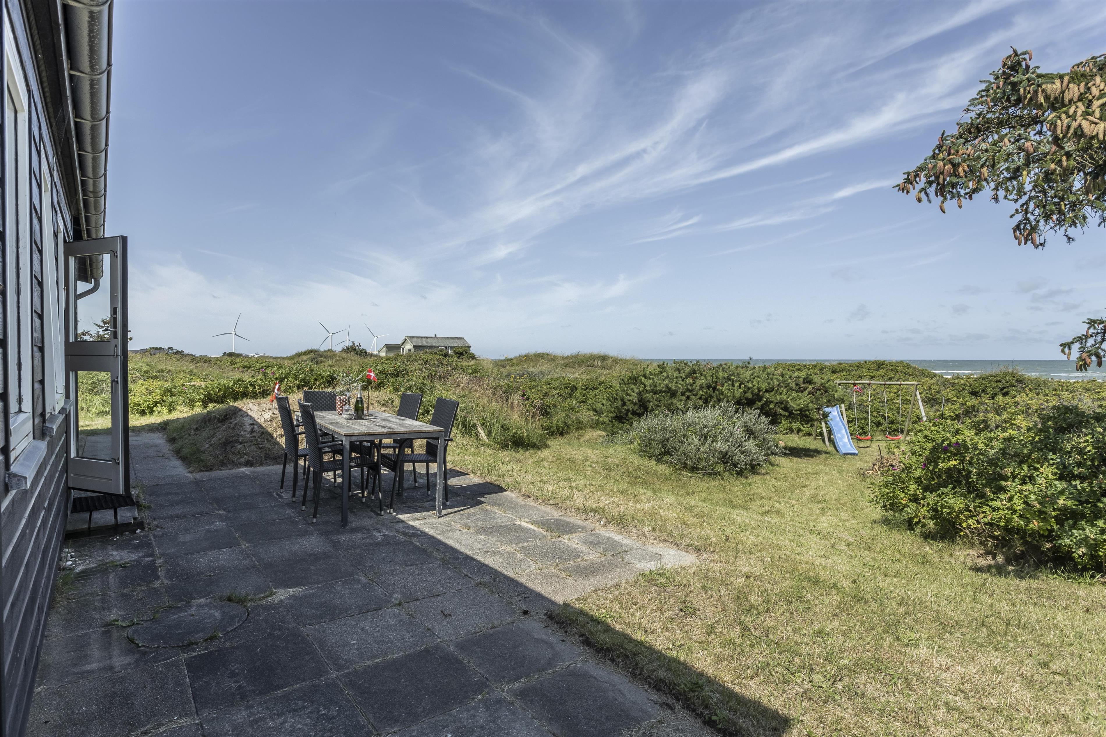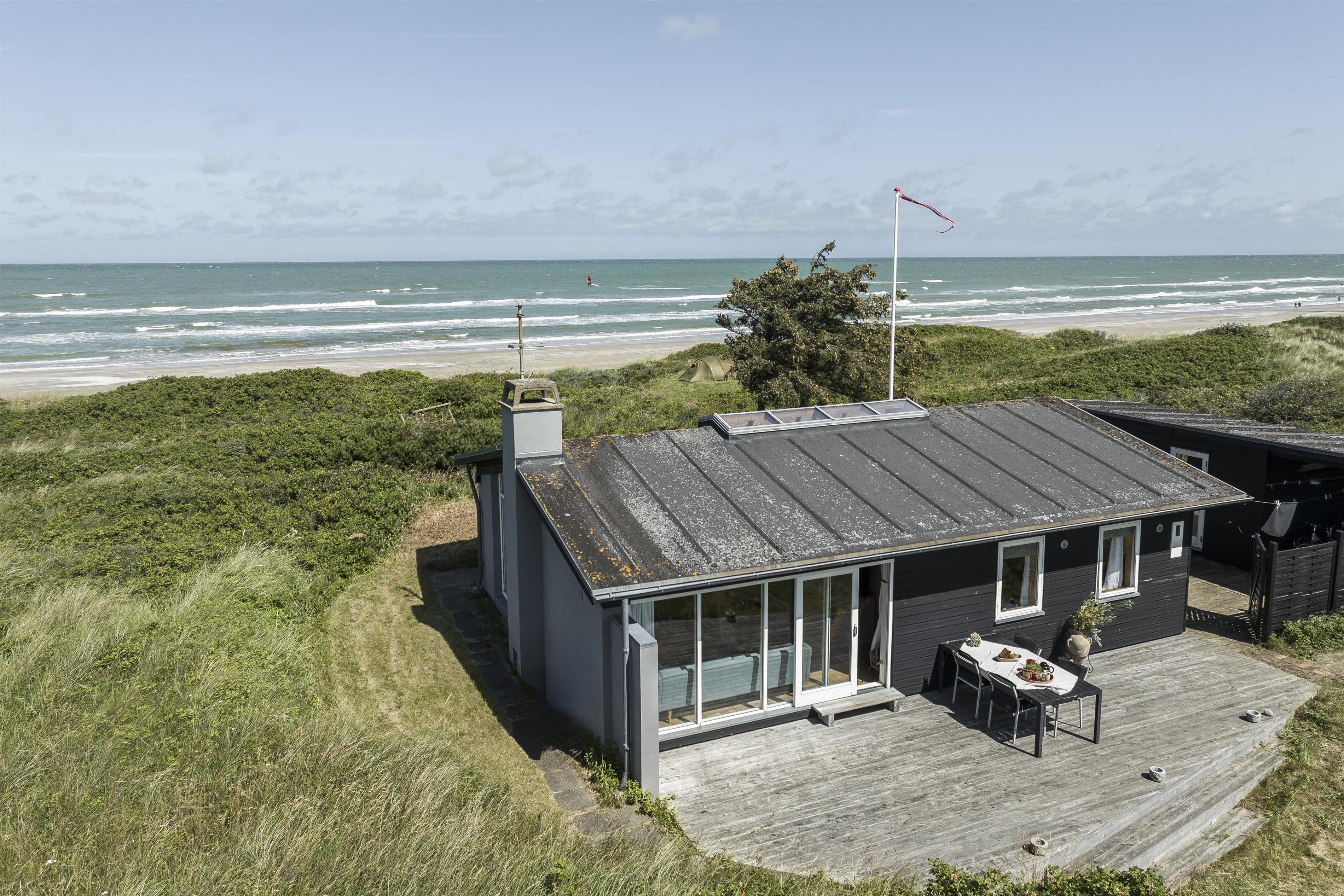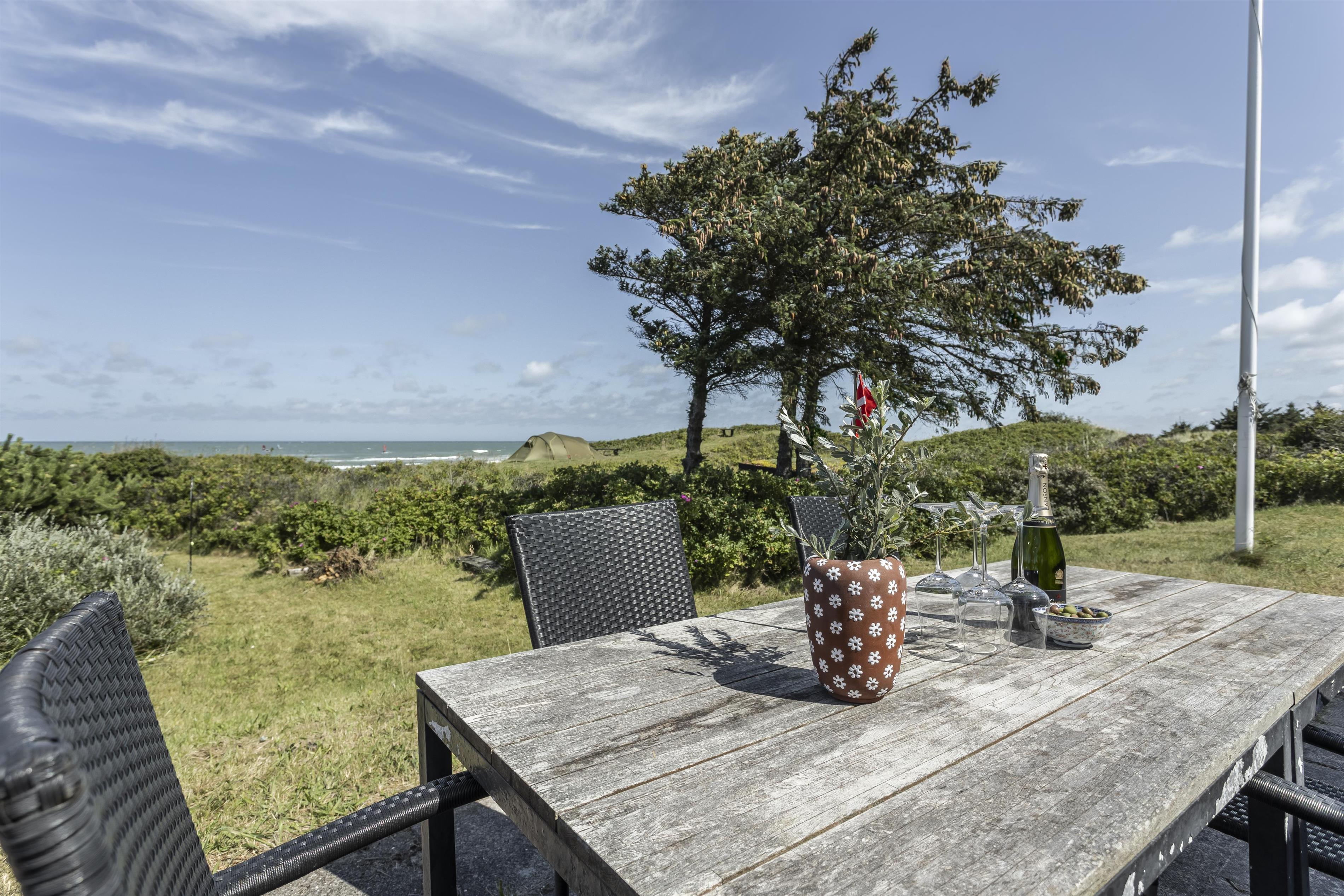 Sommerhuset ligger midt i dejlig natur i Kjul og med en betagende havudsigt fra det meste af huset. Udenfor venter flere terrasser og en hyggelig gårdhave, hvor I kan finde læ og nyde solen hele dagen alt efter vind og vejr. Fra grunden er der direkte adgang til stranden via en sti – perfekt til en morgenløbetur eller en forfriskende dukkert i havet. Oplev en sommeraften på terrassen med solnedgangen over Vesterhavet som baggrund – en uforglemmelig oplevelse.