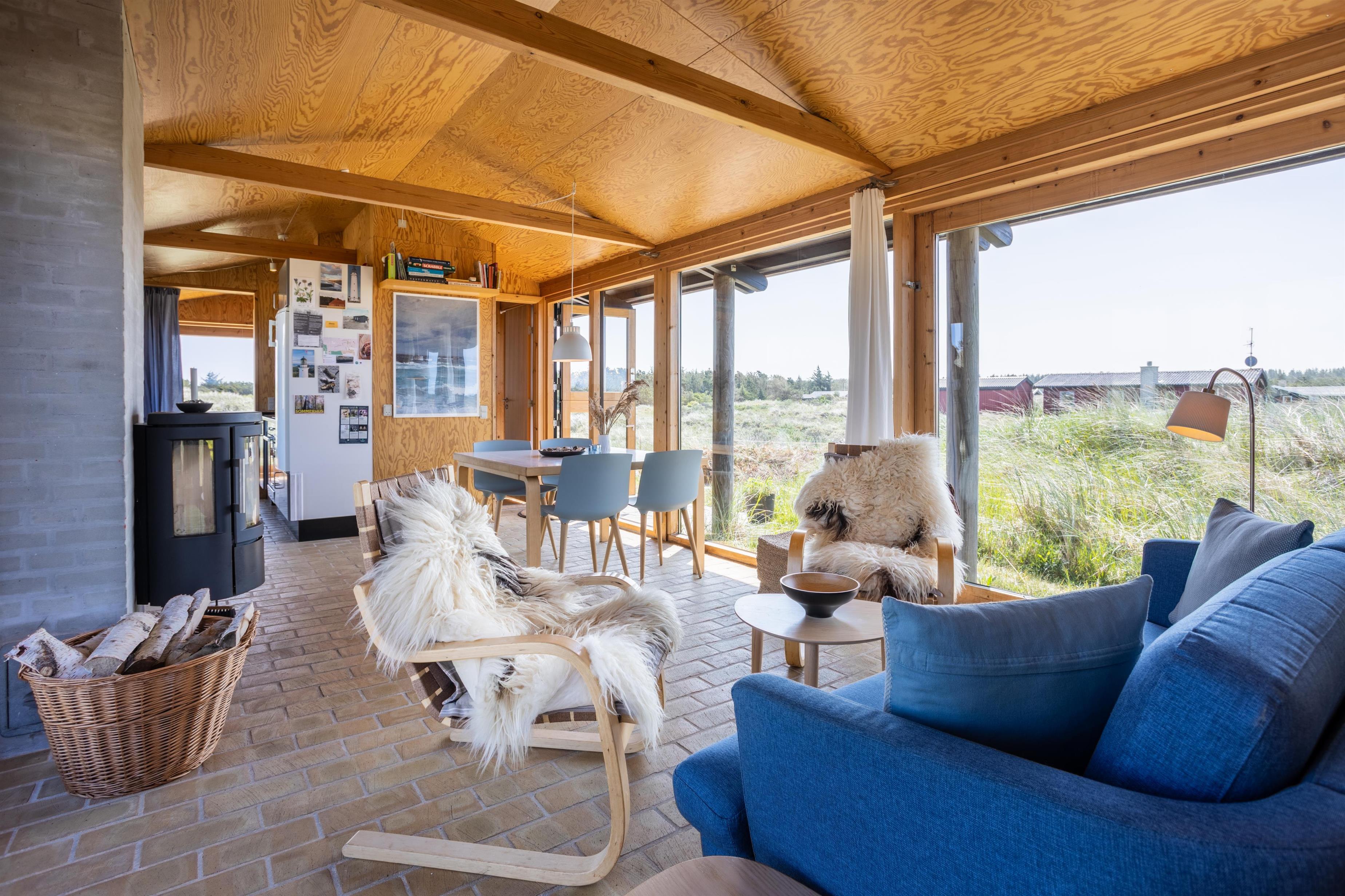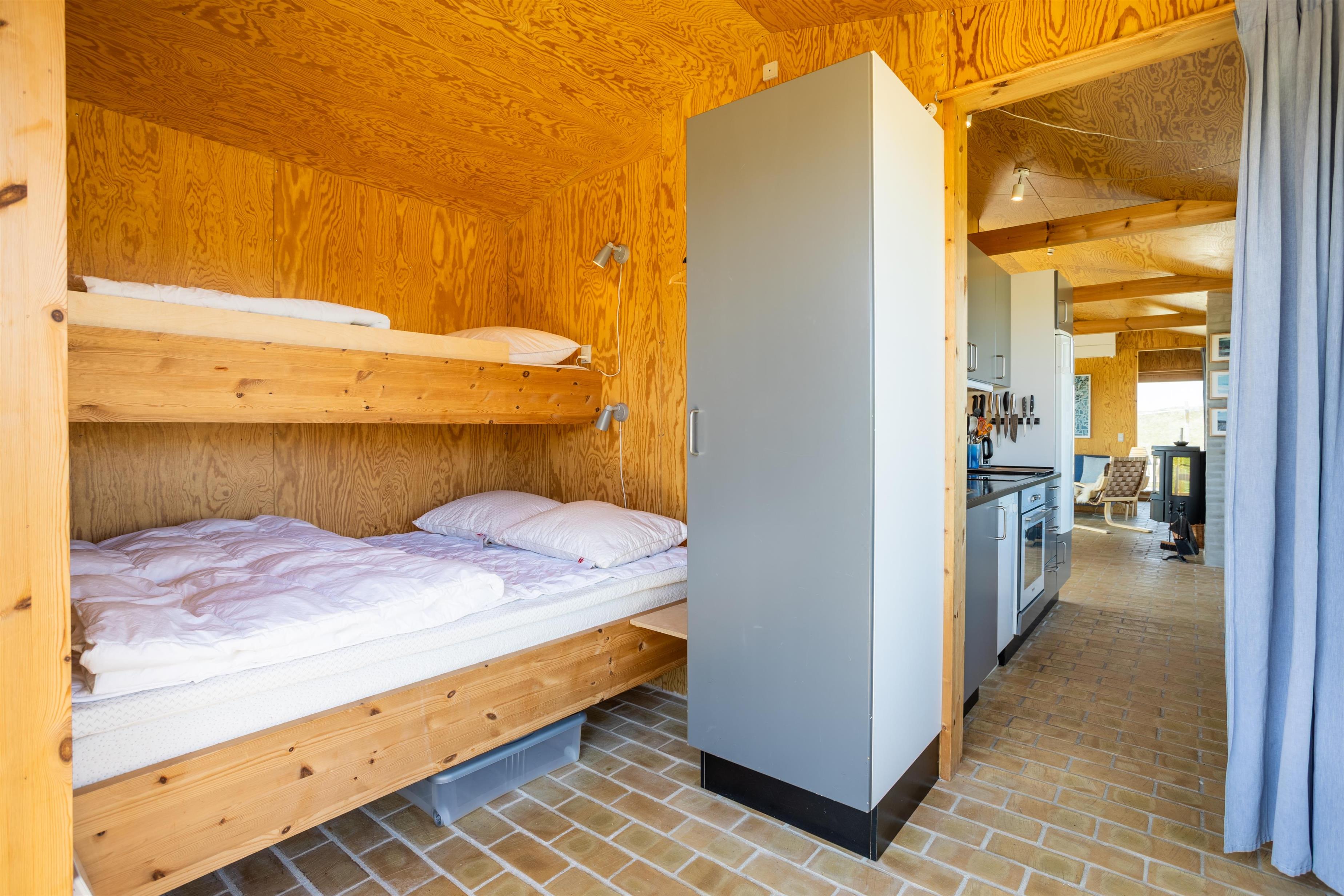 Feriehuset på 50 m² er skabt til at danne rammerne for en uforglemmelig ferie. Med loft til kip, rustikke klinkegulve og en stemningsfuld brændeovn oser huset af charme. De rustikke klinkegulve føres videre ud på de udvendige terrasser, så man får fornemmelsen af at være i et med naturen, selvom man færdes inde i huset. De store vinduespartier i alle rum lukker både lys og natur ind i huset og skaber en helt særlig stemning. Det åbne opholdsrum med stue, spiseplads og funktionelt køkken er hjertet i huset, mens to hyggelige soverum sikrer plads til afslapning for op til 5 personer. Det ene soverum har en dobbeltseng, og det andet har en dobbeltseng samt enkeltseng arrangeret som køje. Badeværelset er funktionelt med bruseniche og byder på direkte adgang til terrassen – perfekt efter en dag på stranden.