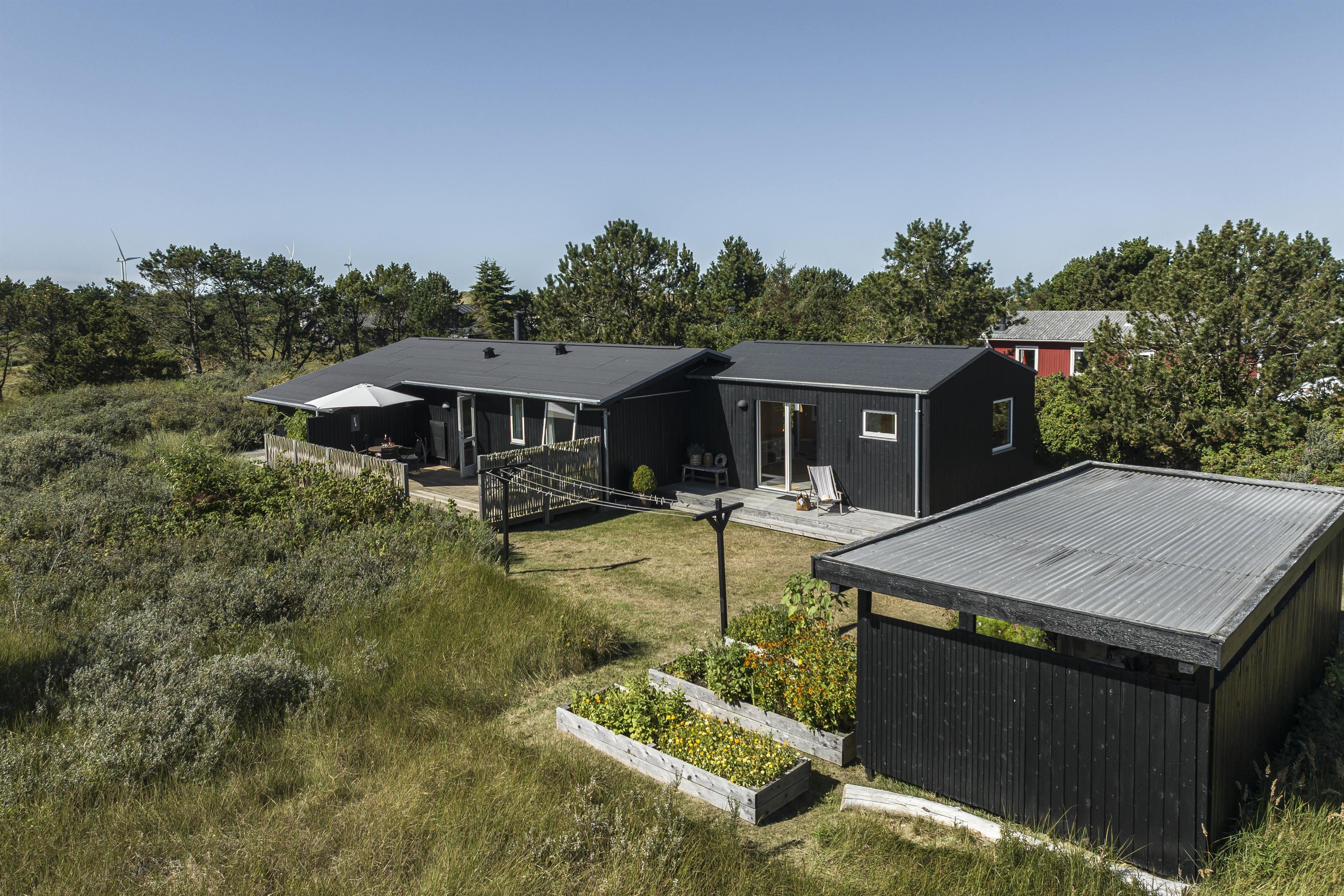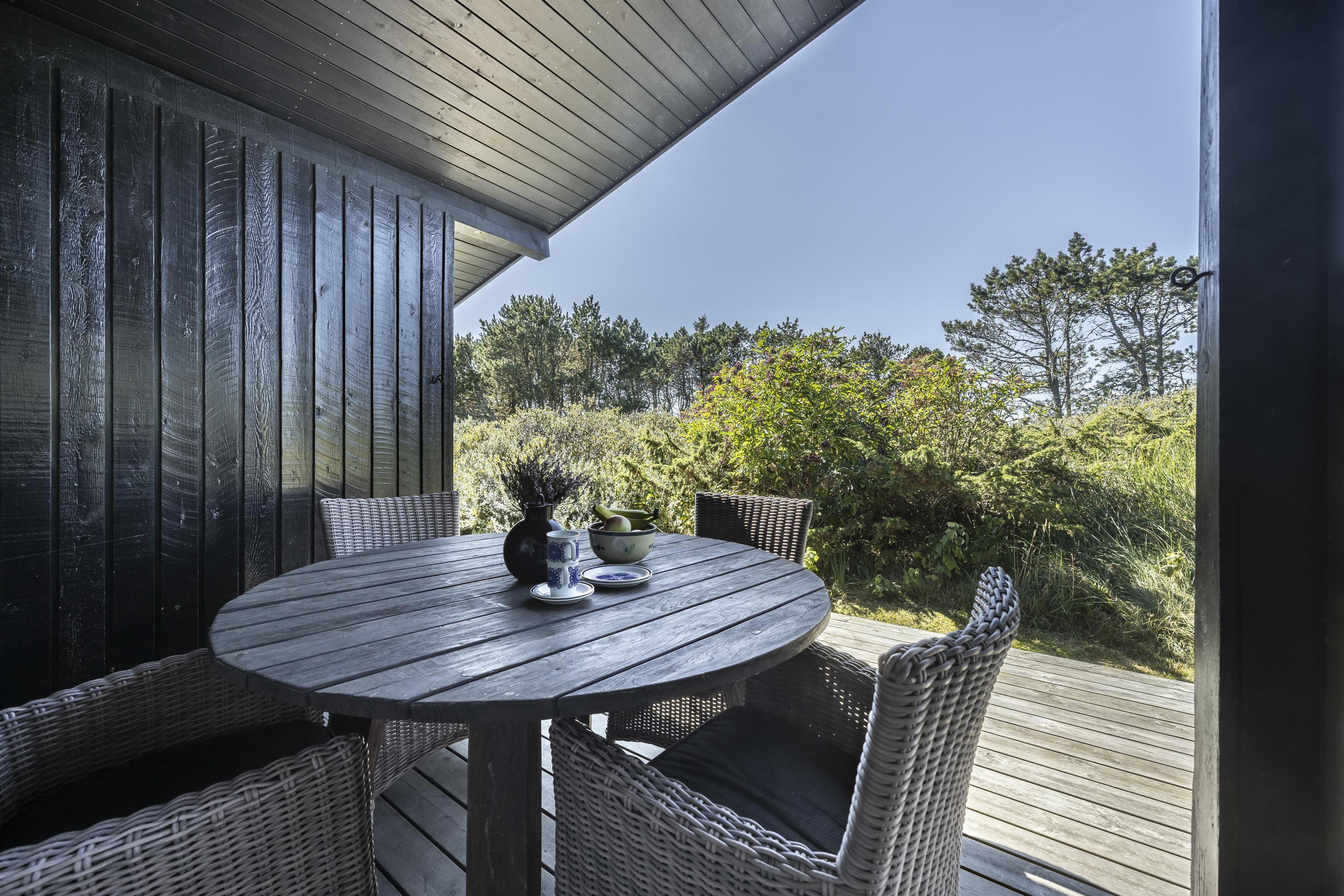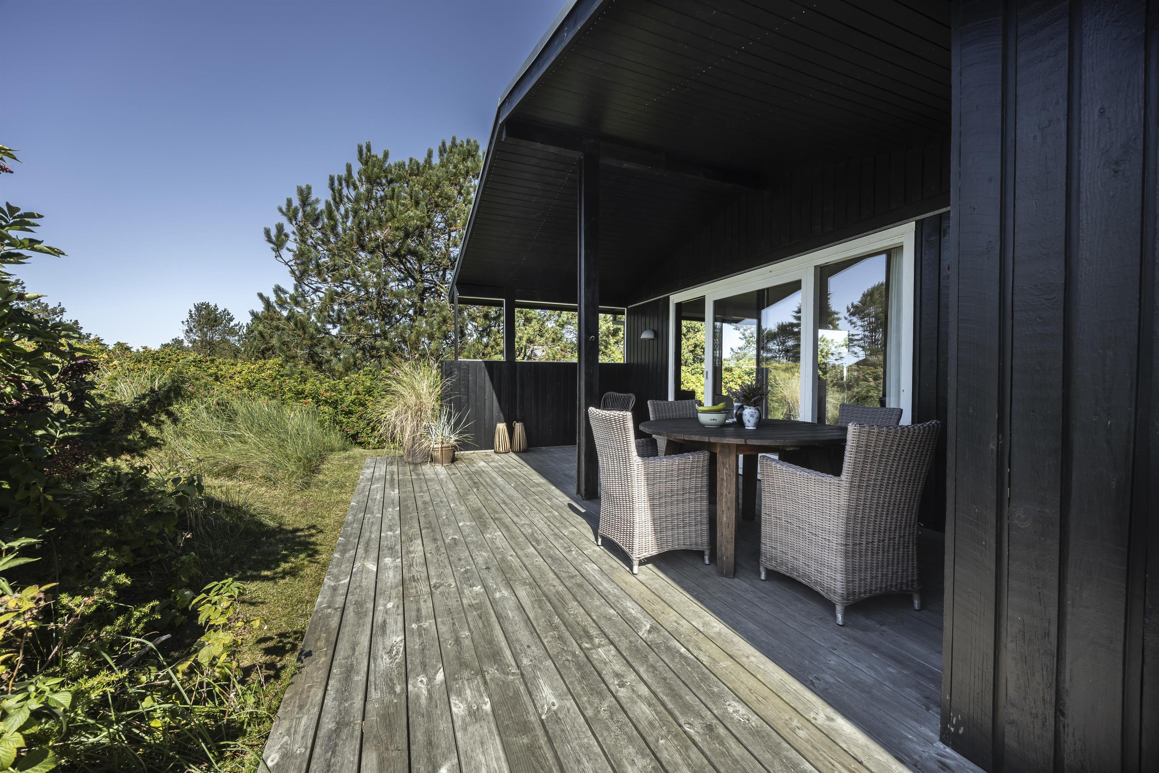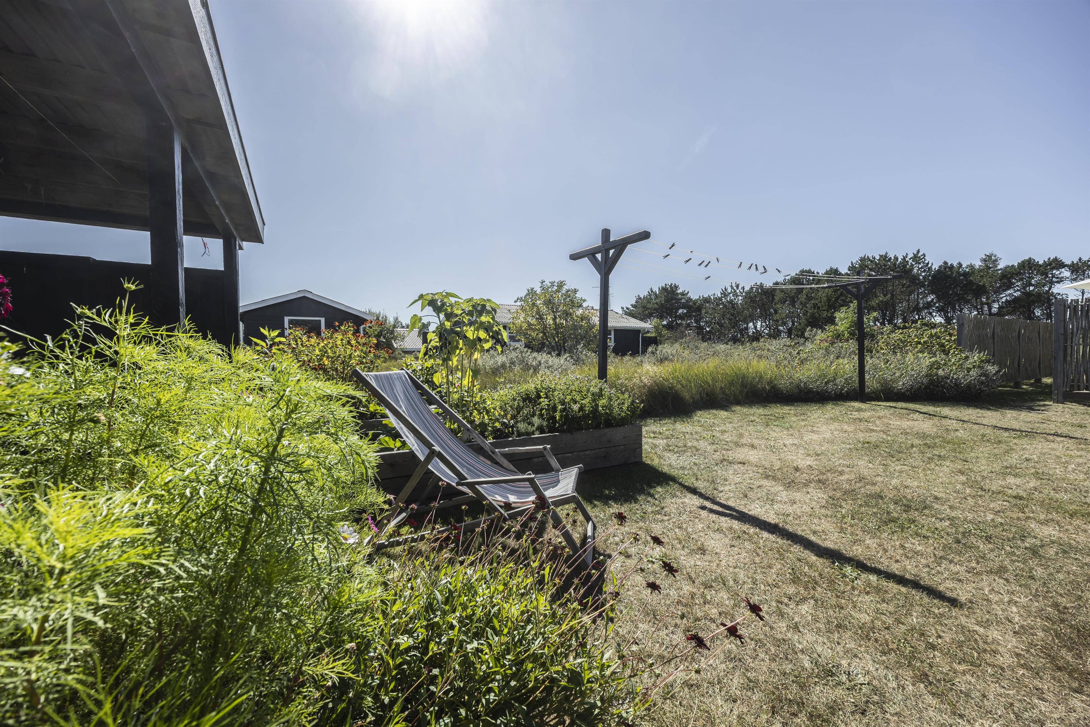 Feriehuset byder på flere skønne terrasser, hvor du altid kan finde læ og sol. På den sydvendte terrasse kan du nyde formiddagssolen, mens den overdækkede terrasse mod vest er perfekt til lange sommeraftener i aftensolens varme stråler – helt ugeneret og med havets brusen som baggrundsmusik. Tag en stille stund på forhøjningen ved huset og oplev den betagende solnedgang over Vesterhavet. I dette fredelige område af Kjul, kommer ofte rådyr og fasaner forbi, som I kan nyde synet af lige udenfor de store vinduespartier i stuen. Uderummet er indrettet med små detaljer, blomster og en lille køkkenhave, som skaber en charmerende atmosfære. Der er desuden carport med plads til cykler.