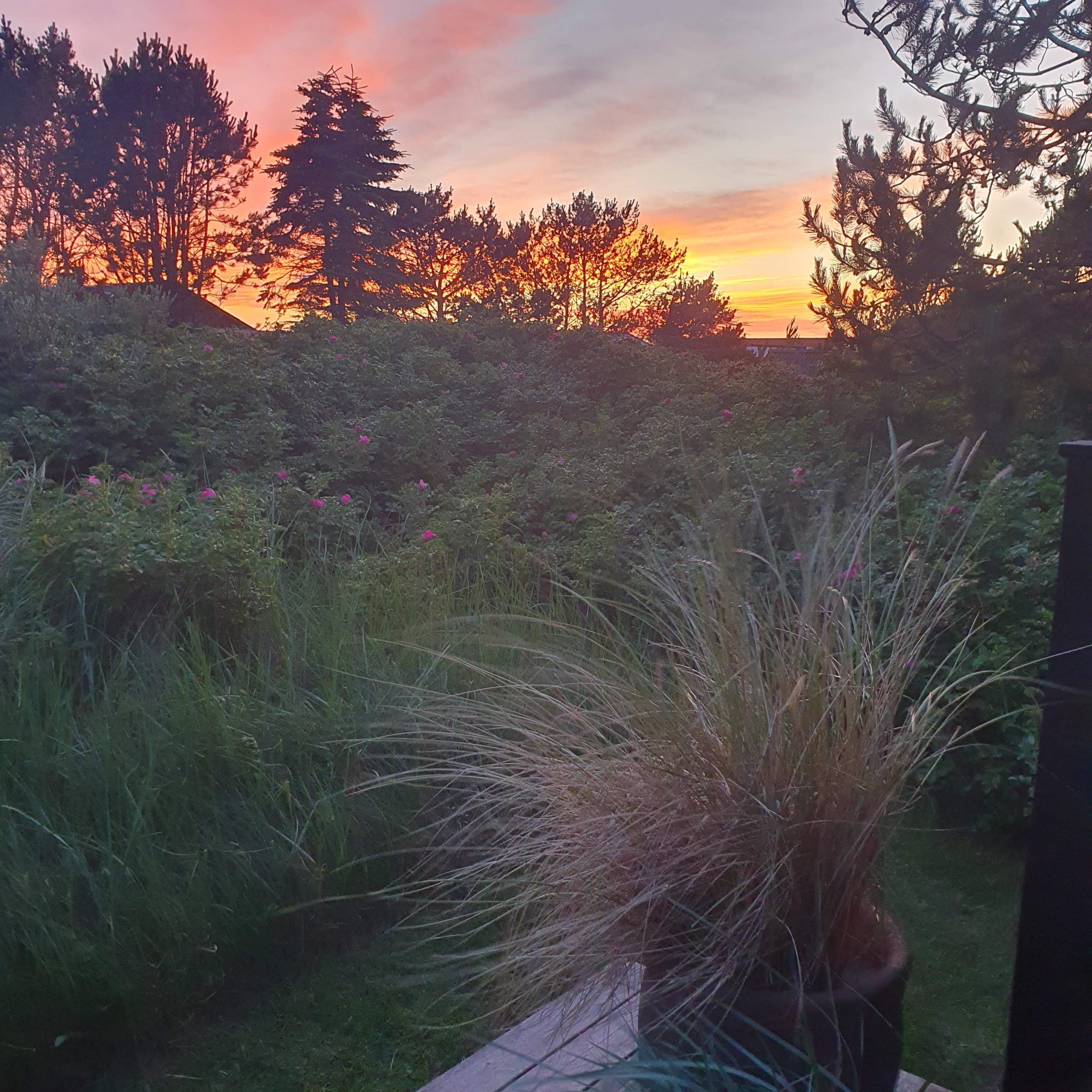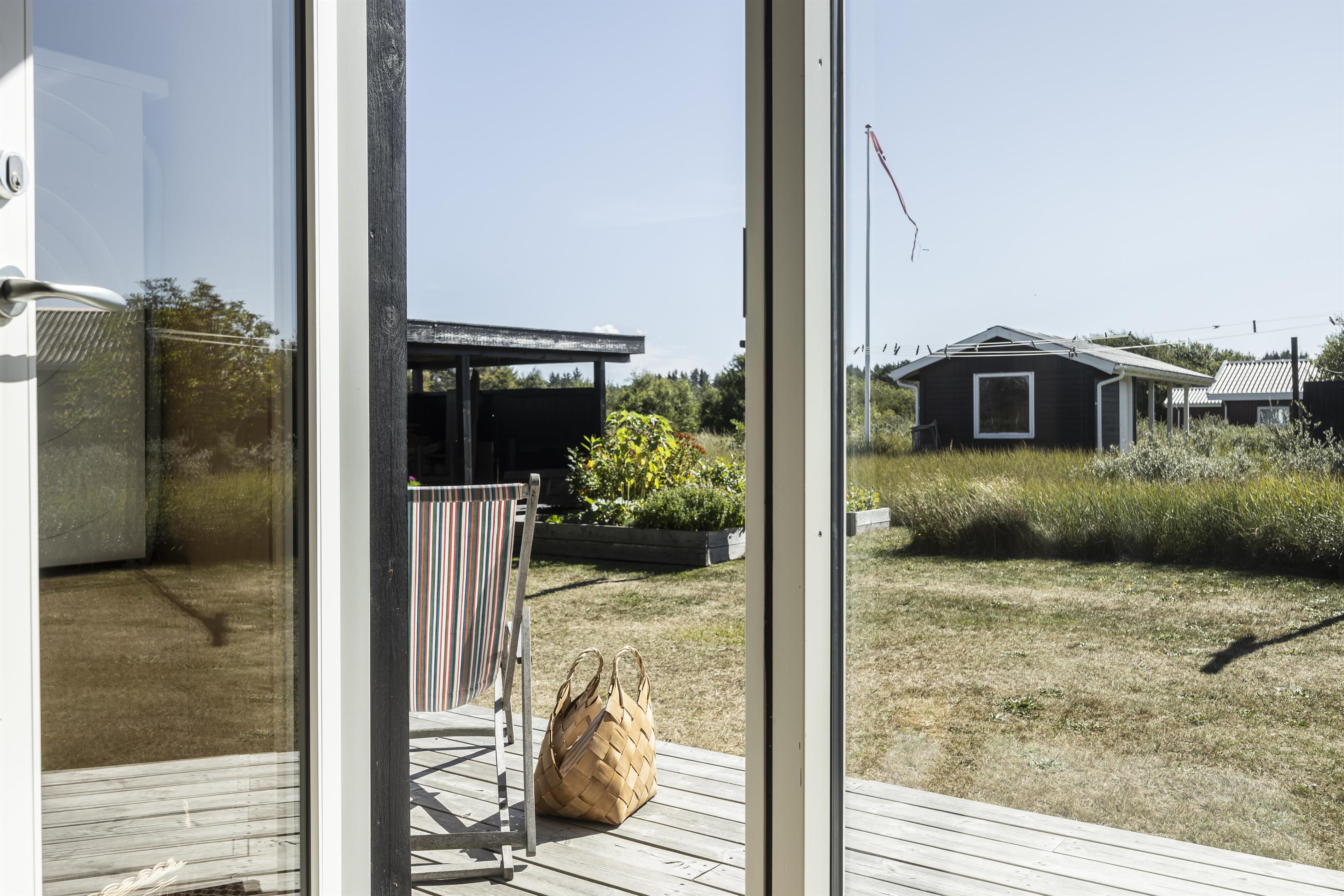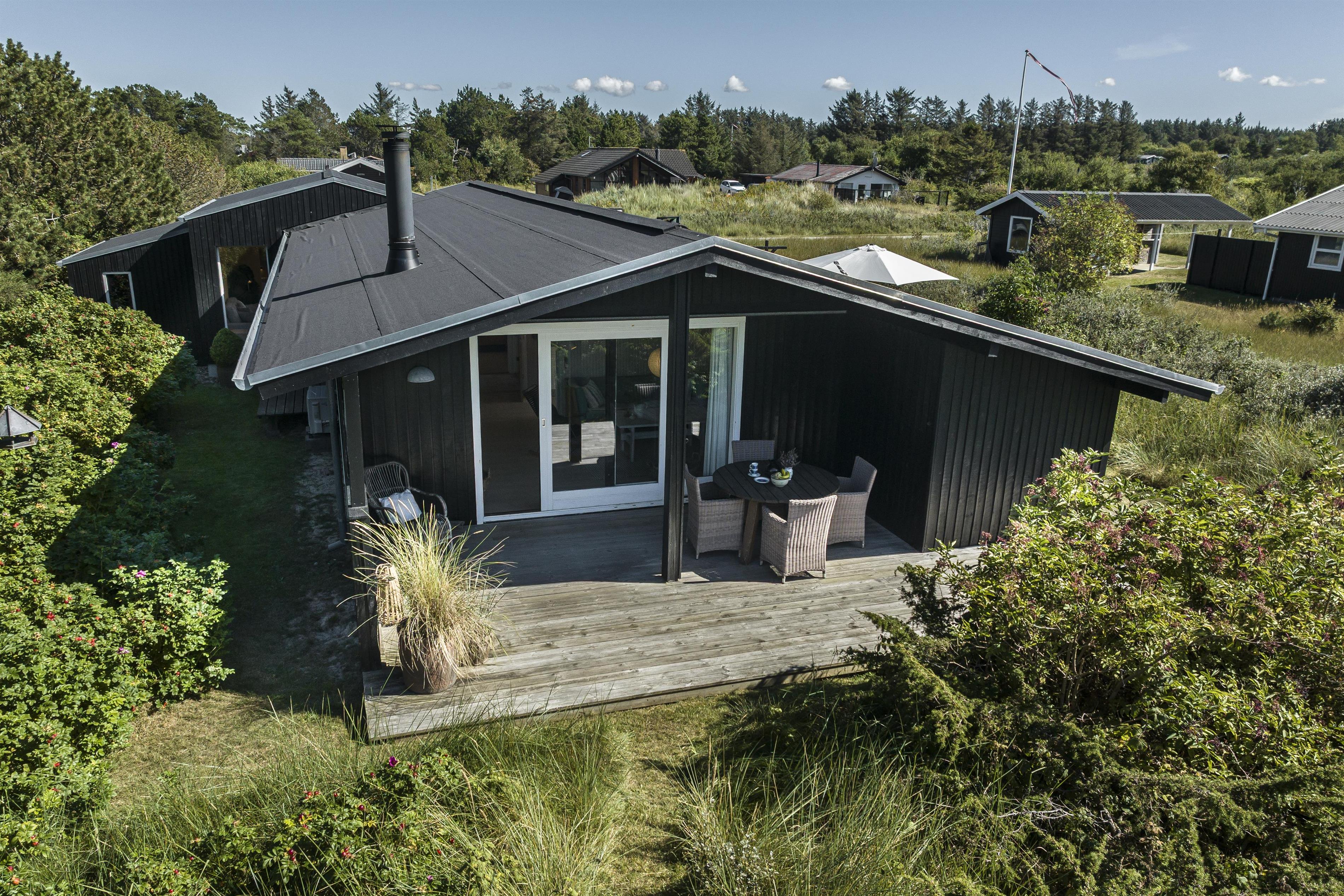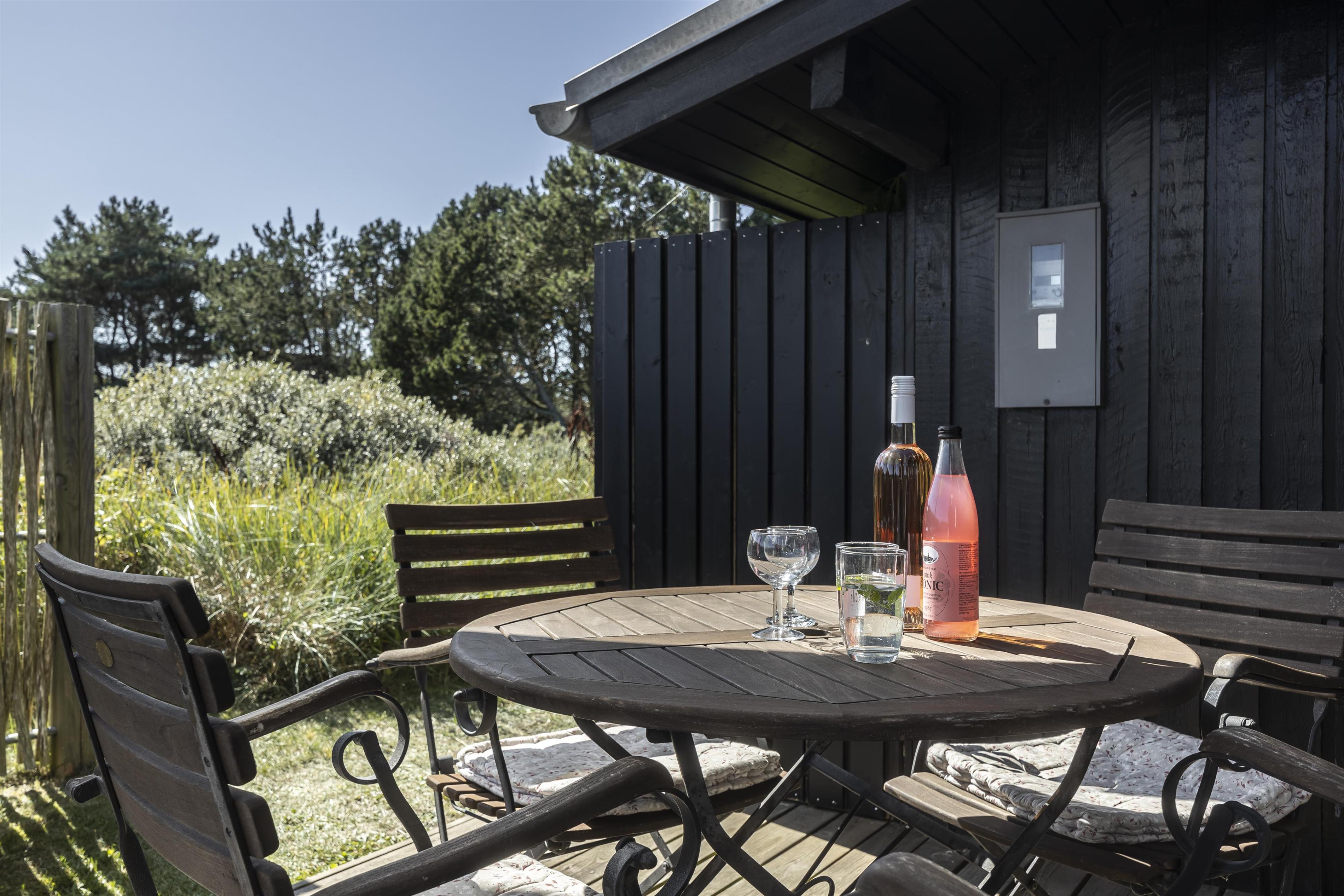 Feriehuset byder på flere skønne terrasser, hvor du altid kan finde læ og sol. På den sydvendte terrasse kan du nyde formiddagssolen, mens den overdækkede terrasse mod vest er perfekt til lange sommeraftener i aftensolens varme stråler – helt ugeneret og med havets brusen som baggrundsmusik. Tag en stille stund på forhøjningen ved huset og oplev den betagende solnedgang over Vesterhavet. I dette fredelige område af Kjul, kommer ofte rådyr og fasaner forbi, som I kan nyde synet af lige udenfor de store vinduespartier i stuen. Uderummet er indrettet med små detaljer, blomster og en lille køkkenhave, som skaber en charmerende atmosfære. Der er desuden carport med plads til cykler.