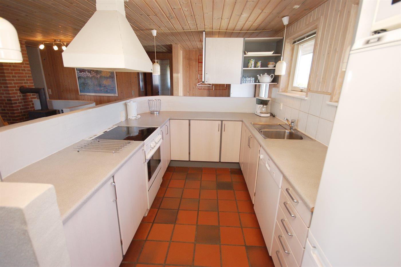 Køkkenet er udstyret med 1 køleskab. Der er 4 elkogeplader, bageovn, mikrobølgeovn samt opvaskemaskine.