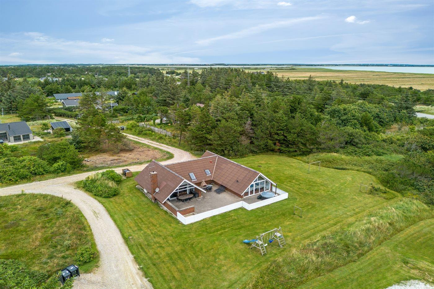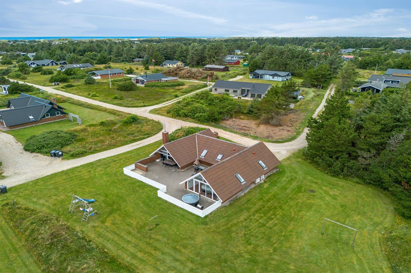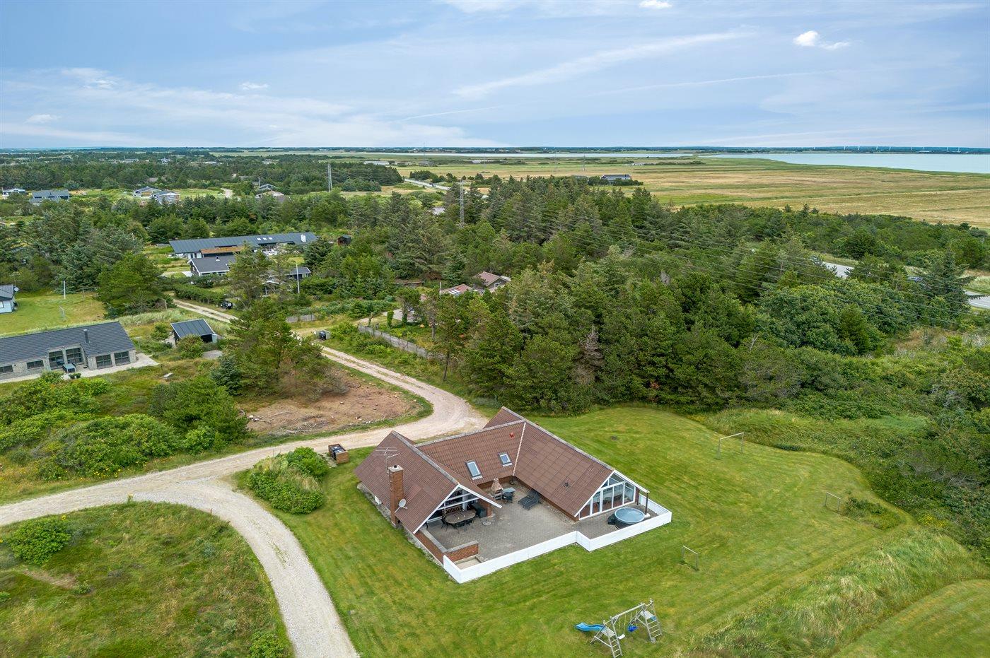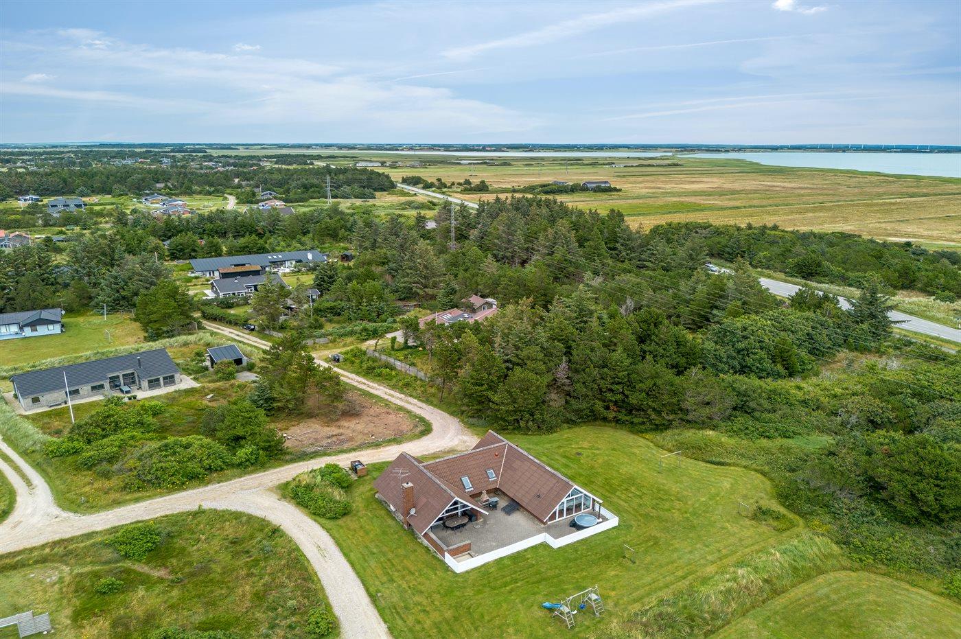 Ferieboligen er beliggende på en 4500 m² stor naturgrund. Der er 900 m til havet. Nærmeste forretning er beliggende i en afstand af 1000 m. Til ferieboligen hører 90 m² terrasseareal. Desuden er der 10 m² overdækket terrasse. Heraf i alt 1 m² lukket terrasse. Gynge. Sandkasse. Der er installeret stik til opladning af elbil. Type 2 stik. Parkering ved ferieboligen.
