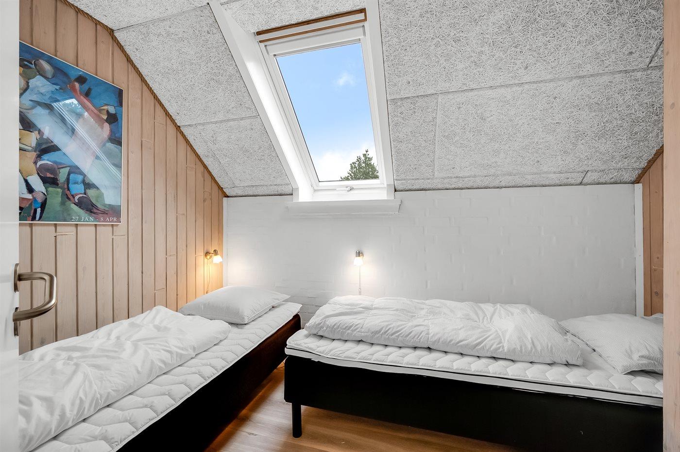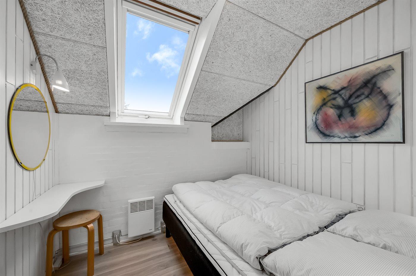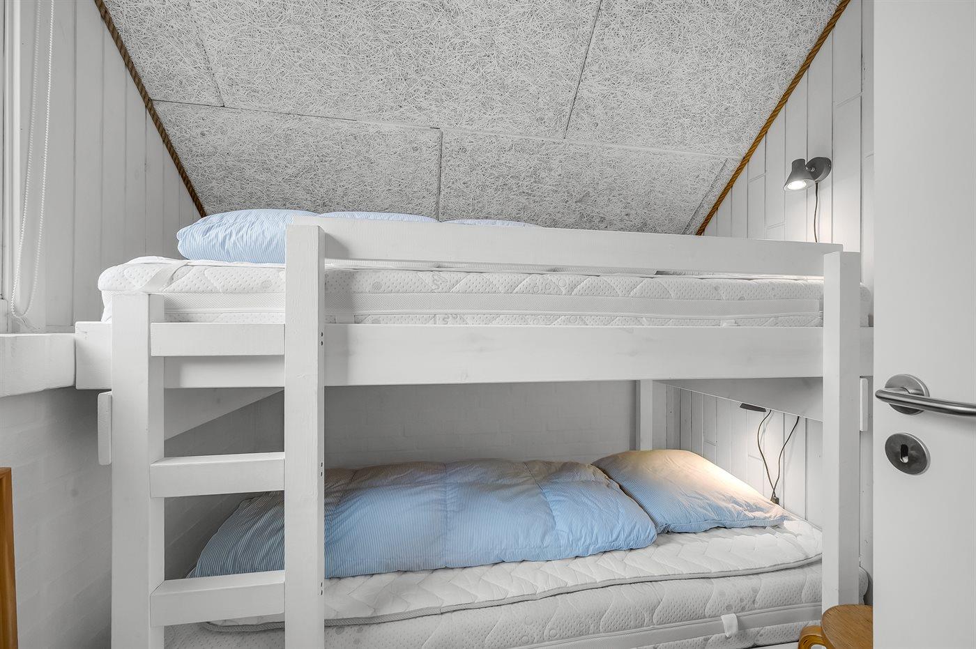 Der er i alt 4 soveværelser. Sovepladserne fordeler sig på: 4 sovepladser i dobbeltsenge. 2 sovepladser i enkeltsenge. 2 sovepladser i køjeseng. Derudover er der 1 stk. barneseng.