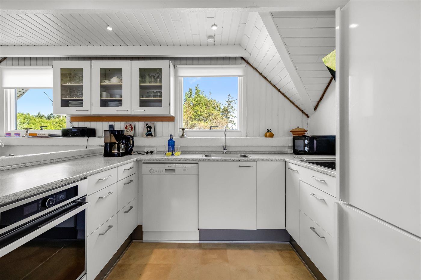 Køkkenet er udstyret med 1 køleskab. Der er 4 keramiske kogeplader, varmluftovn, mikrobølgeovn samt opvaskemaskine.