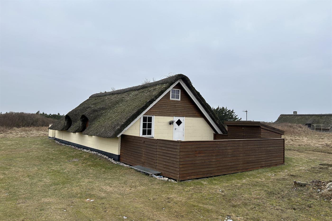 Stråtækt sommerhus med sauna, beliggende på en ca. 2.200 m² stor klitgrund ved Klegod, kun ca. 900 meter fra Vesterhavet. Fra stuen er der direkte udgang til en sydvendt, delvist overdækket terrasse. Derudover findes en afskærmet terrasse mod vest samt en stor, lukket terrasse i husets nordlige ende.