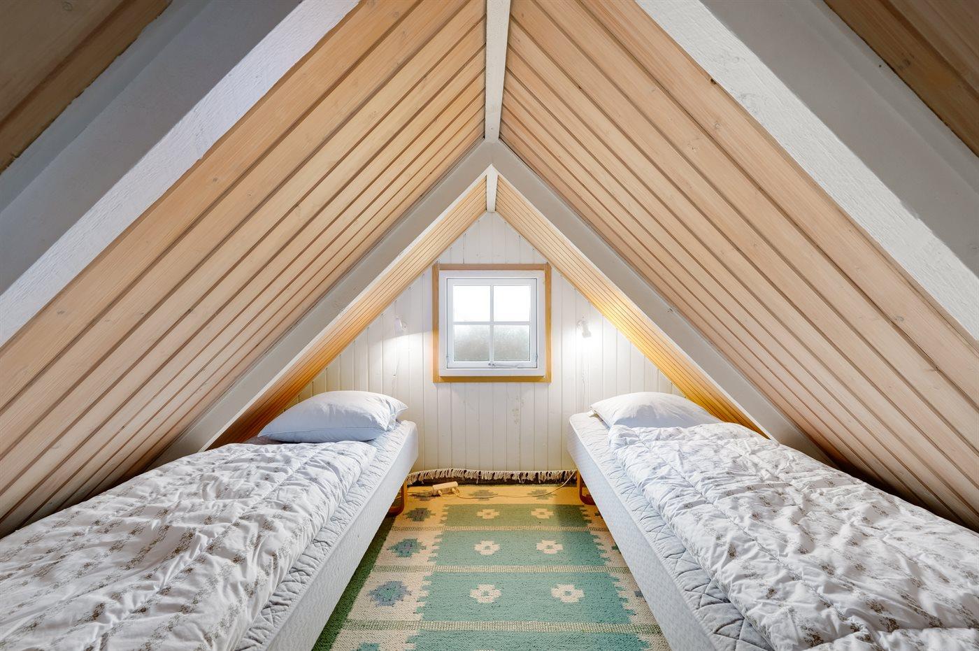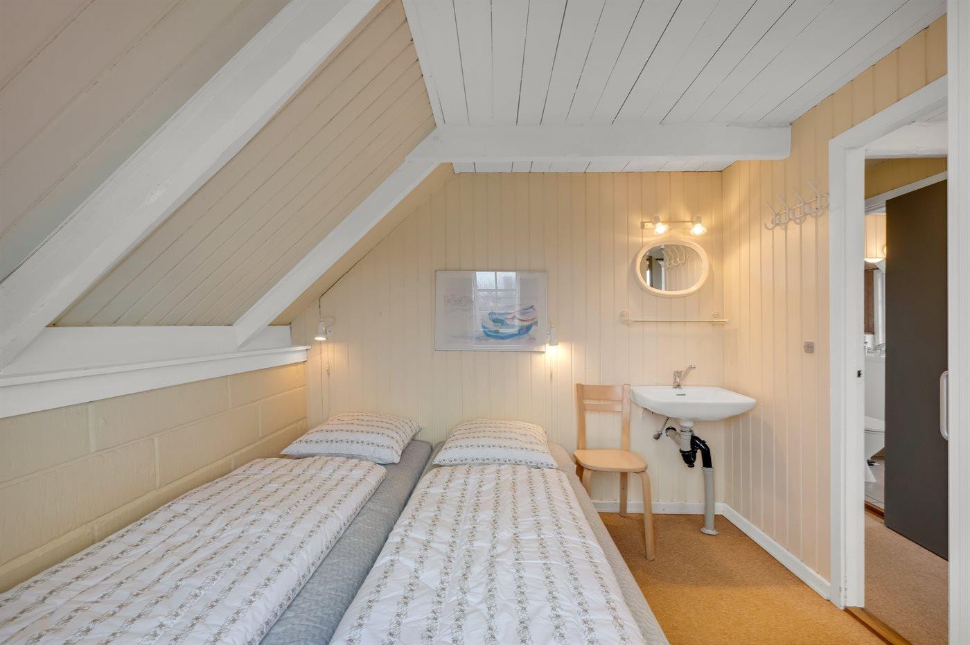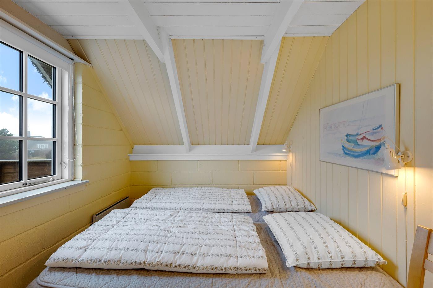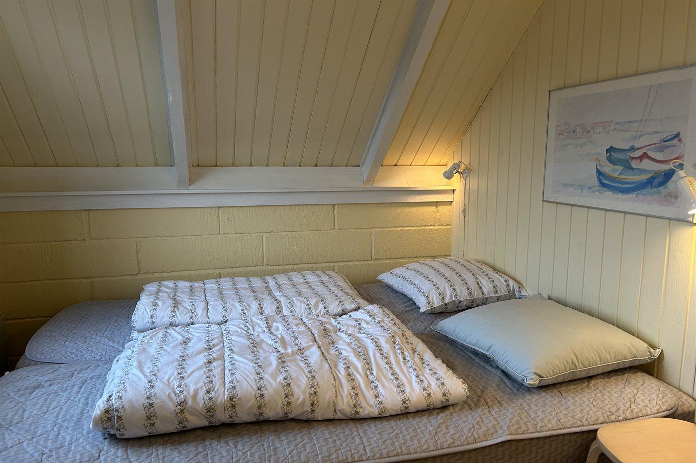 Der er i alt 2 soveværelser. Sovepladserne fordeler sig på: 2 sovepladser i dobbeltseng. 4 sovepladser i enkeltsenge. 2 af disse sovepladser befinder sig på husets hems.