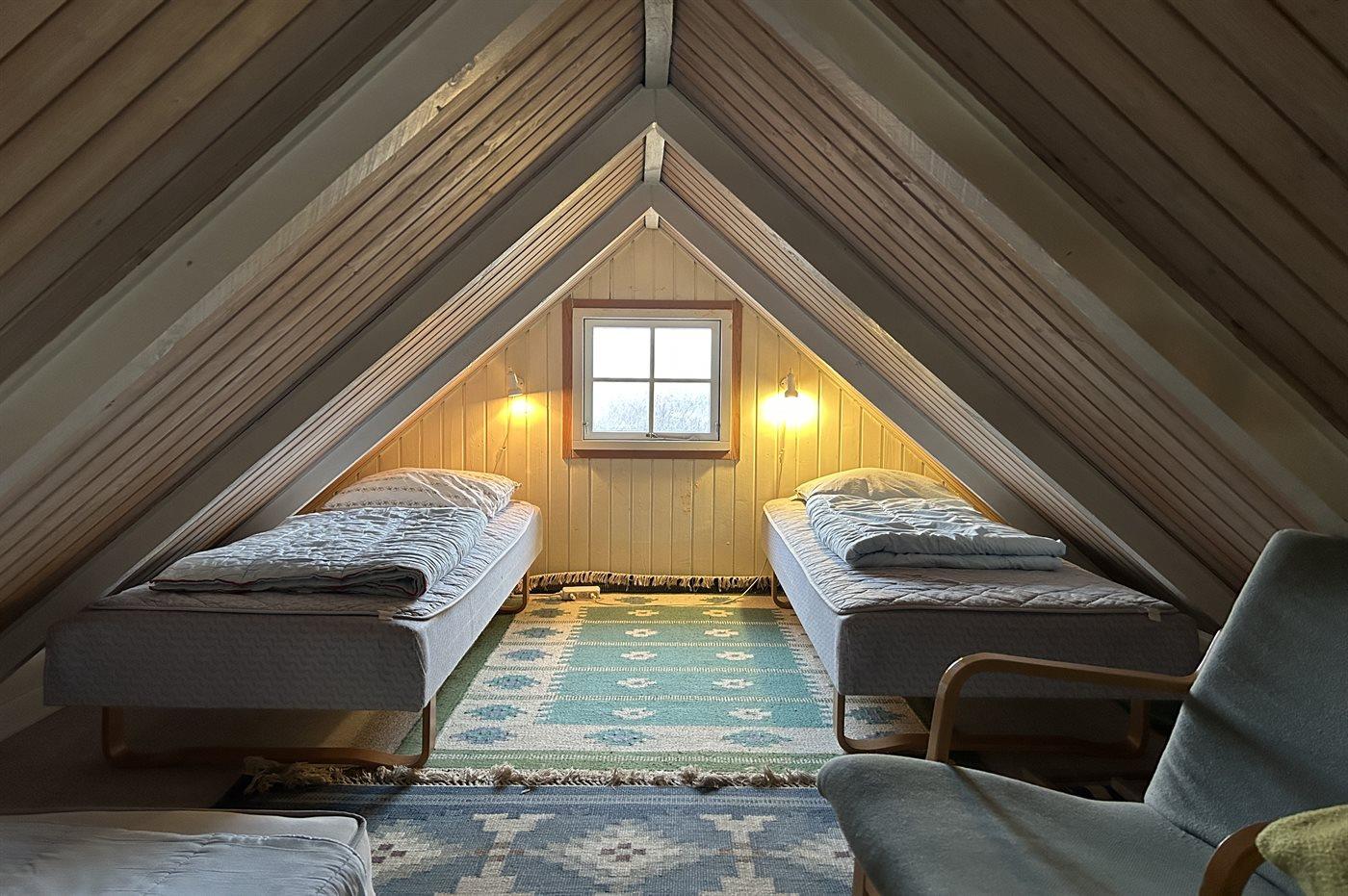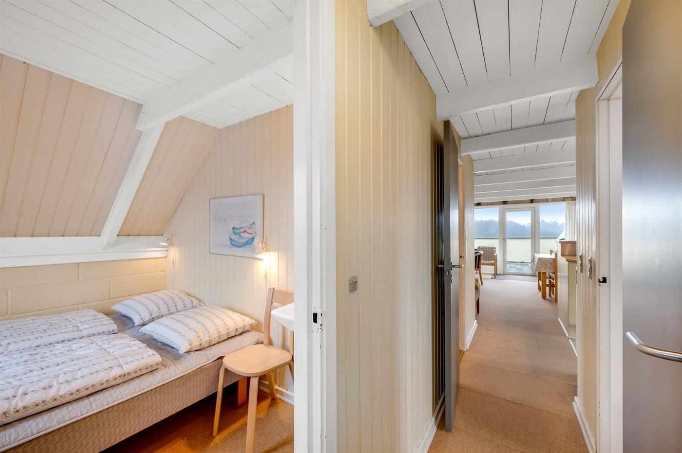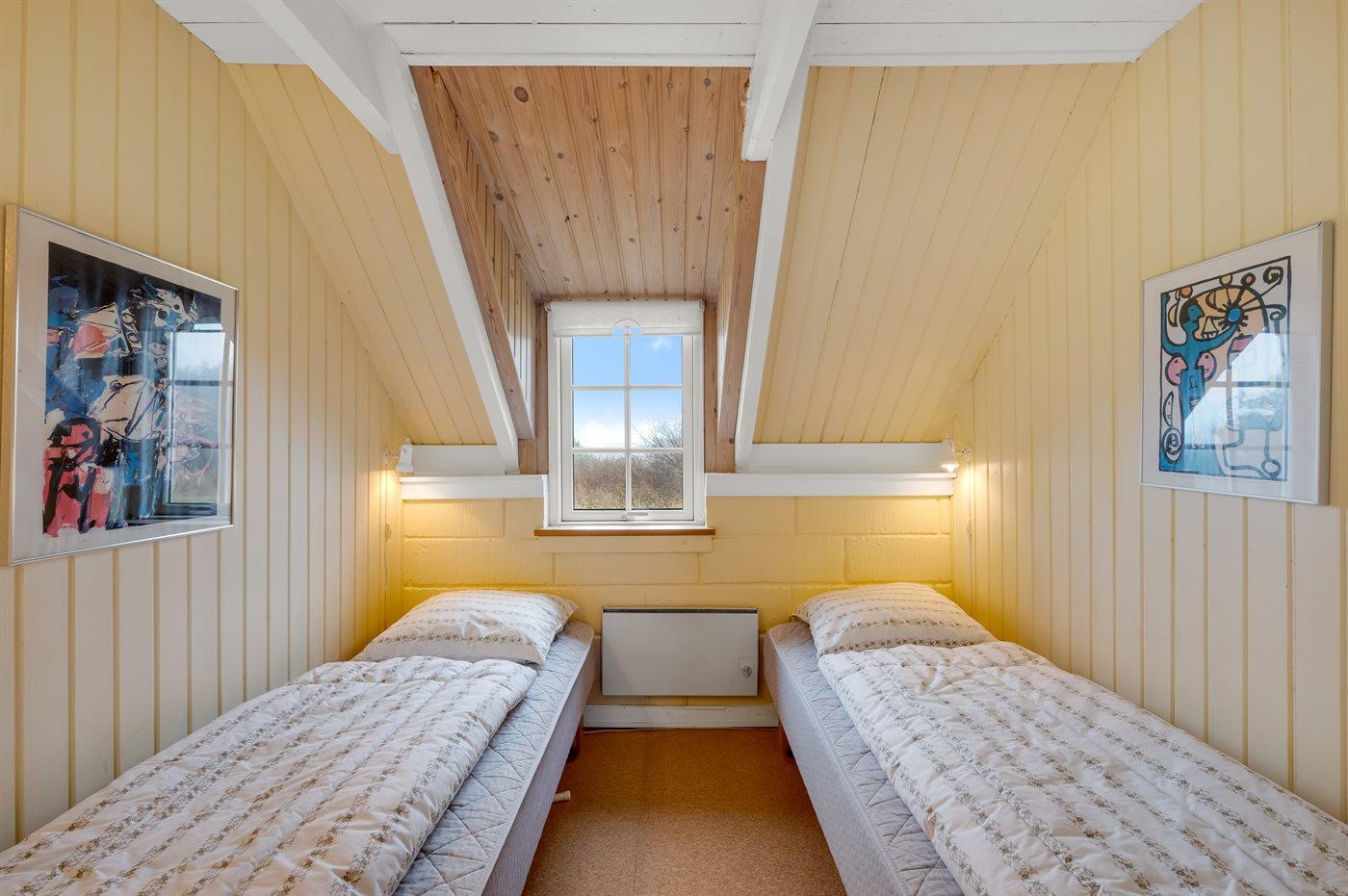 Der er i alt 2 soveværelser. Sovepladserne fordeler sig på: 2 sovepladser i dobbeltseng. 4 sovepladser i enkeltsenge. 2 af disse sovepladser befinder sig på husets hems.