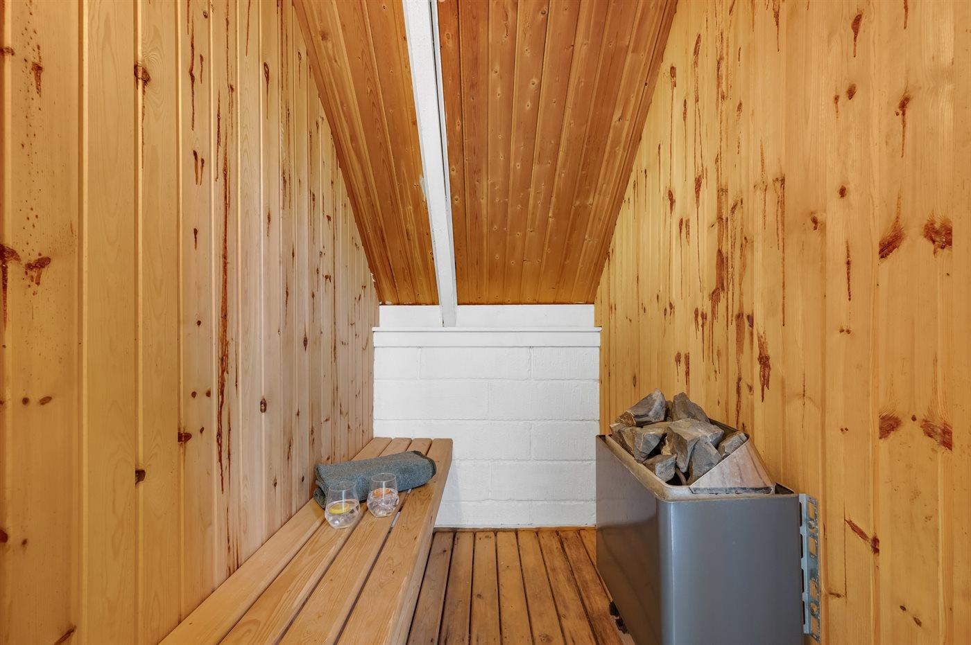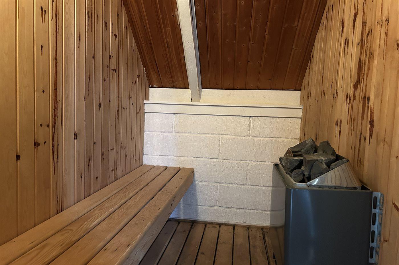 Der er 1 badeværelse med bruseniche og 1 toilet.. Der er gulvvarme på 1 badeværelse. I saunaen er der mulighed for afslapning.