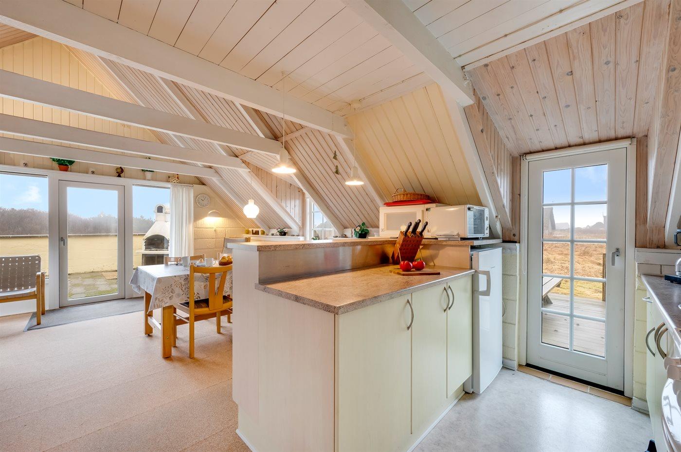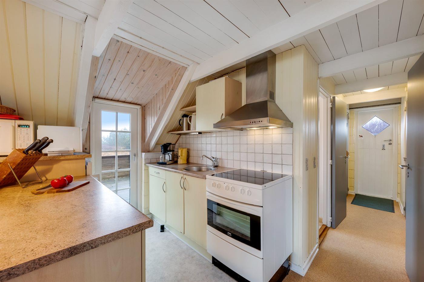 Køkkenet er udstyret med 1 køleskab. Der er 4 keramiske kogeplader, varmluftovn, mikrobølgeovn.