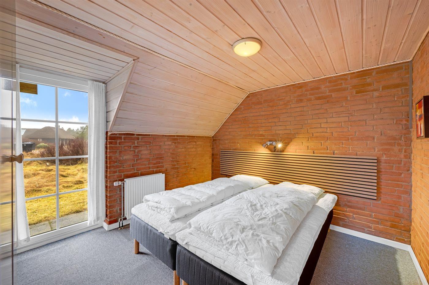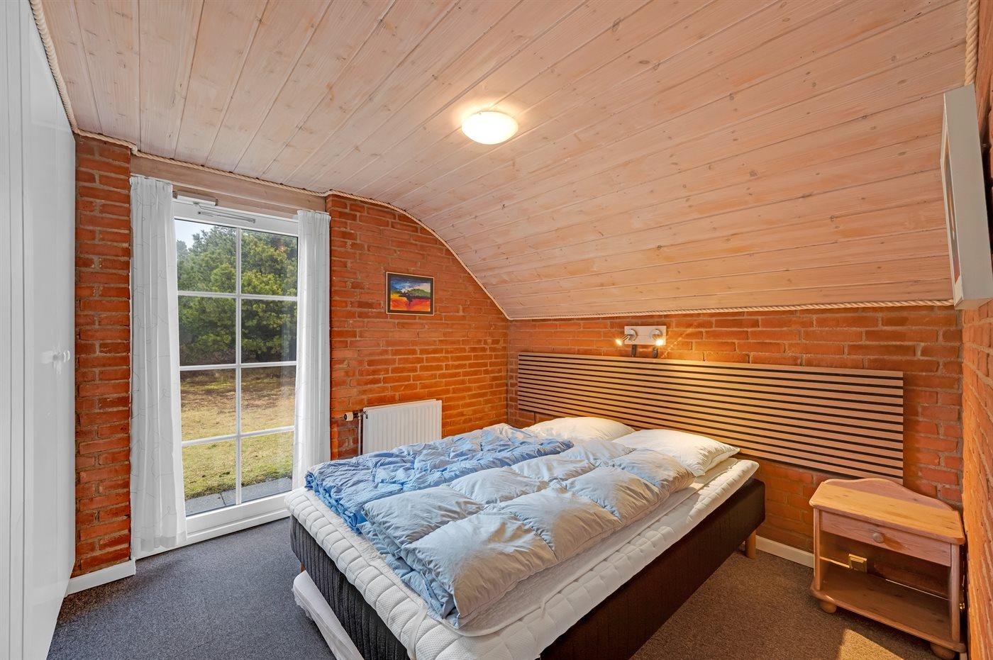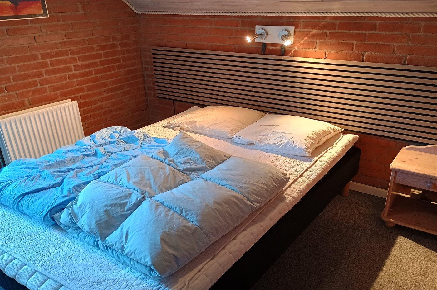 Der er i alt 5 soveværelser. Sovepladserne fordeler sig på: 10 sovepladser i dobbeltsenge. 4 sovepladser på madrasser. 4 af disse sovepladser befinder sig på husets hems. Derudover er der 1 stk. barneseng.