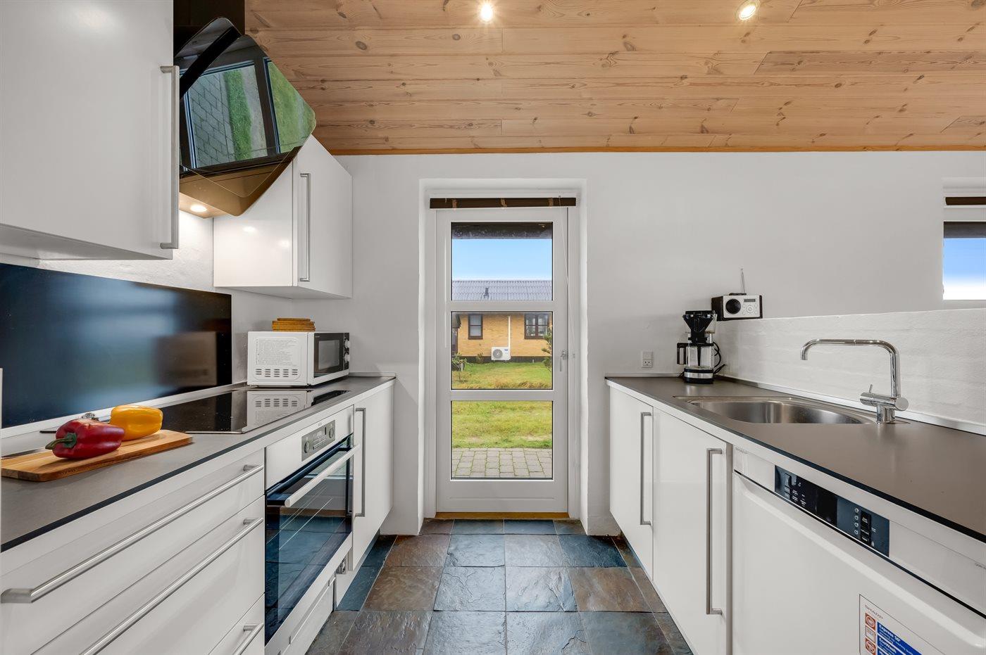 Køkkenet er udstyret med 1 køleskab. Der er 4 keramiske kogeplader, varmluftovn, mikrobølgeovn samt opvaskemaskine.