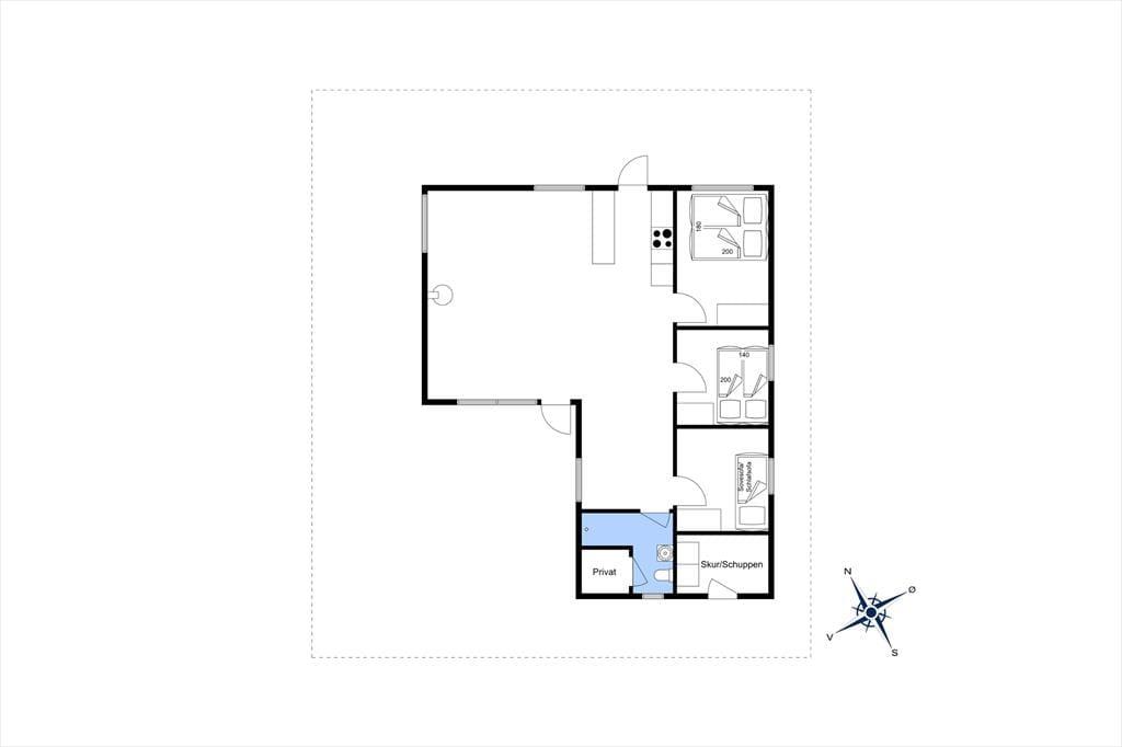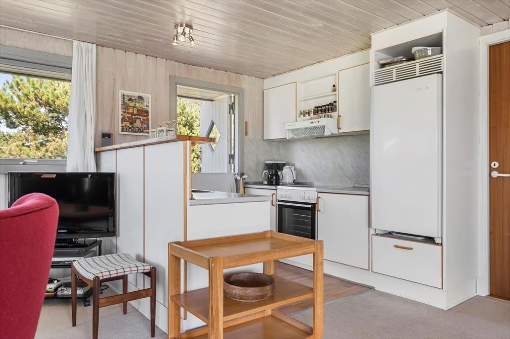 Inden døre i sommerhuset har du 80 m2 at gøre godt med, hvoraf en stor del af pladsen er dedikeret til en dejlig stue med integreret køkken. I det åbne køkken har du alt det nødvendige, når du vil lave mad – lige fra dagens første kop kaffe til et lækkert aftensmåltid, som begge dele passende kan blive indtaget ved spisebordet. Sofaarrangementet står i nærheden af stuens brændeovn, og der er også et tv til rådighed, hvis du og familien får lyst til at slappe af med en film. Soveværelser er der tre af, så I har endda flere fordelingsmuligheder, når det er ved at være sengetid.