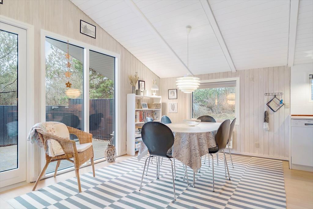 Sommerhuset er stemningsfuldt indrettet, og størstedelen af kvadratmeterne udgøres af et stort opholdsområde, hvor køkkenet og stuen er forenet. Køkkenet har plads til, at I kan være flere sammen om at lave mad, og opvaskemaskinen er med til at forenkle køkkenarbejdet. Retterne serveres let ved spisebordet, og sofaerne giver mulighed for at slappe af med en god film, læse en bog, surfe på iPad’en via sommerhusets wi-fi eller bare dagdrømme, mens ilden knitrer i brændeovnen. Sommerhusets tre soveværelser fremstår alle lyse og luftige. Badeværelset byder på bruseniche og vaskemaskine, og der er god plads til sko og overtøj i entréen.
