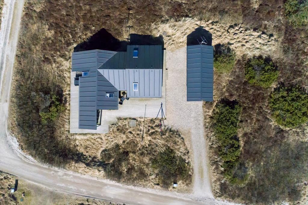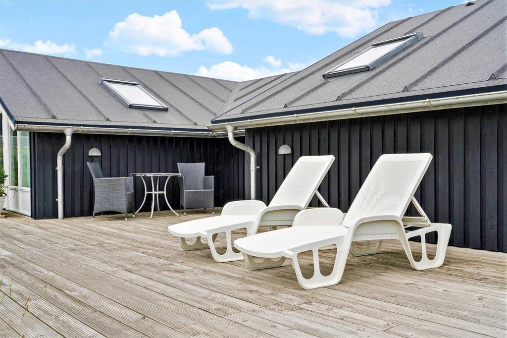 Huset er delvis omgivet af den store træterrasse, hvor der er havemøbler og grill til rådighed. Den strækker sig fra øst, mod syd og mod vest. En del af terrassen er overdækket og delvis afskærmet. Til de mindste gæster er der en gynge og en sandkasse på grunden.