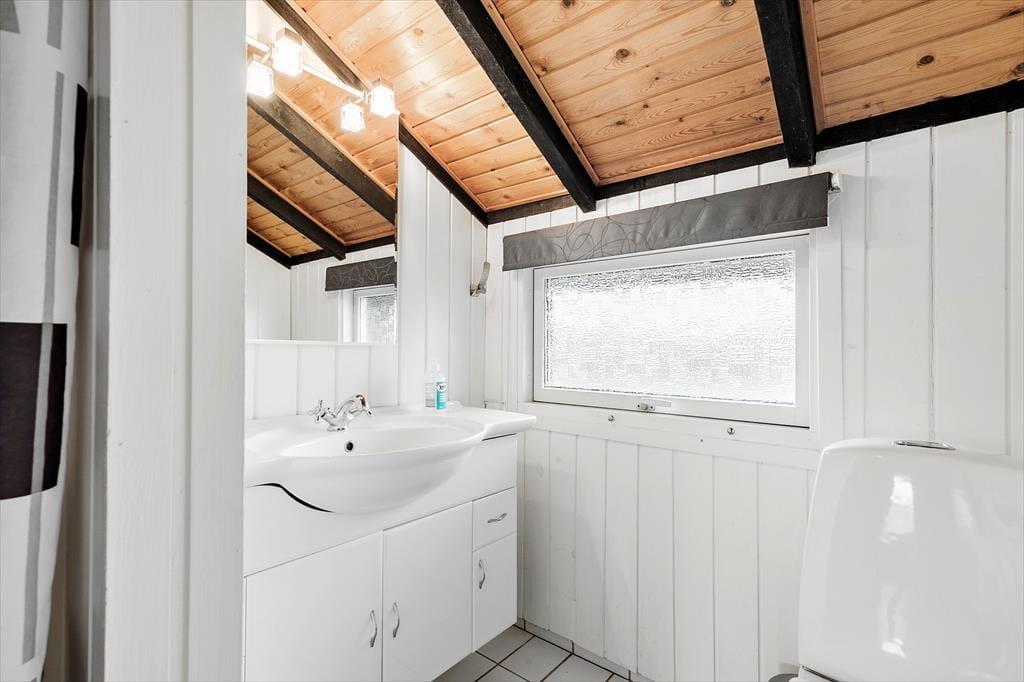 Entre. Køkkenet er udstyret med en opvaskemaskine, en mikroovn, komfur og et køleskab med 40 l fryseboks. Stuen ligger i åben forbindelse med køkkenet og har udover en spiseafdeling, en hyggelig sofaafdeling med fladskærms- tv, hvor det er muligt at se både danske og tyske tv-programmer. Fra stuen er der direkte adgang til den kæmpestore syd-vest vendte træ-terrasse, hvoraf en del er overdækket og afskærmet for vesten-vinden, så der altid kan findes læ. I huset er der i alt 5 soveværelser, de tre er med dobbeltsenge og faste skabe, 1 med 1 køjeseng og 1 med 2 enkeltsenge. Dejligt bryggers med god plads til alt overtøjet og fodtøjet, samt med skabe og vaskemaskine. Der er desuden 2 nydelige badeværelser, begge med bruseniche, toilet og håndvask. I det ene badeværelse er der desuden gulvvarme og et fast puslebord.