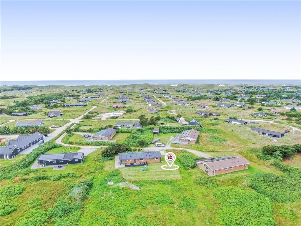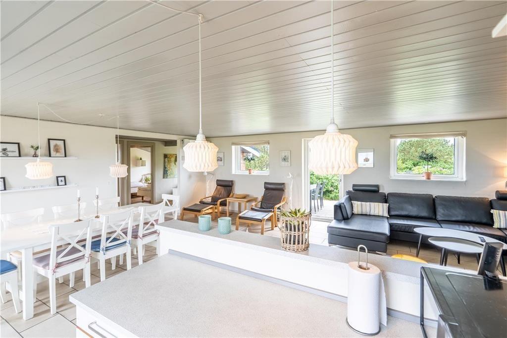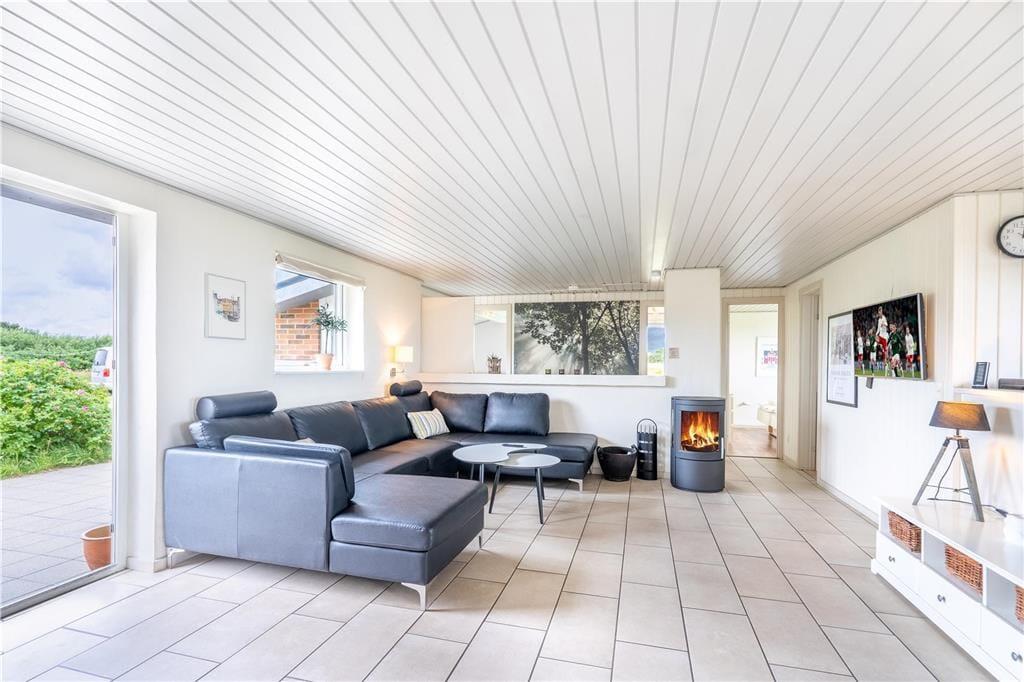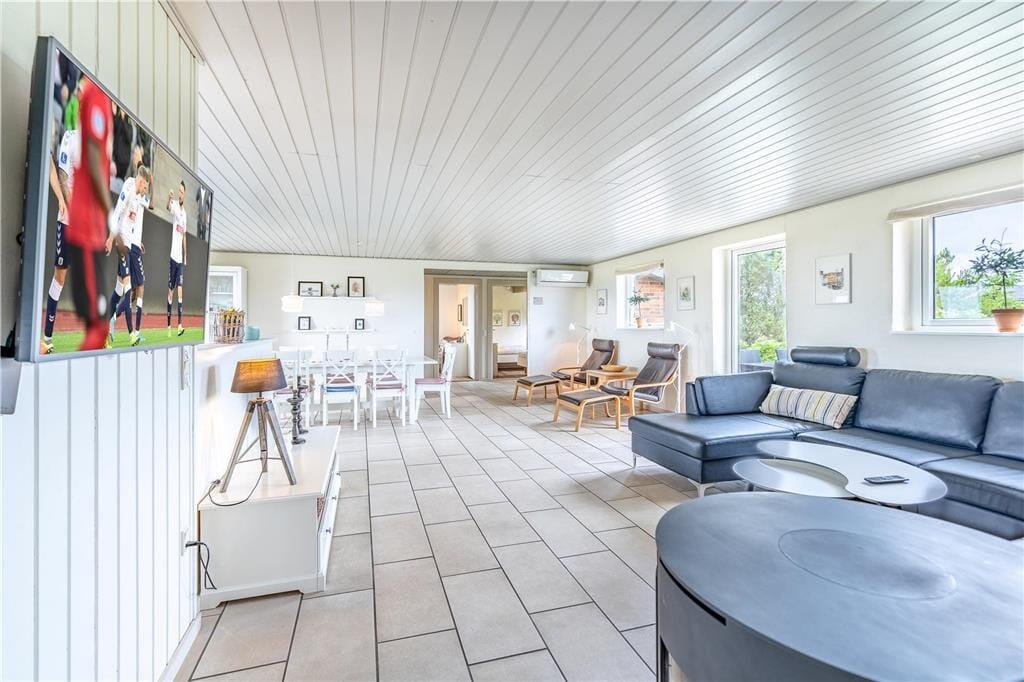 Inden døre i det 149 m2 store sommerhus er de fire værelser og to badeværelser opdelt i to soveafsnit i hver sin ende af huset. Det ene badeværelse er udstyret med en sauna foruden vaskemaskine og tørretumbler, og på det andet står et lækkert spabad, så det er let at flette små wellness-stunder ind i løbet af feriedagene. Centralt i huset ligger et veludstyret køkken integreret med stuen, og I har også åben forbindelse til et ekstra opholdsrum med bordfodboldbord og en briks, der fungerer som en hyggelig læsekrog. Derudover finder I et lille rum med bord og stole, hvis I får brug for en kontorplads i løbet af ferien – eller hvis børnene vil tegne, se tv eller spille PlayStation. Stuen byder på brændeovn og et fladskærms-tv, og den energivenlige varmepumpe kan både køle og varme alt efter behovet.