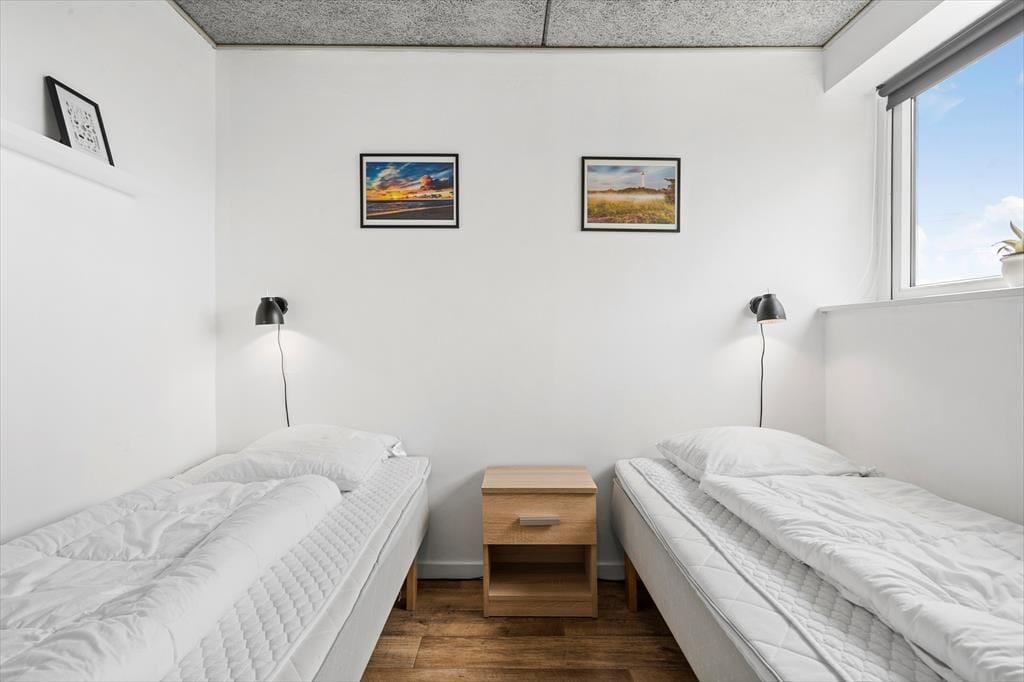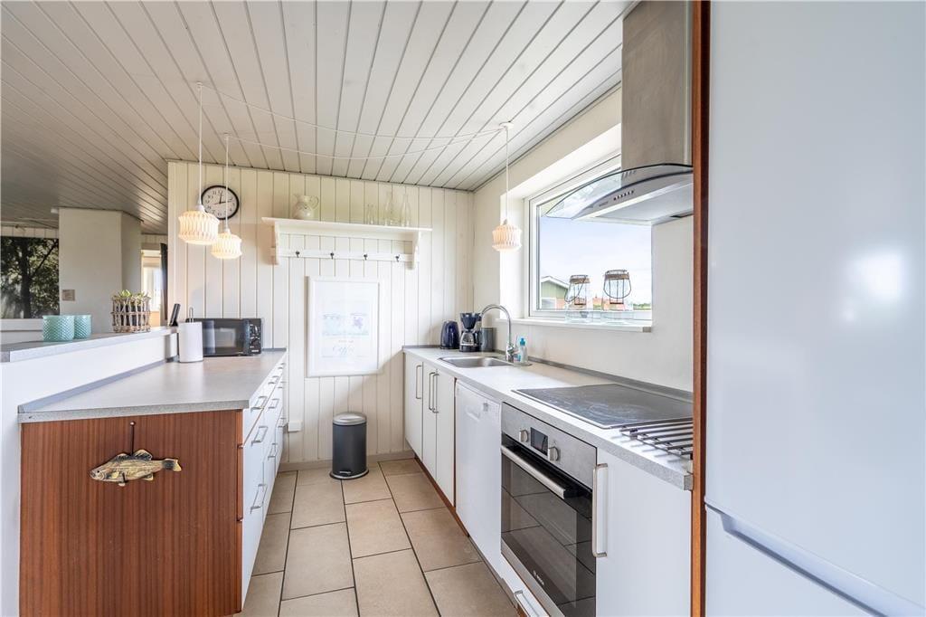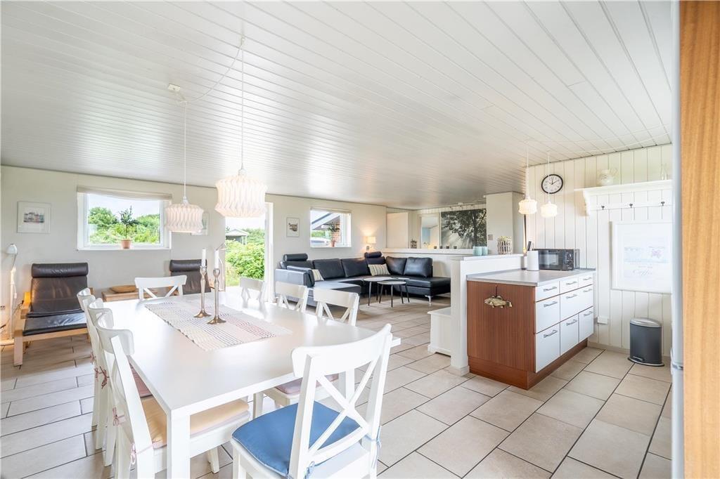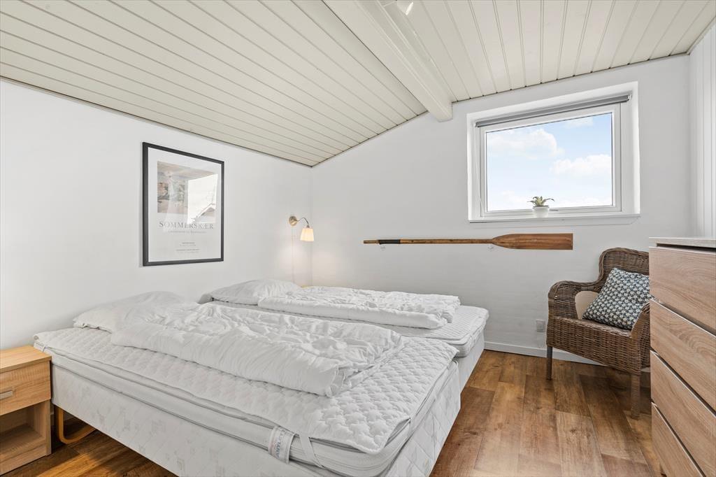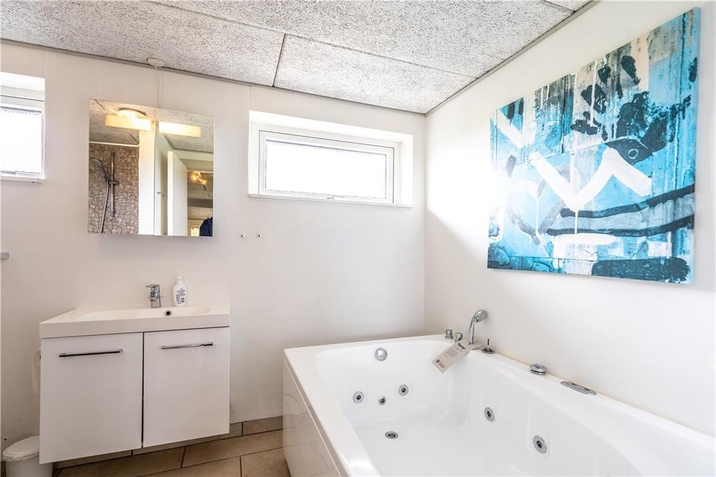 Inden døre i det 149 m2 store sommerhus er de fire værelser og to badeværelser opdelt i to soveafsnit i hver sin ende af huset. Det ene badeværelse er udstyret med en sauna foruden vaskemaskine og tørretumbler, og på det andet står et lækkert spabad, så det er let at flette små wellness-stunder ind i løbet af feriedagene. Centralt i huset ligger et veludstyret køkken integreret med stuen, og I har også åben forbindelse til et ekstra opholdsrum med bordfodboldbord og en briks, der fungerer som en hyggelig læsekrog. Derudover finder I et lille rum med bord og stole, hvis I får brug for en kontorplads i løbet af ferien – eller hvis børnene vil tegne, se tv eller spille PlayStation. Stuen byder på brændeovn og et fladskærms-tv, og den energivenlige varmepumpe kan både køle og varme alt efter behovet.
