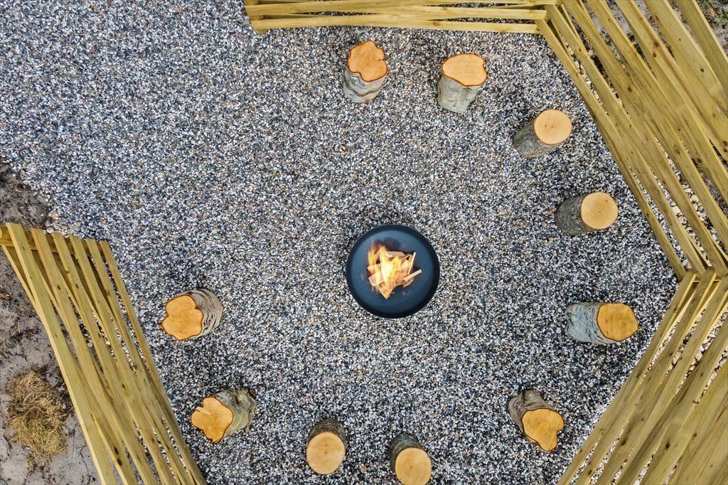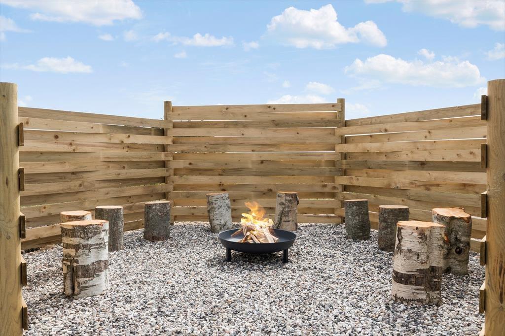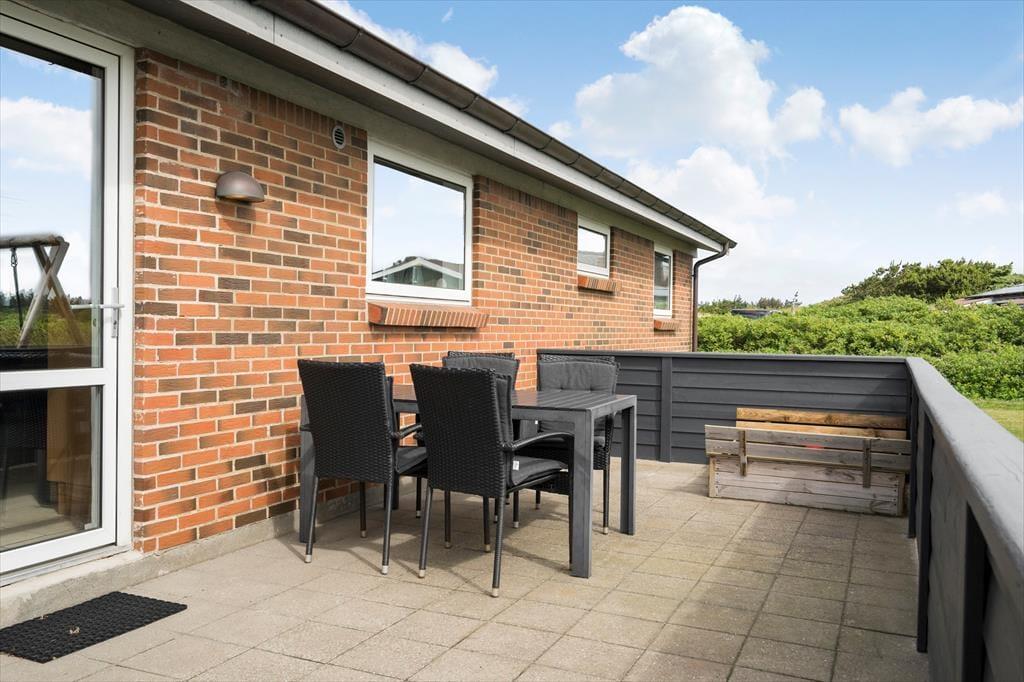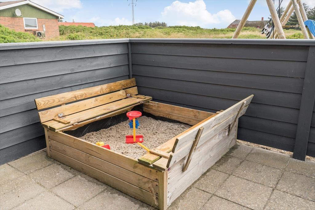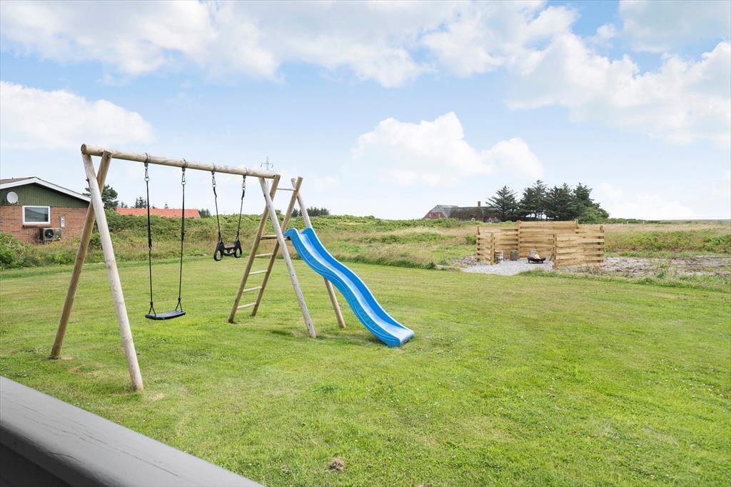 I kan se frem til mange gode stunder ude i det fri på den 4013 m2 store naturgrund. Der er flere skønne opholdspladser at vælge imellem, blandt andet en lukket østterrasse, hvor I kan drikke morgenkaffe i solen med udsigt til Ringkøbing Fjord. I kan også sætte jer på syd- eller vestsiden af sommerhuset på den åbne terrasse, der er udstyret med fiskerensebord, grill og gode havemøbler. Til børnene er der både sandkasse og legestativ med gynger, og det afskærmede bålsted kan nemt blive en favorit for hele familien, hvis I er vilde med snobrød eller grillede skumfiduser.