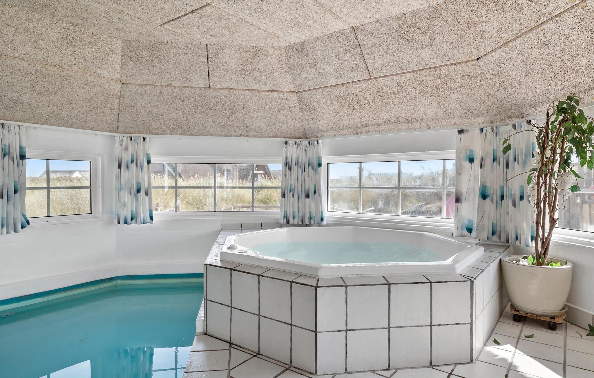Holmsland Klit, der skiller det brusende Vesterhav fra Ringkøbing Fjords rolige vand, er et ferieparadis med utallige aktivitetsmuligheder som supplement til den utrolig fine sandstrand og klitterne. Her finder I dette fantastiske feriehus indrettet med to hemse og god plads til hele familien. I den hyggelige stue kan I sidde og nyde varmen fra brændeovnen, mens I snakker om dagens oplevelser, ser tv eller surfer på internettet (100/100 Mb). Husets dejlige poolafdeling inviterer til plask og leg for hele familien. Er I mere til massage og afslapning, er det at finde i det store fem personers spabad. På grunden ligger en skøn legeplads med bl.a. stort legetårn, gynger og forhindringsbane. I huset findes forskellige former for energibesparende foranstaltninger, så husets energiforbrug er lavere end normalt.