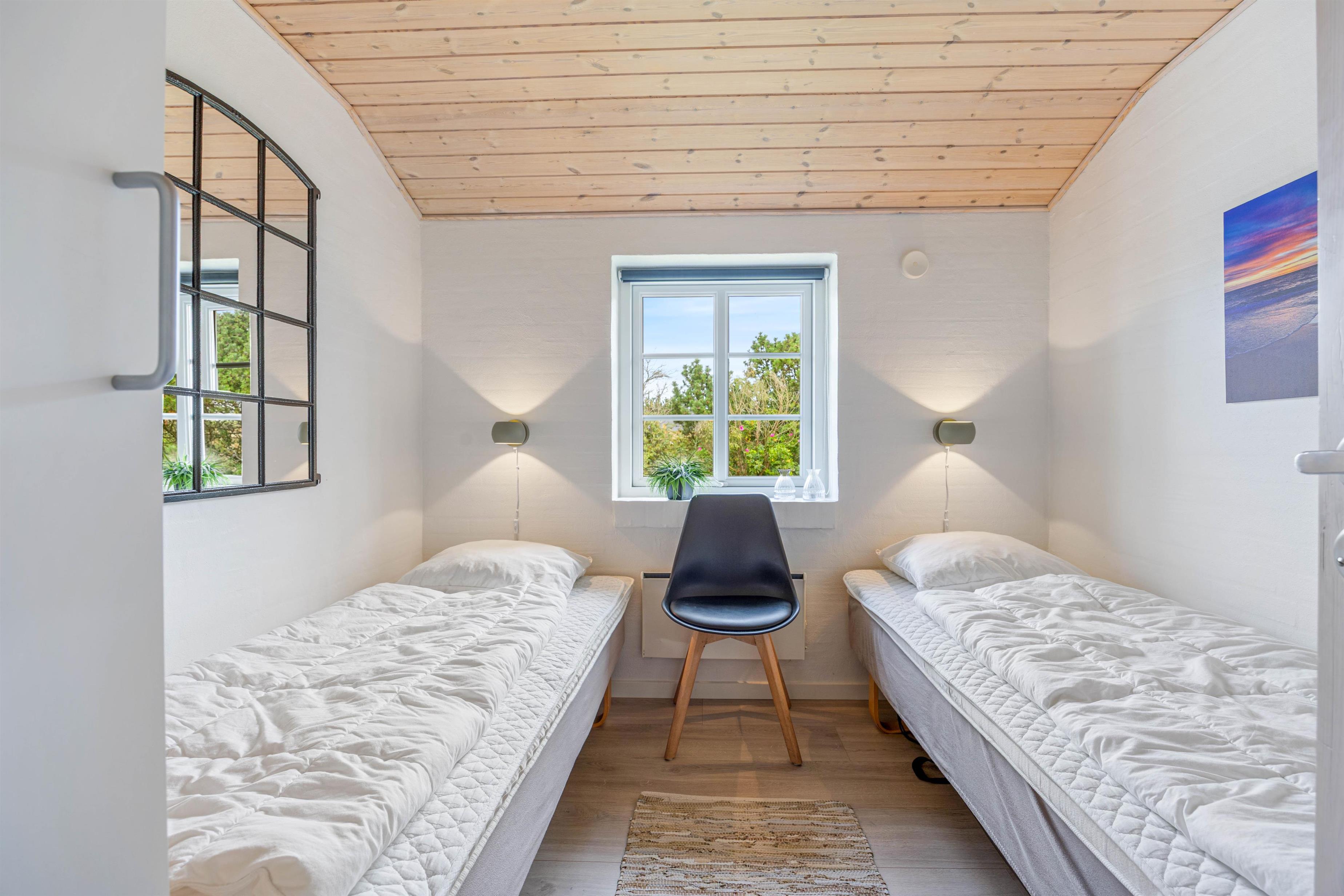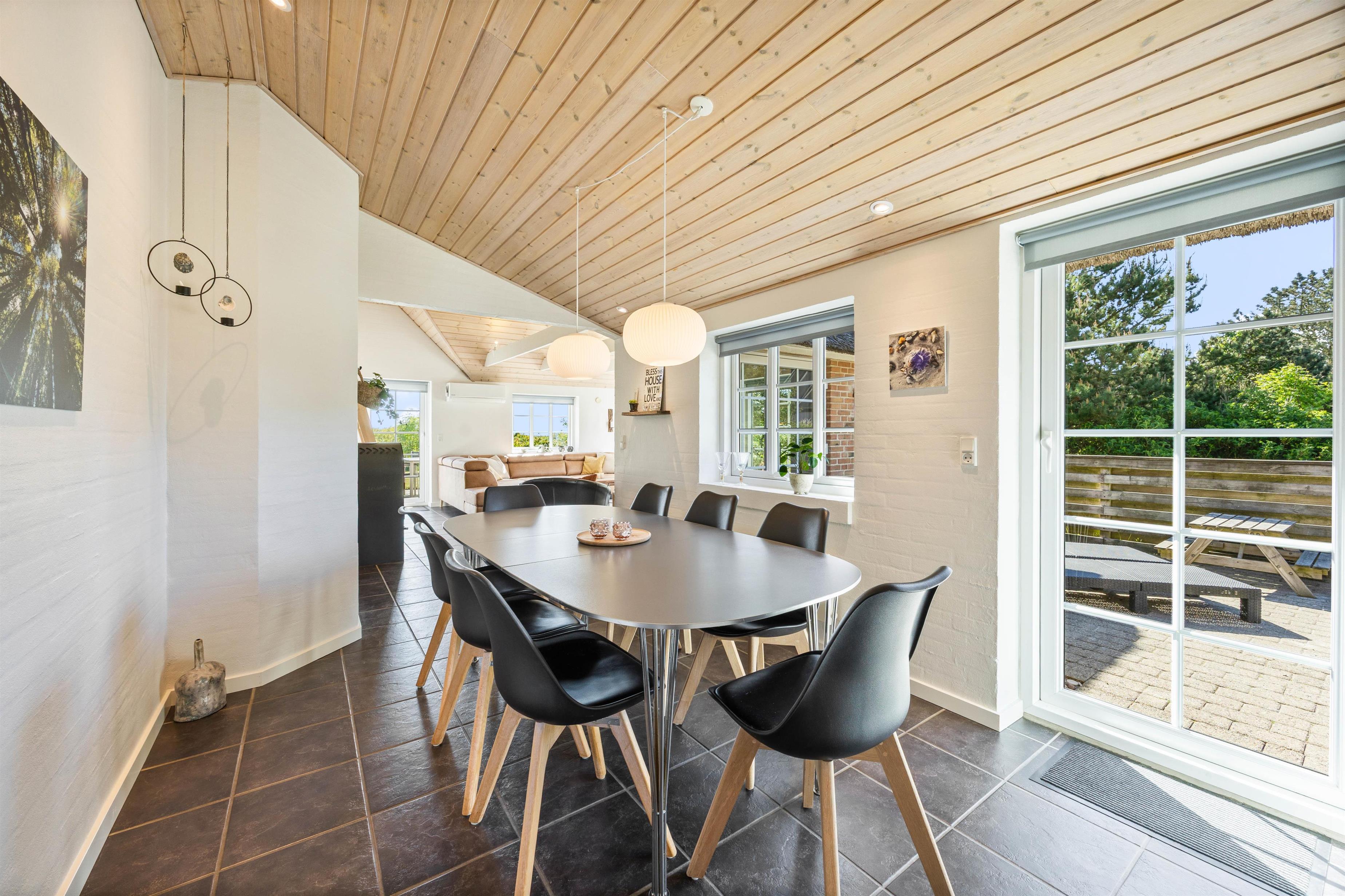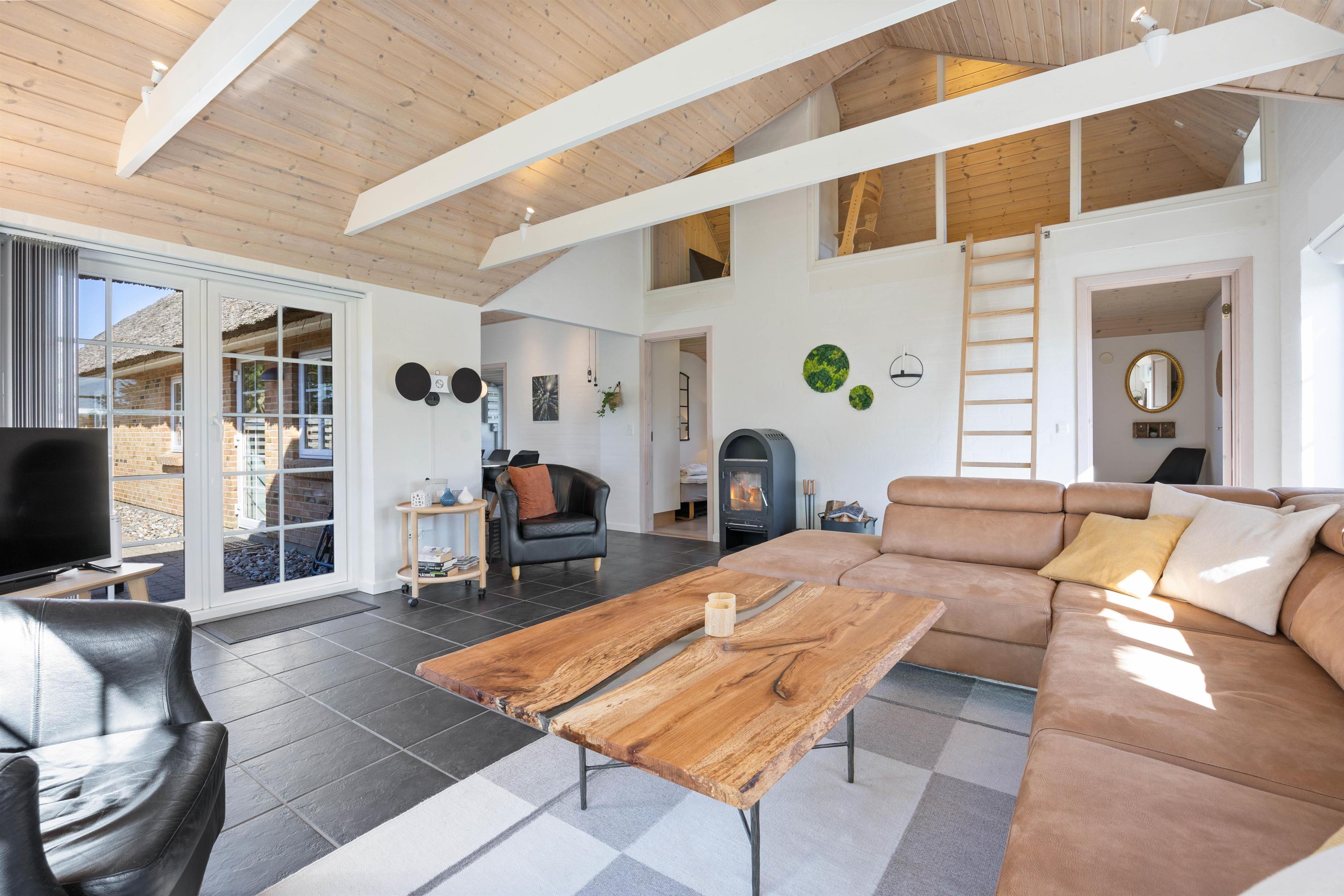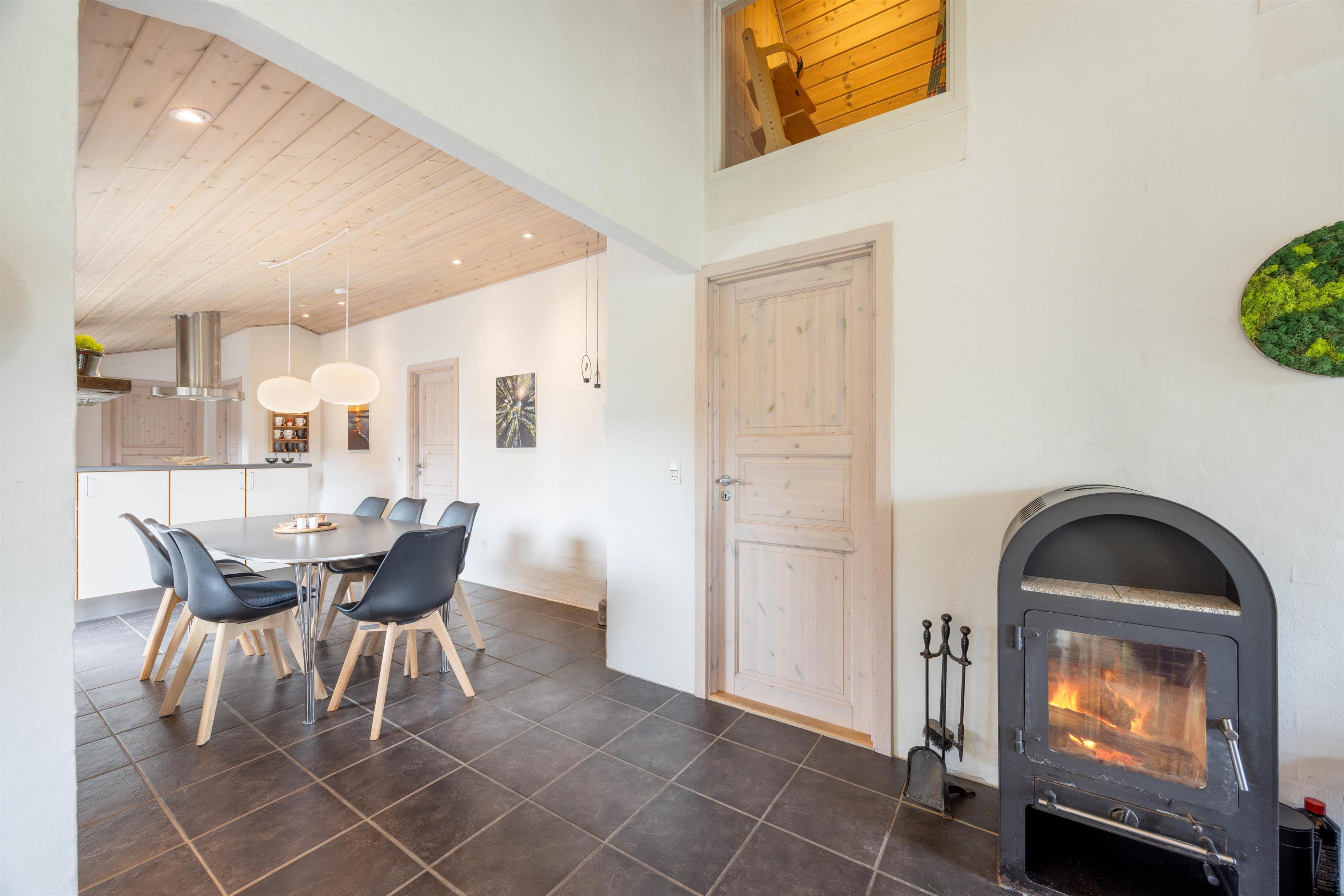 Feriehuset har i alt 3 soveværelser samt en hems med tilhørende soveplads. I hjertet af huset, nemlig stue og køkkenalrum, kan I samles og hygge med brætspil ved spisebordet samt fælles madlavning. Om aftenen kan I samles i sofaen foran fjernsynet, hvor I kan streame film fra husets Chromecast. I kan også tænde op i brændeovnen og nyde hyggen og varmen fra de knitrende flammer. Huset opvarmes også af den energibesparende luft til luft varmepumpe.