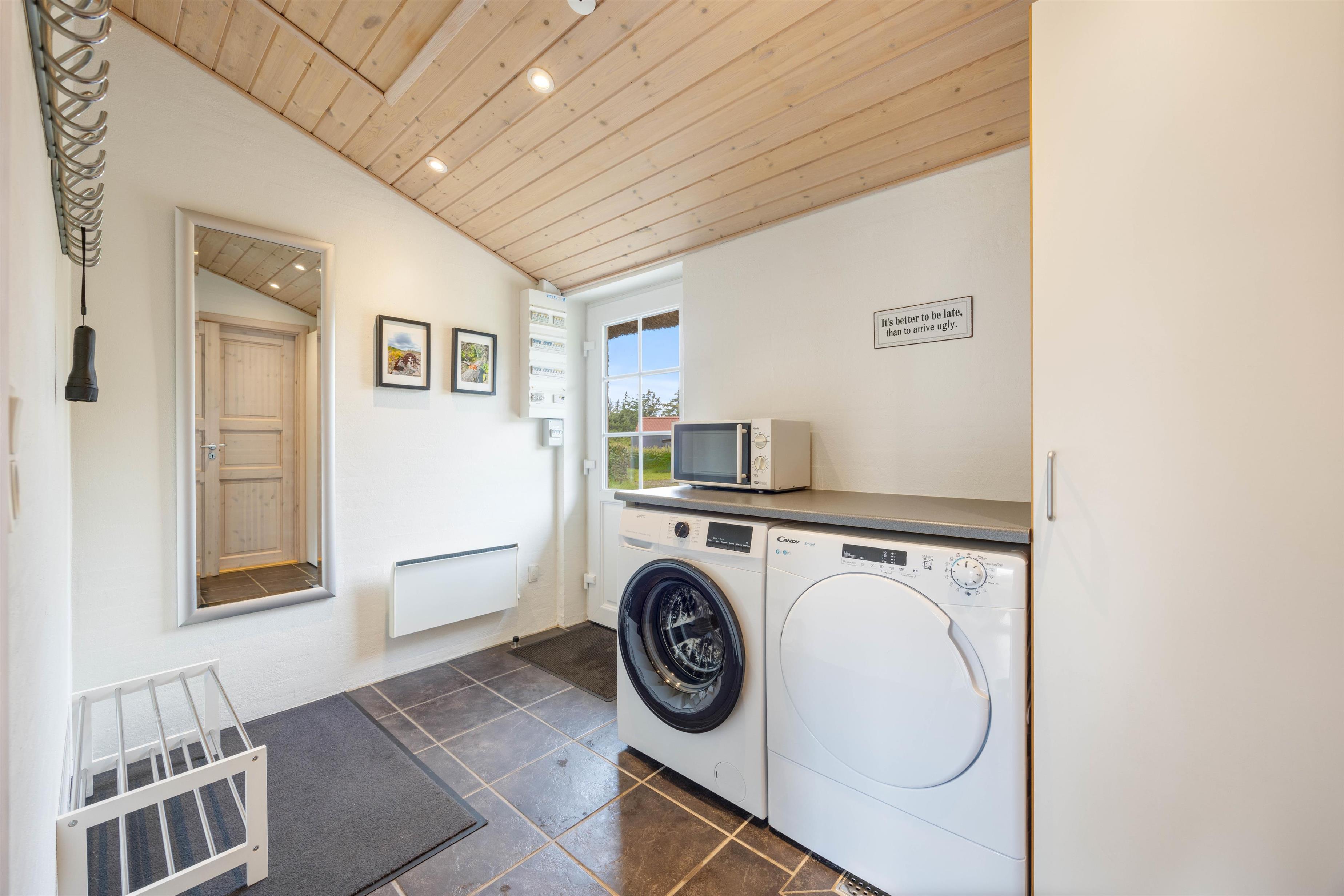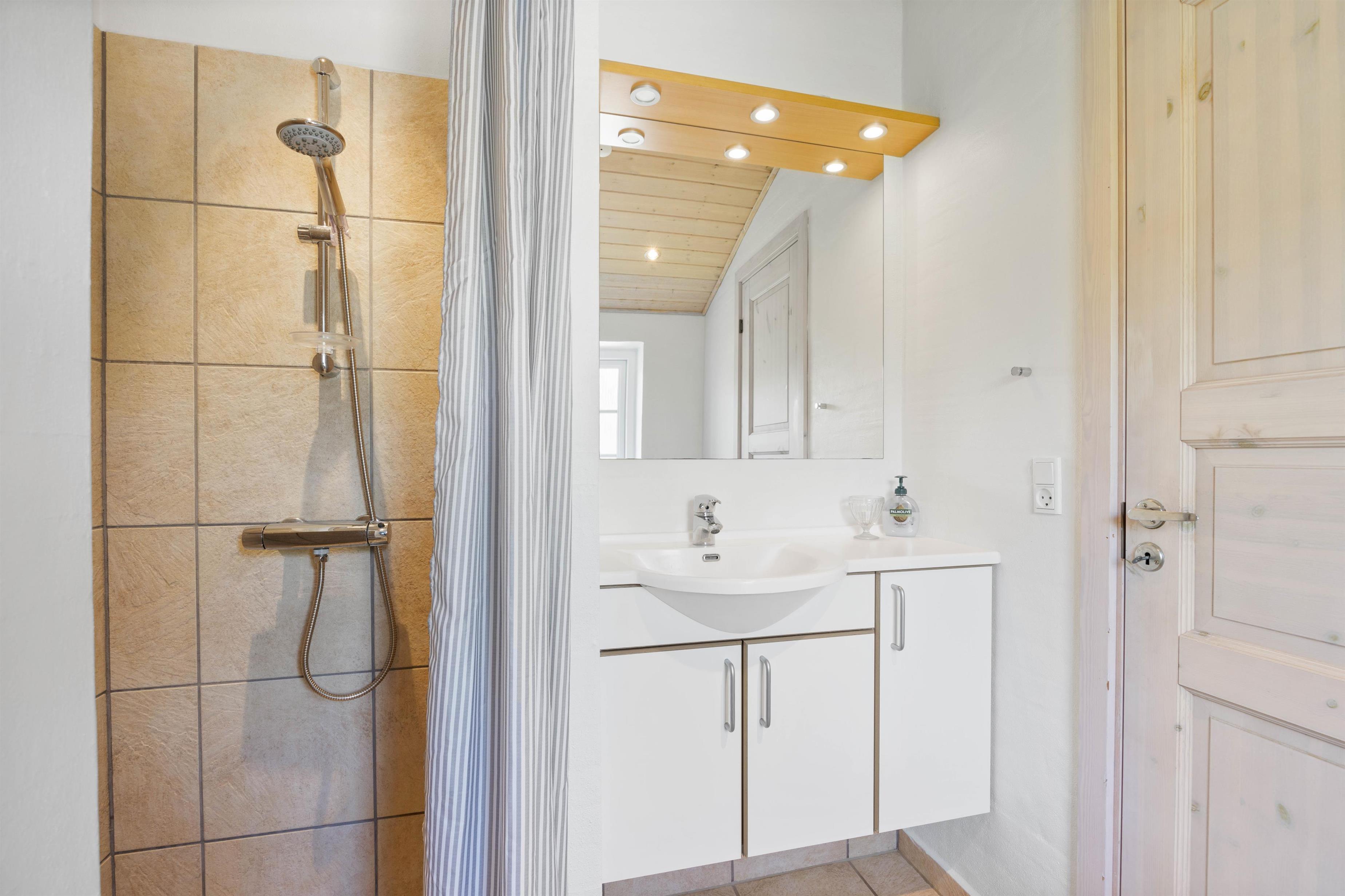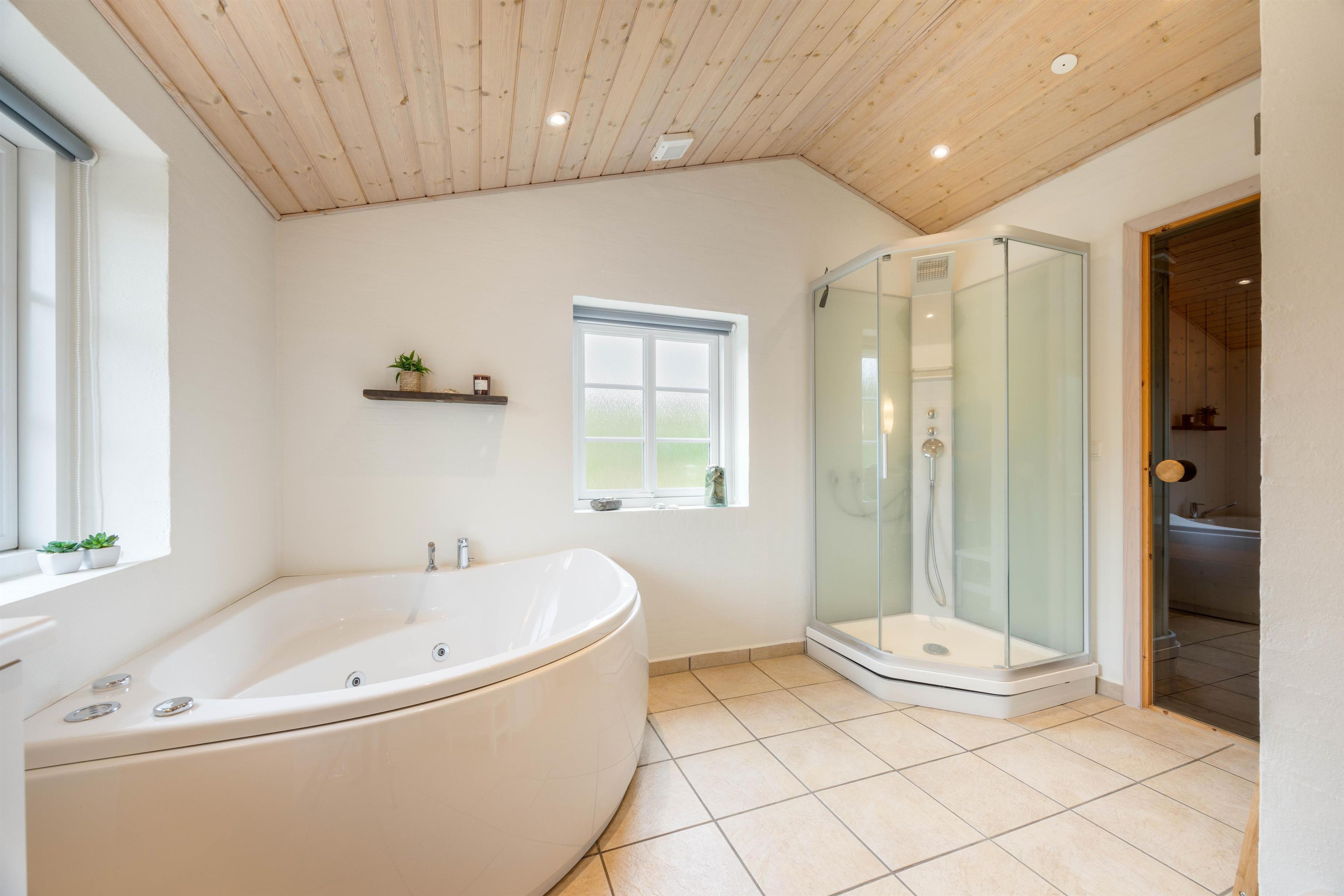 Huset har 2 badeværelser, som begge har bruseniche og gulvvarme. I det store badeværelser finder I desuden et spabad samt en sauna, hvor I kan læne jer tilbage og slappe af efter en lang dag på Vestkysten.