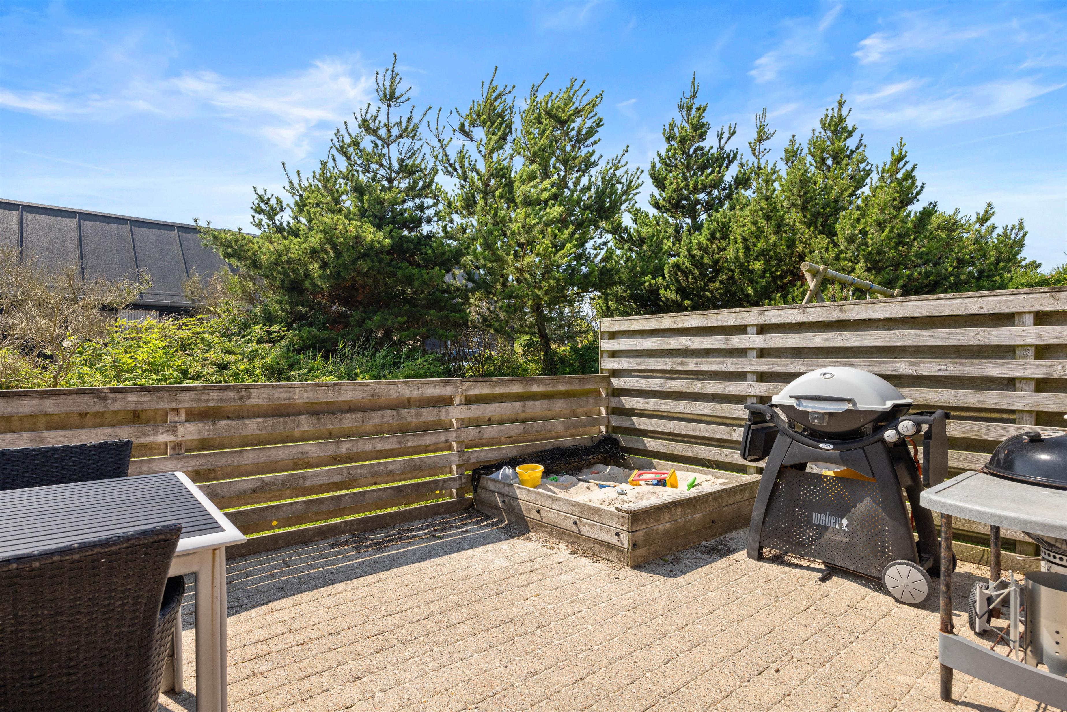 Det hyggelige feriehus er beliggende på en delvis afskærmet naturgrund i Klegod. Den store lukkede terrasse er sydvendt og velegnet til børn. På østsiden af huset er der også en mindre terrasse med udsigt til Ringkøbing Fjord, hvor I om morgenen kan nyde en kop kaffe med udsigt til solopgangen. Ved huset er der blandt andet også en sandkasse og gynge, som er særligt populær hos børnene.