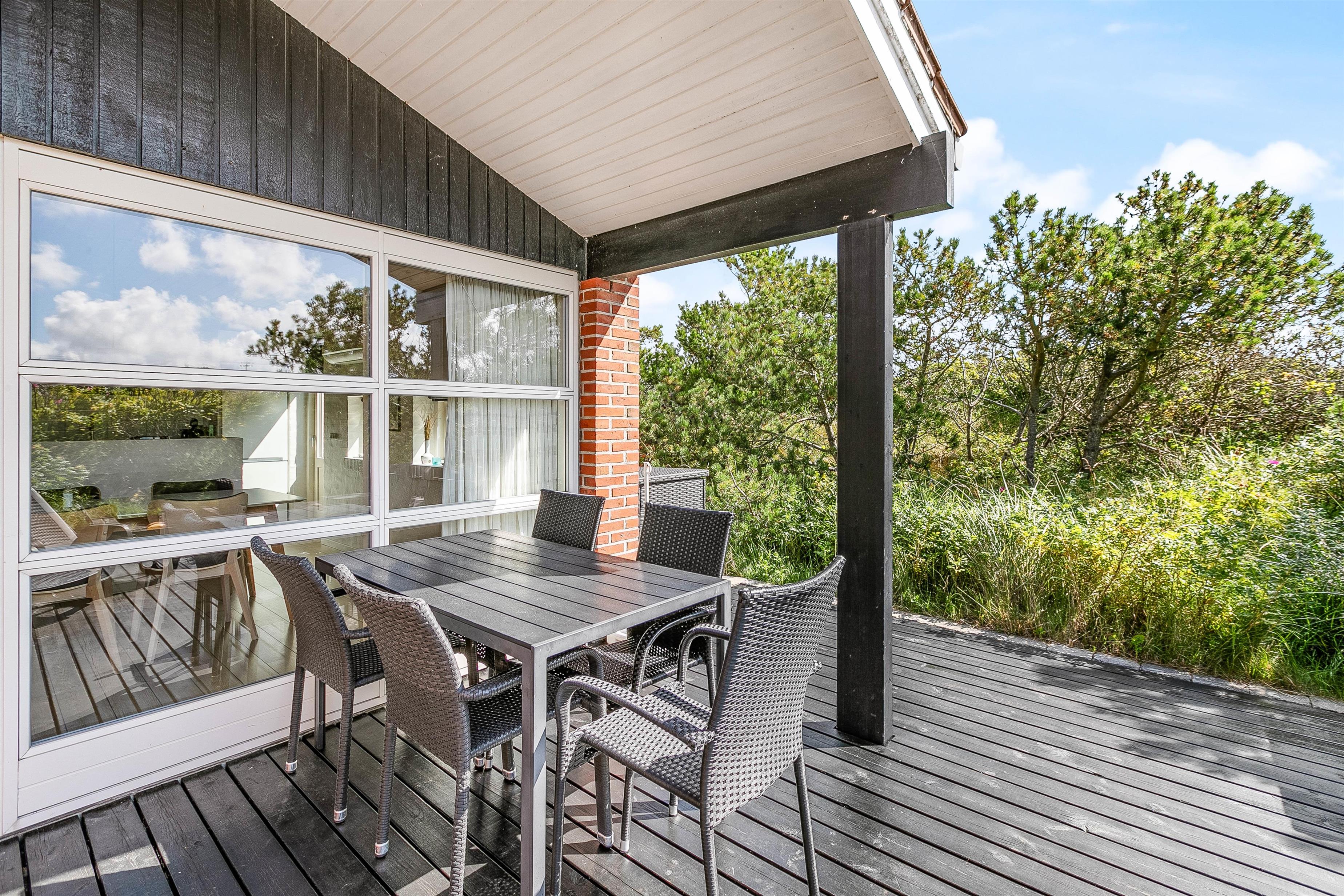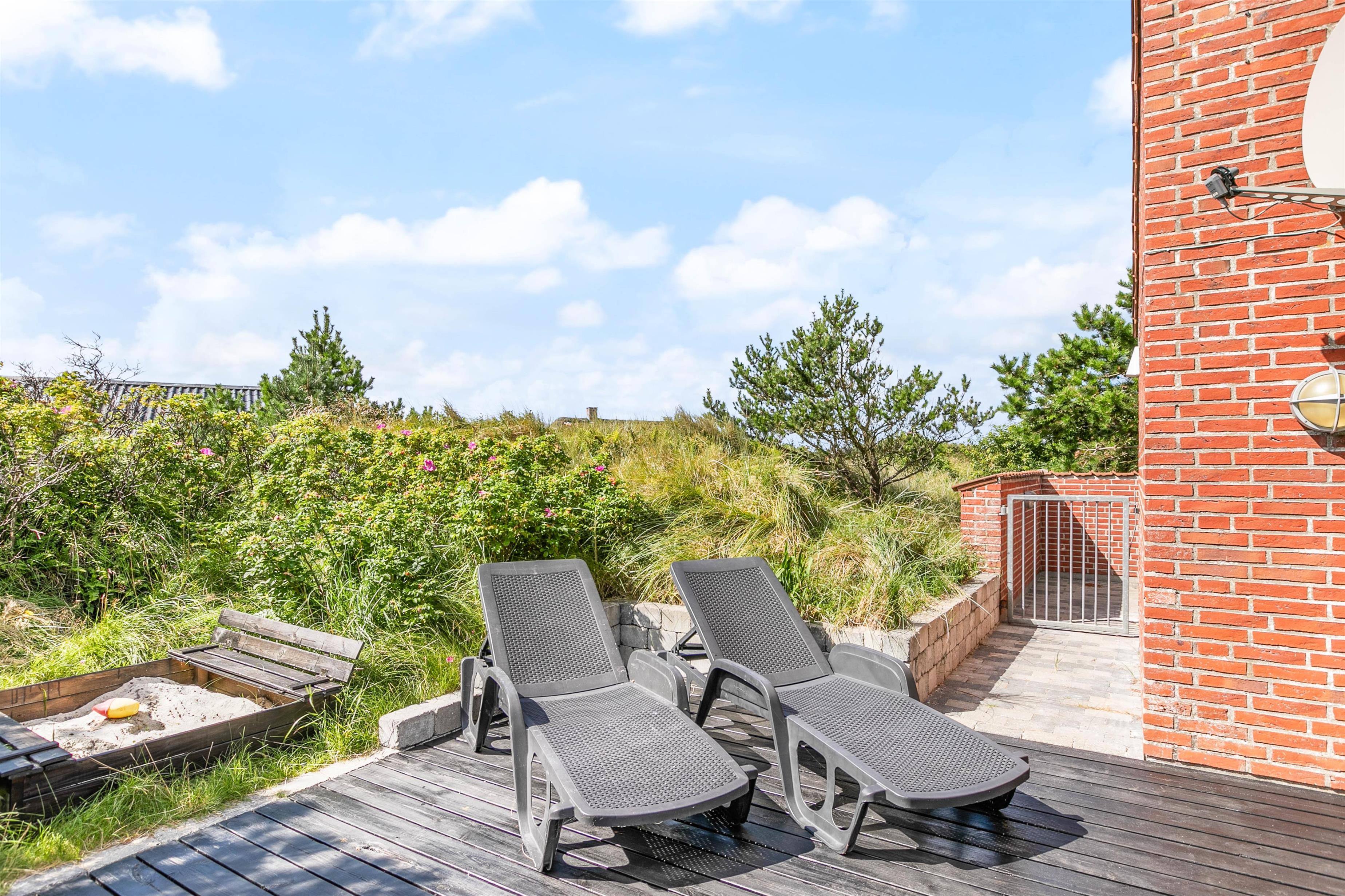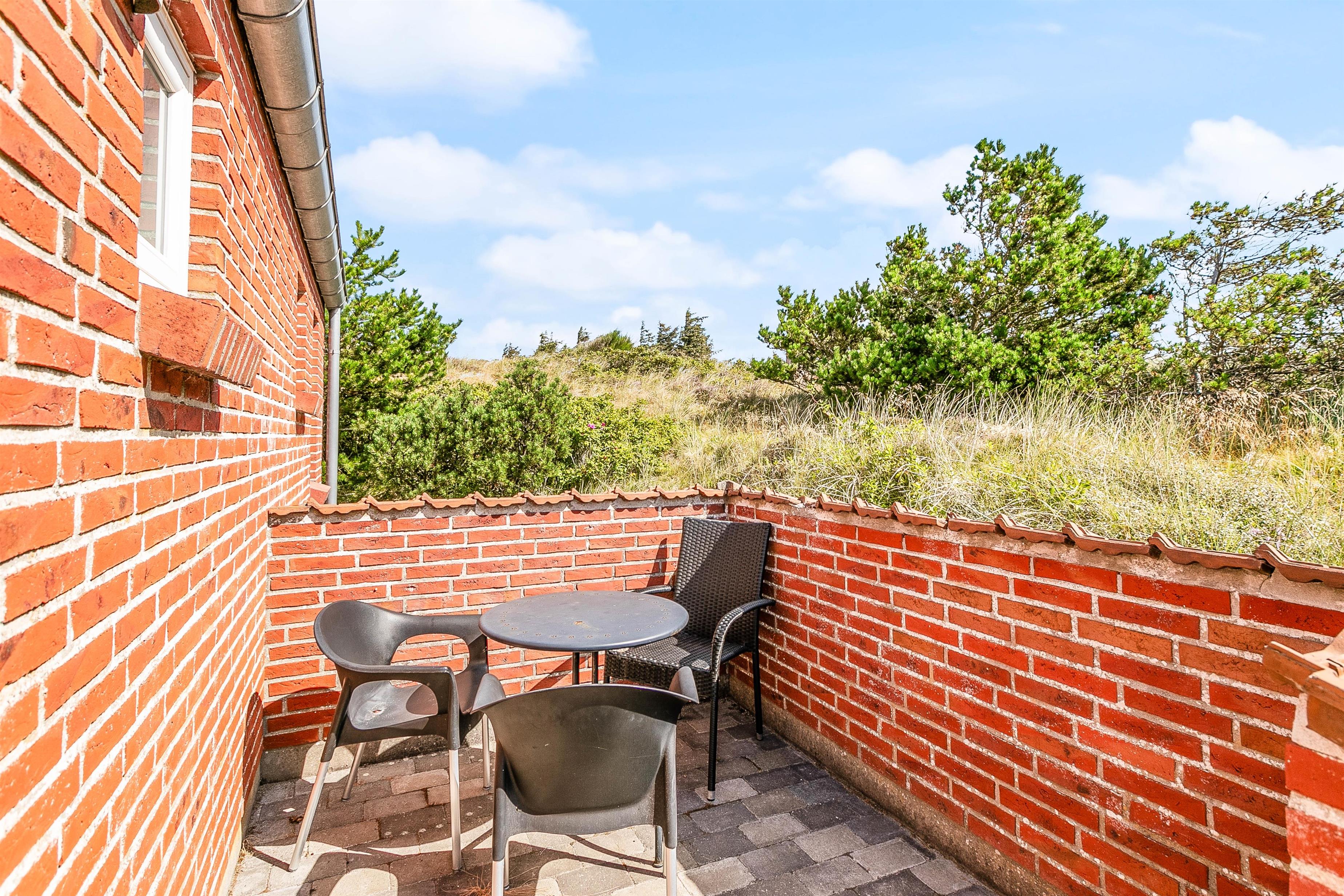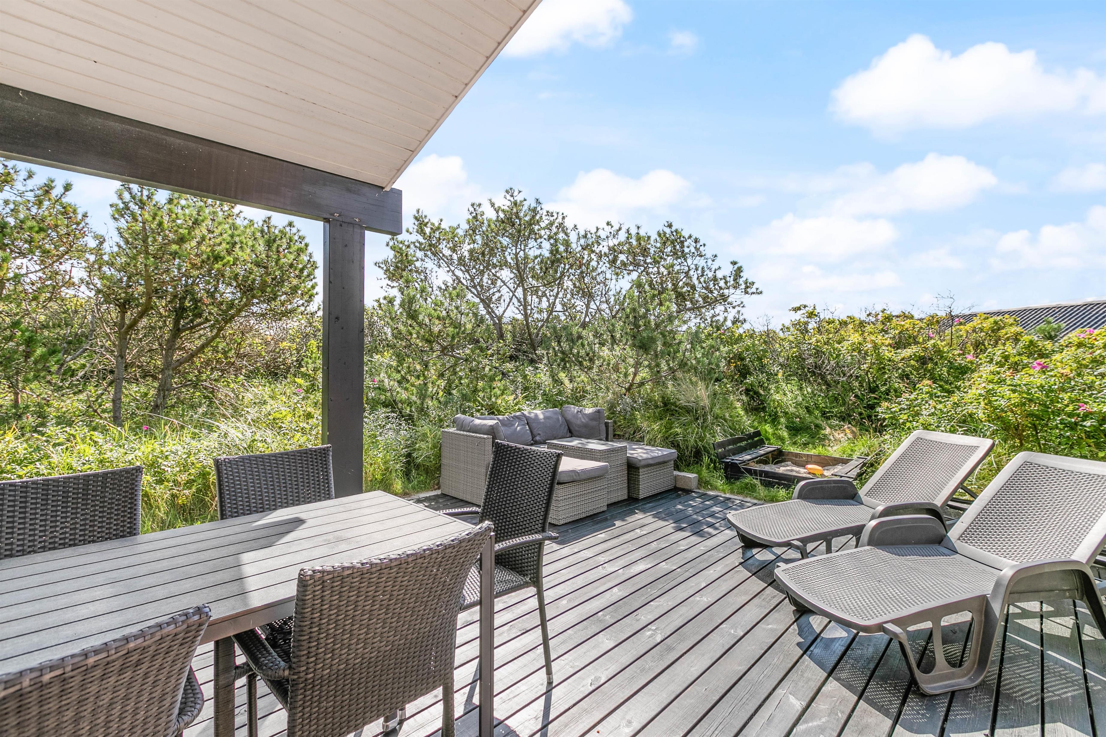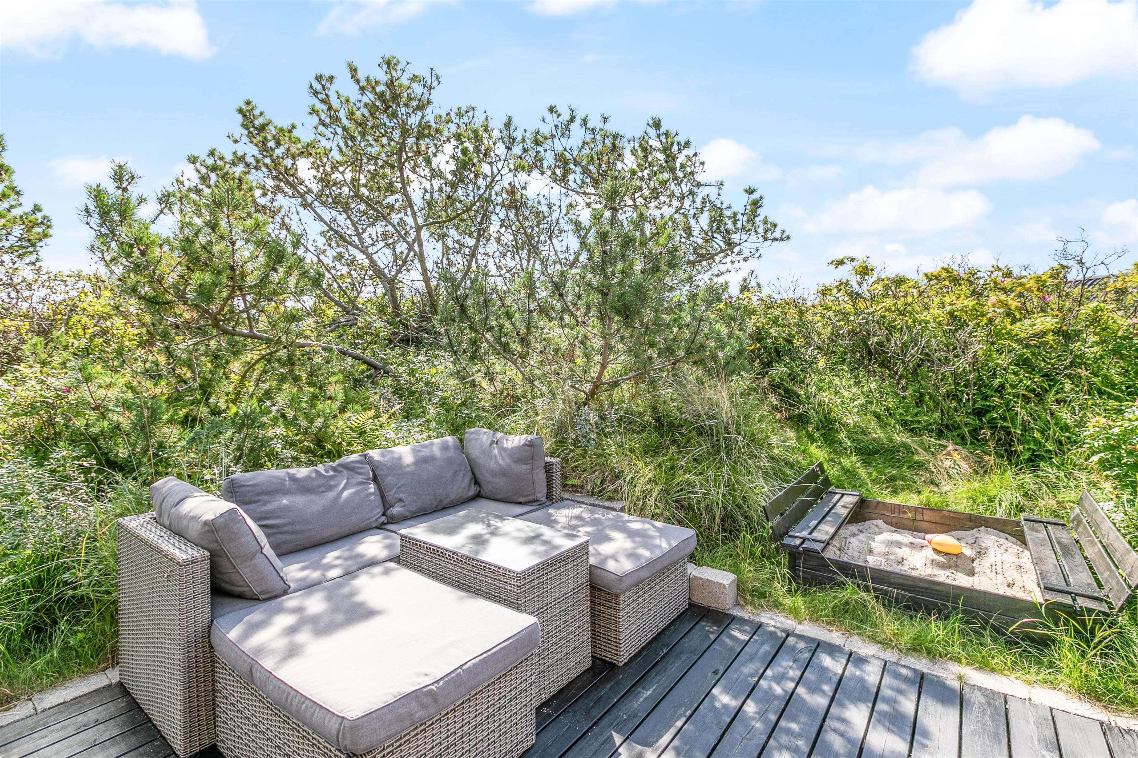Mod vest og mod sydvest er der en god lukket terrasse, ideelt hvis man har børn eller hund med. Mod syd er der en skøn terrasse, som ligger dejligt og ugenert placeret i landskabet, og hvor man kan være helt sig selv. Der er mulighed for masser af sol, samt læ, hvis vinden kommer fra vest. Mod øst er der en mindre terrasse, som er perfekt til morgen kaffen. På naturgrunden er der en gynge og en sandkasse. Det er tilladt at medbringe 2 hunde i sommerhuset.