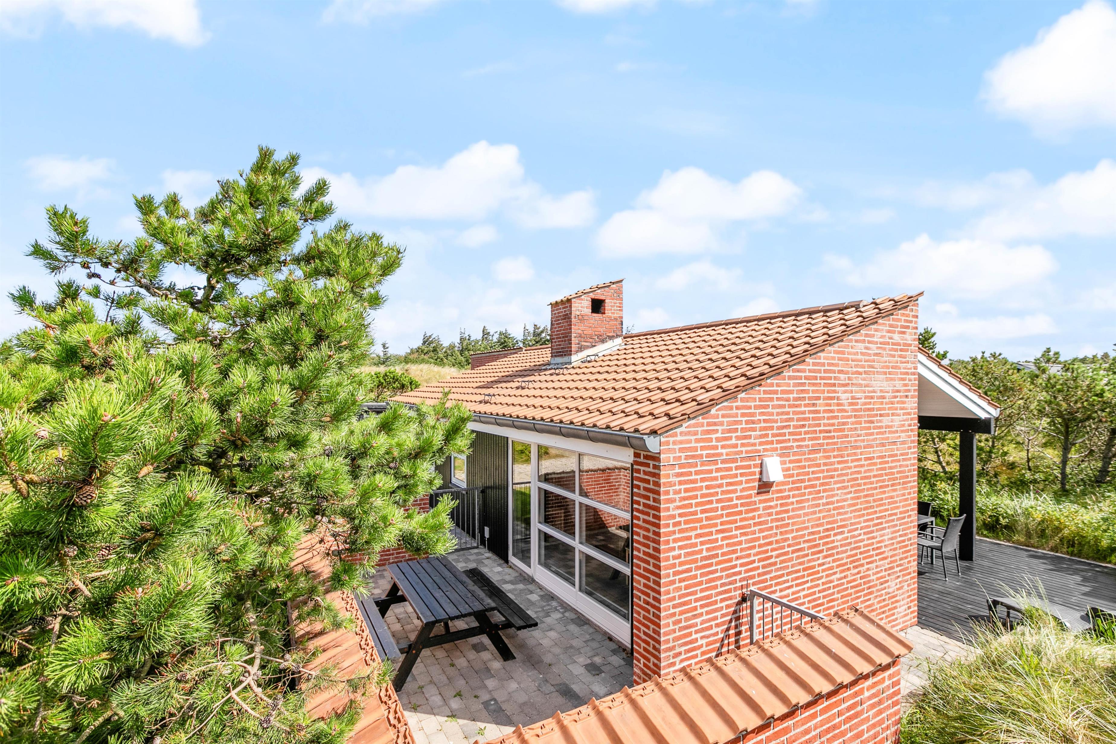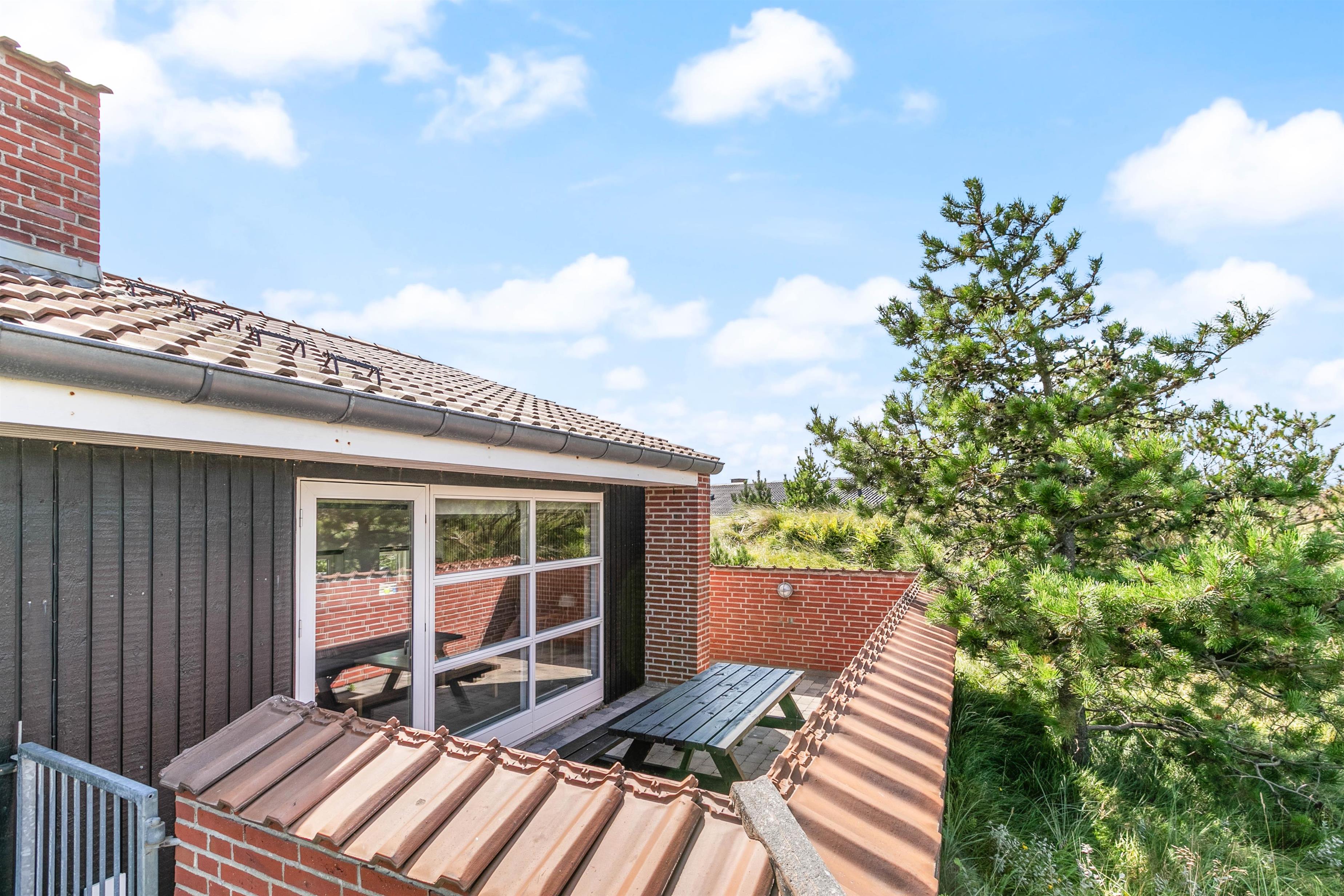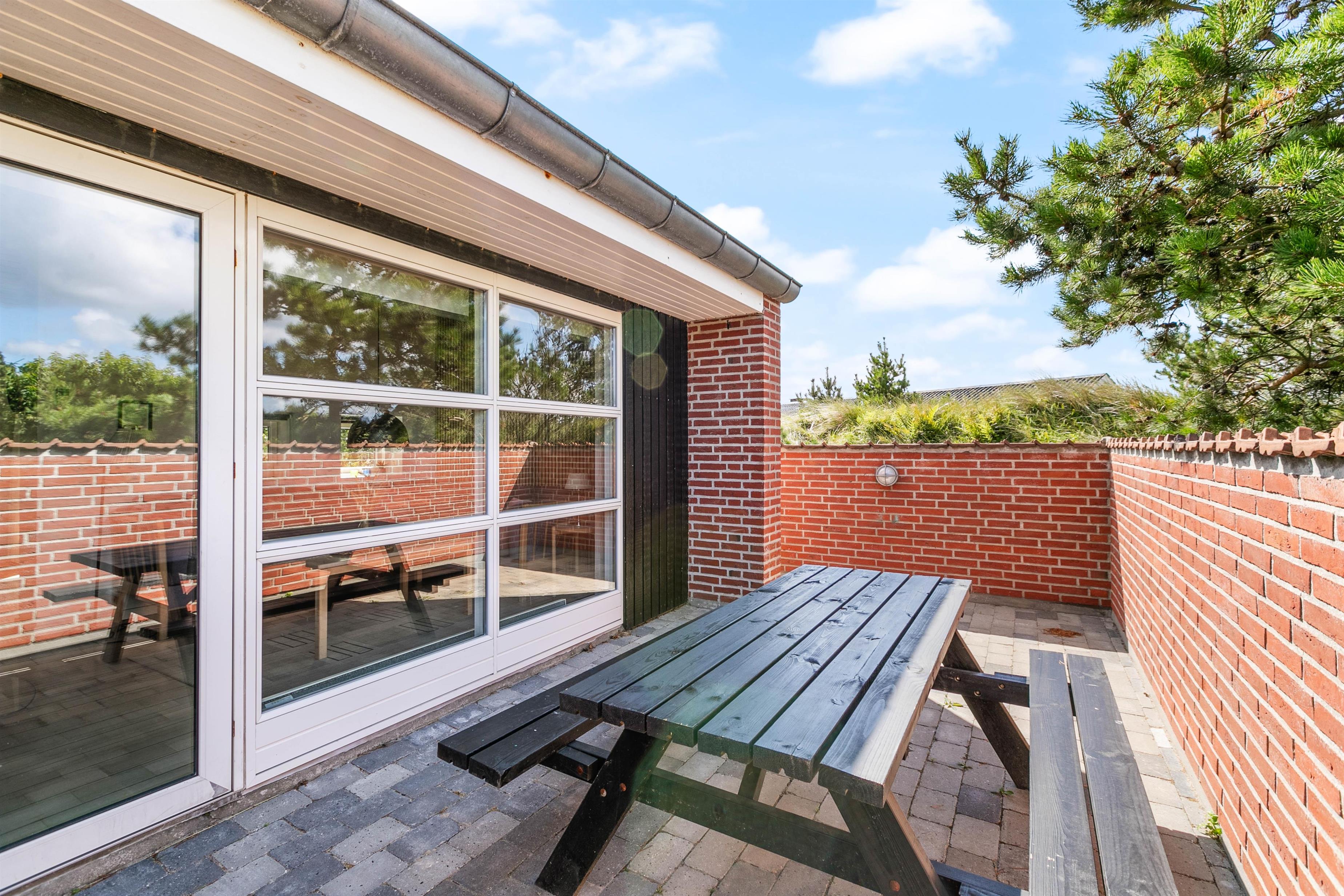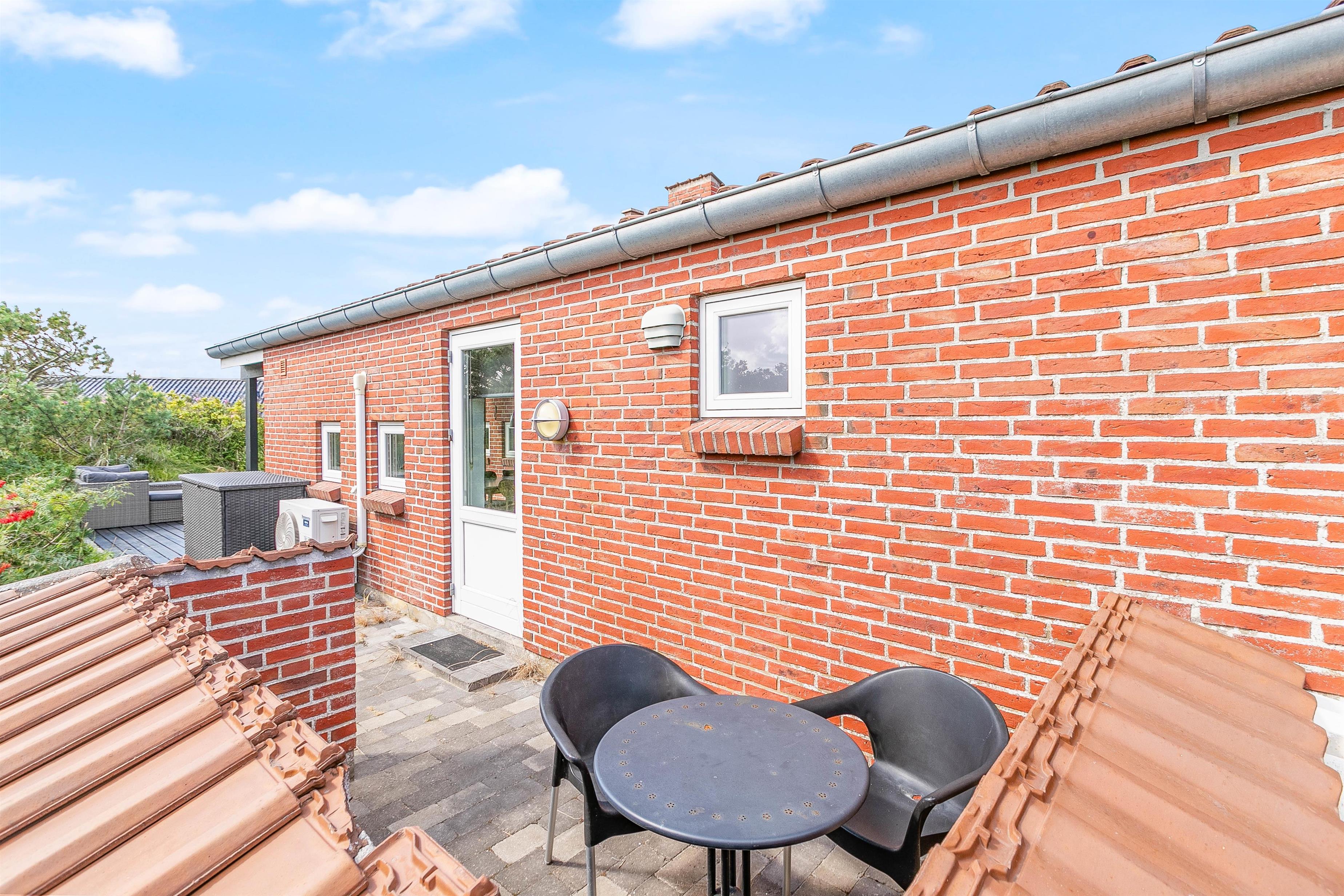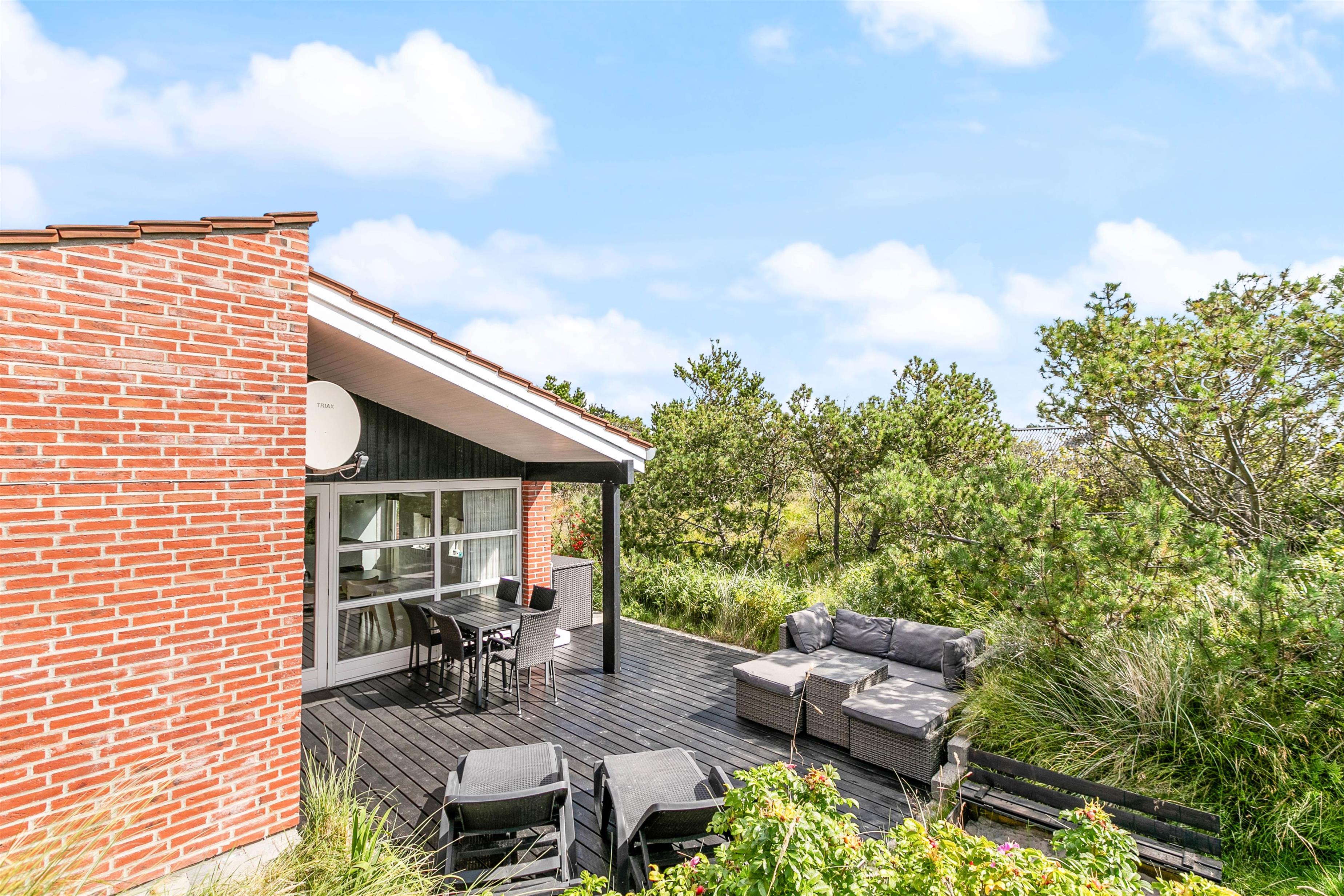 Mod vest og mod sydvest er der en god lukket terrasse, ideelt hvis man har børn eller hund med. Mod syd er der en skøn terrasse, som ligger dejligt og ugenert placeret i landskabet, og hvor man kan være helt sig selv. Der er mulighed for masser af sol, samt læ, hvis vinden kommer fra vest. Mod øst er der en mindre terrasse, som er perfekt til morgen kaffen. På naturgrunden er der en gynge og en sandkasse. Det er tilladt at medbringe 2 hunde i sommerhuset.