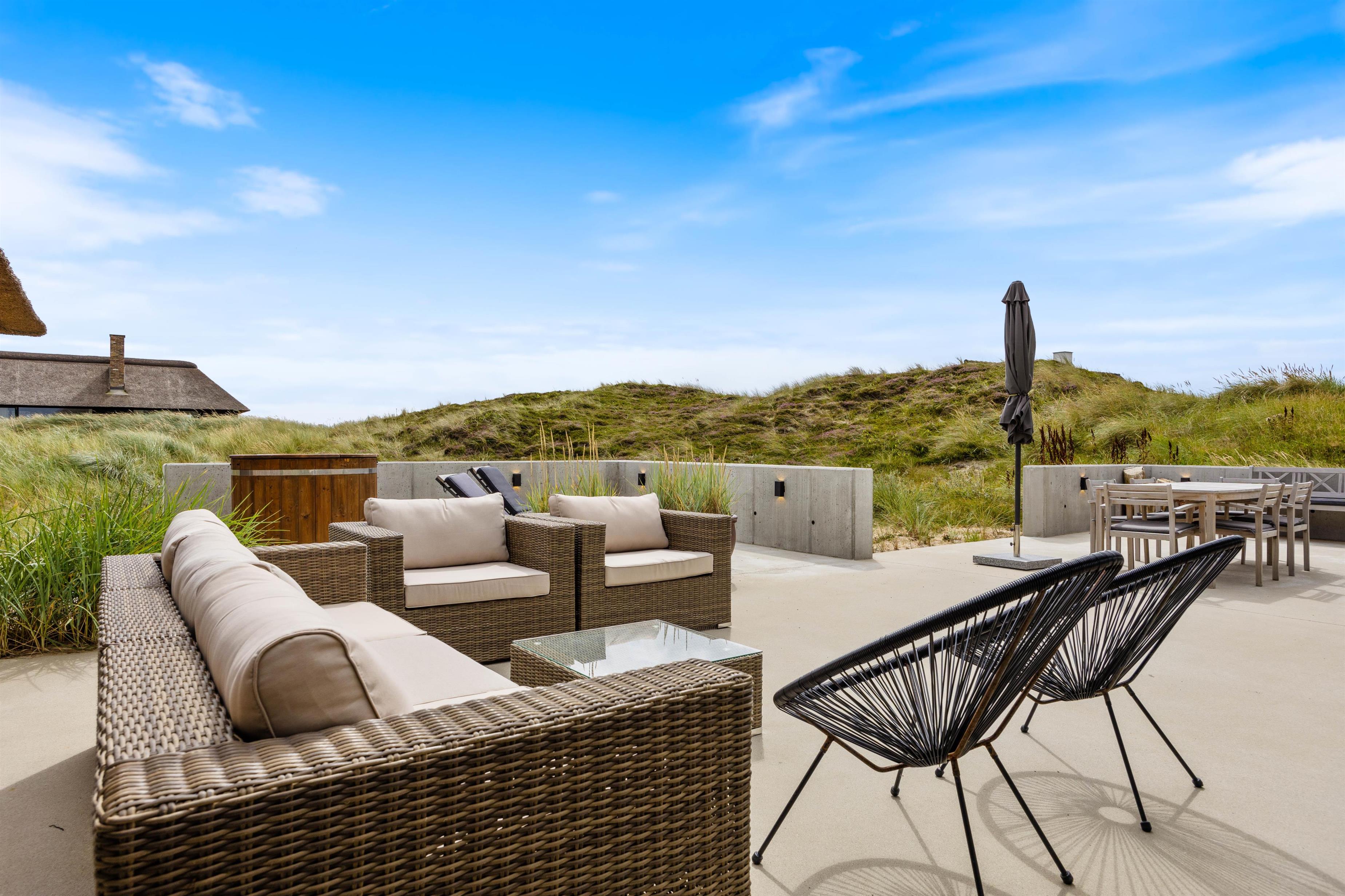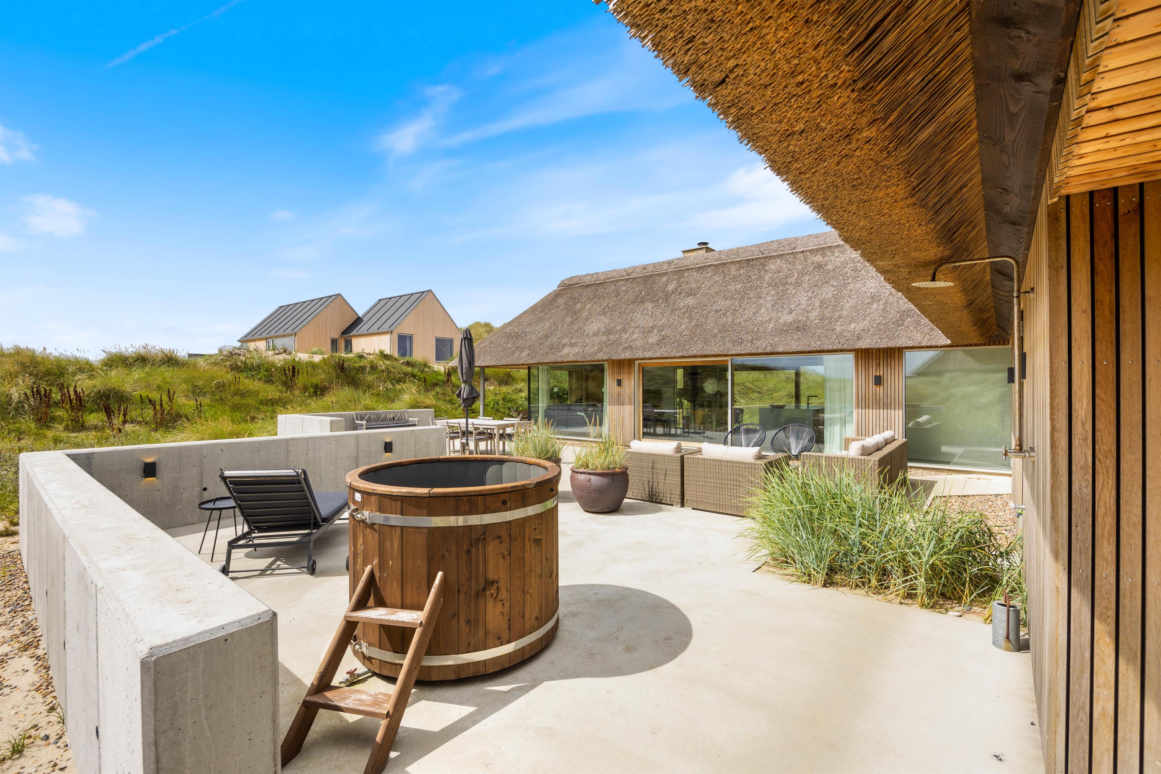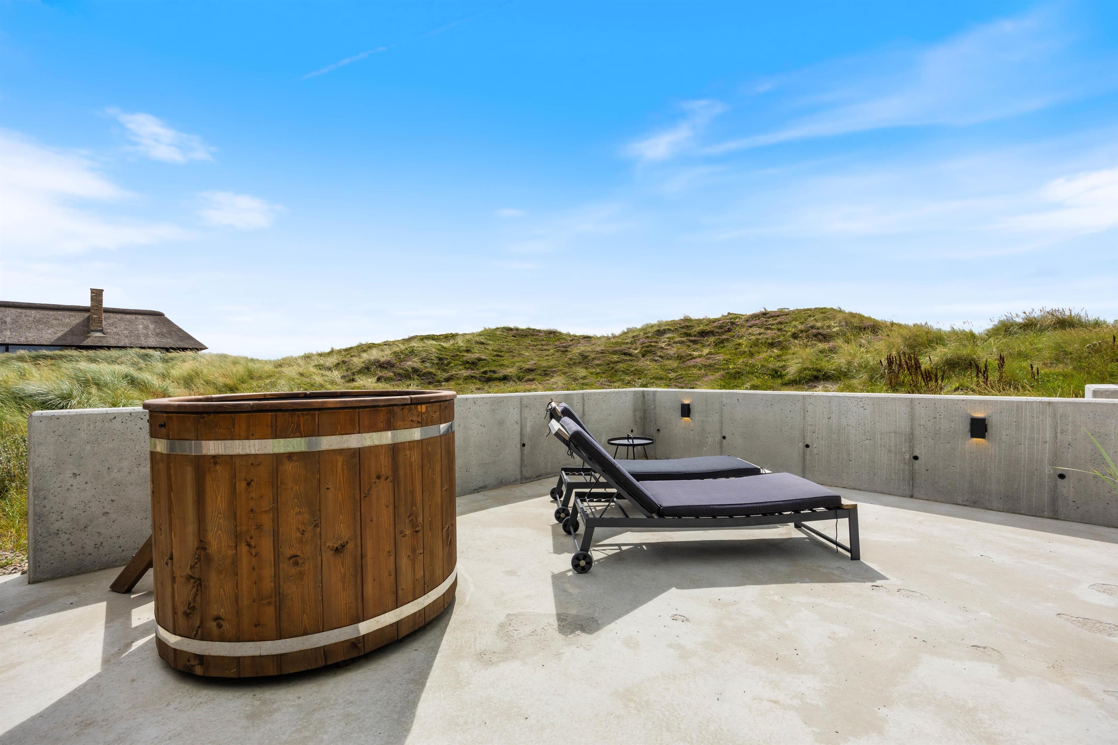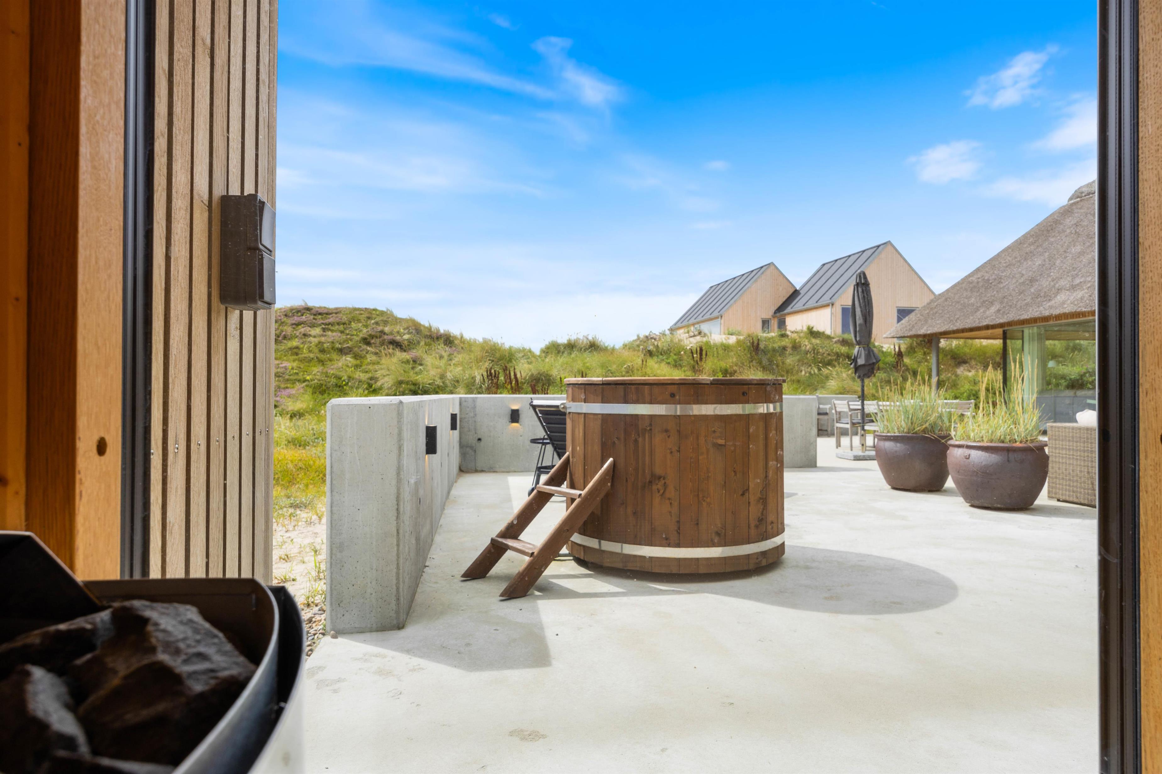 Med kun 450 meter til det brusende Vesterhav kan I på de varme sommerdage tage jer en frisk dukkert i havet og efterfølgende nyde godt af sommerhusets udebruser. Som et lille alternativ til det store Vesterhav råder feriehuset endda også over et koldtvandskar, hvor I kan dyppe kroppen. Uanset hvad I vælger, kan I få varmen igen i udesaunaen.