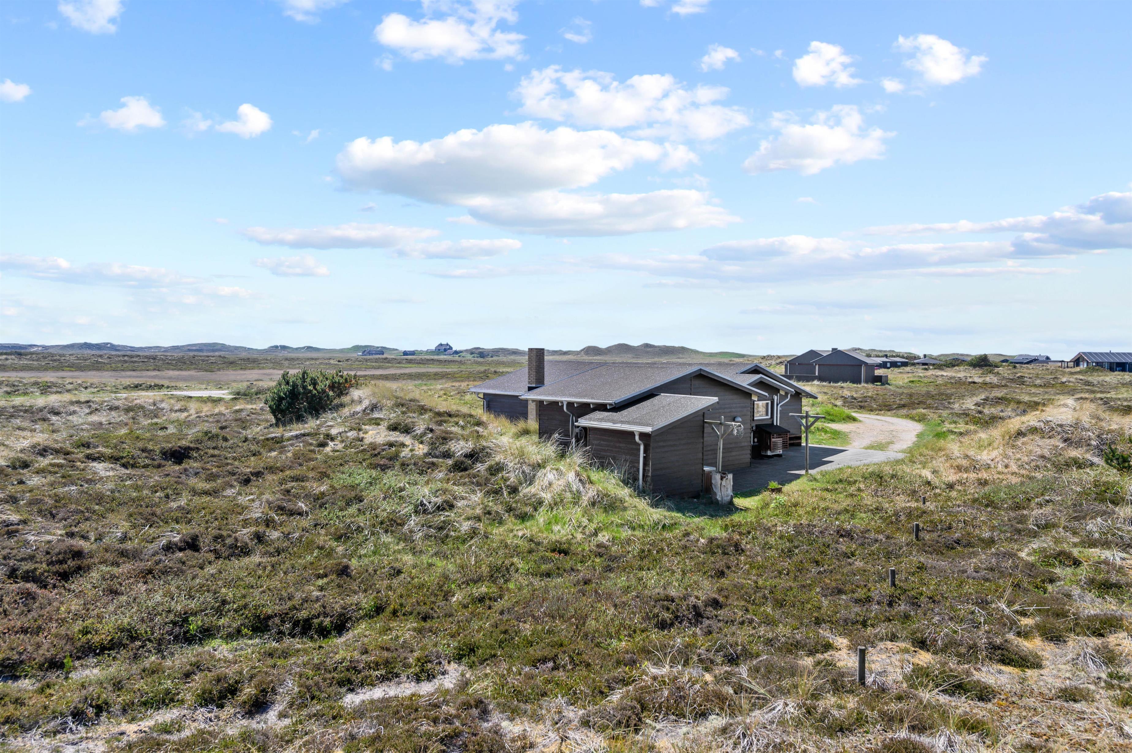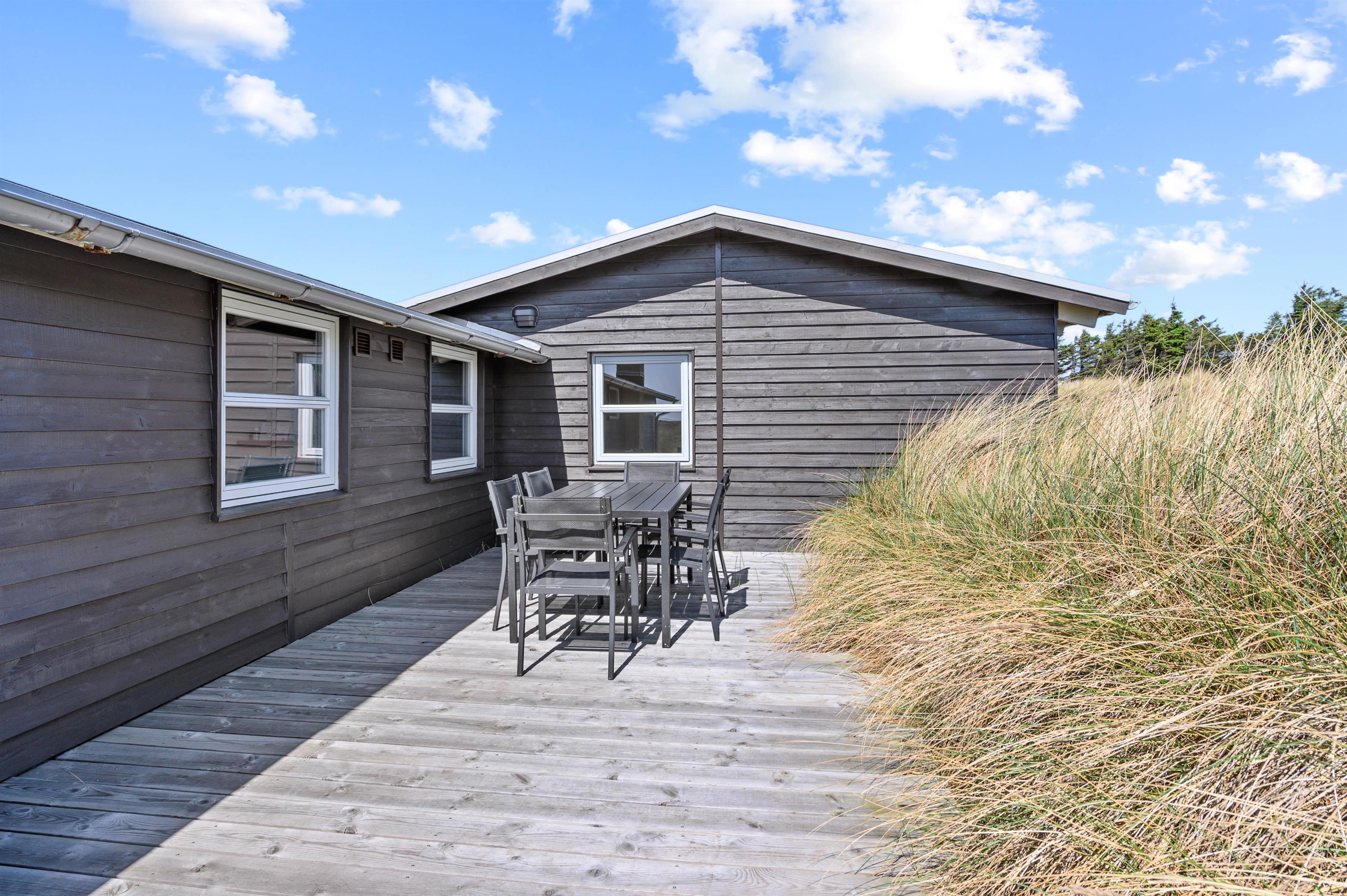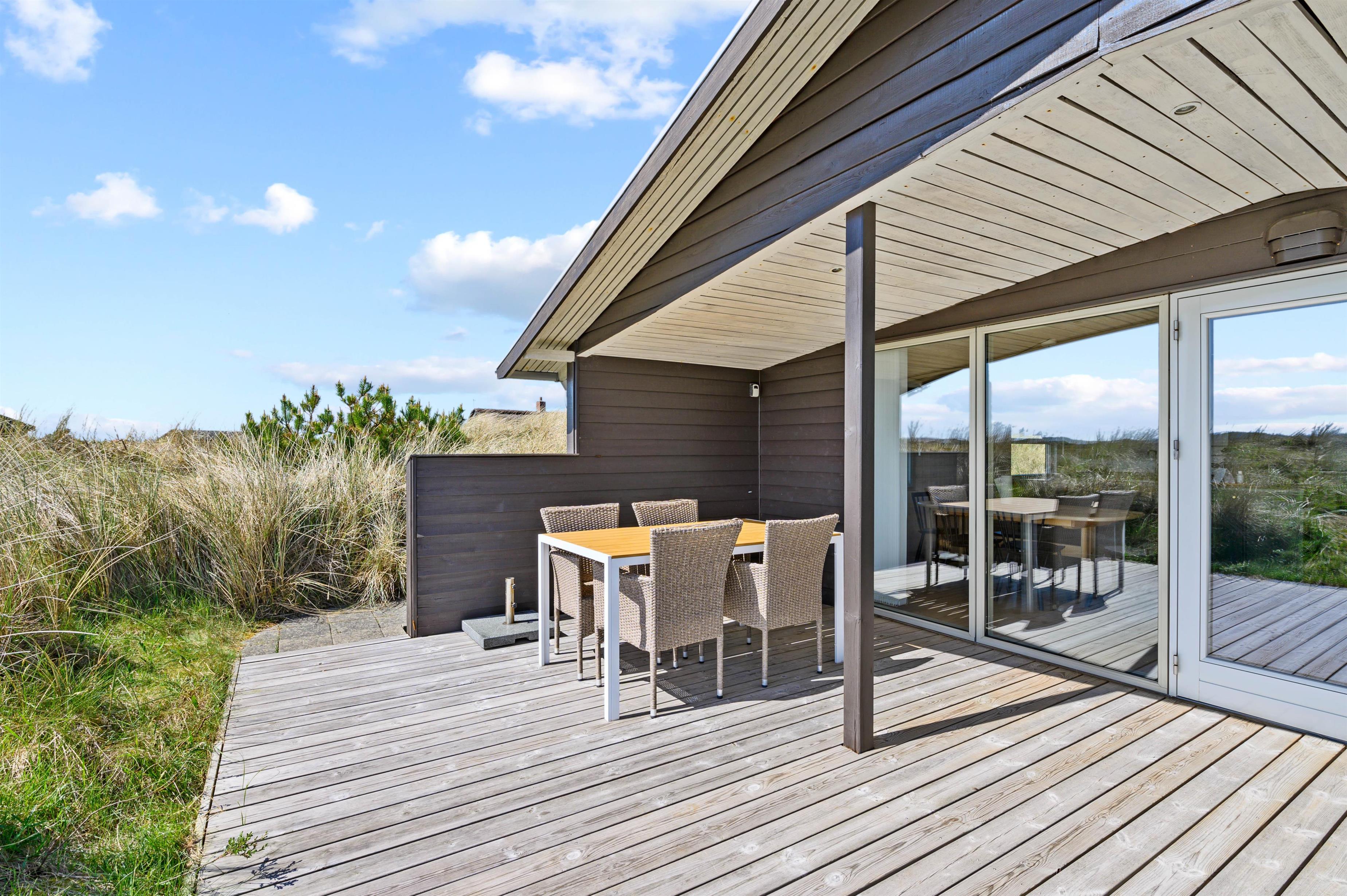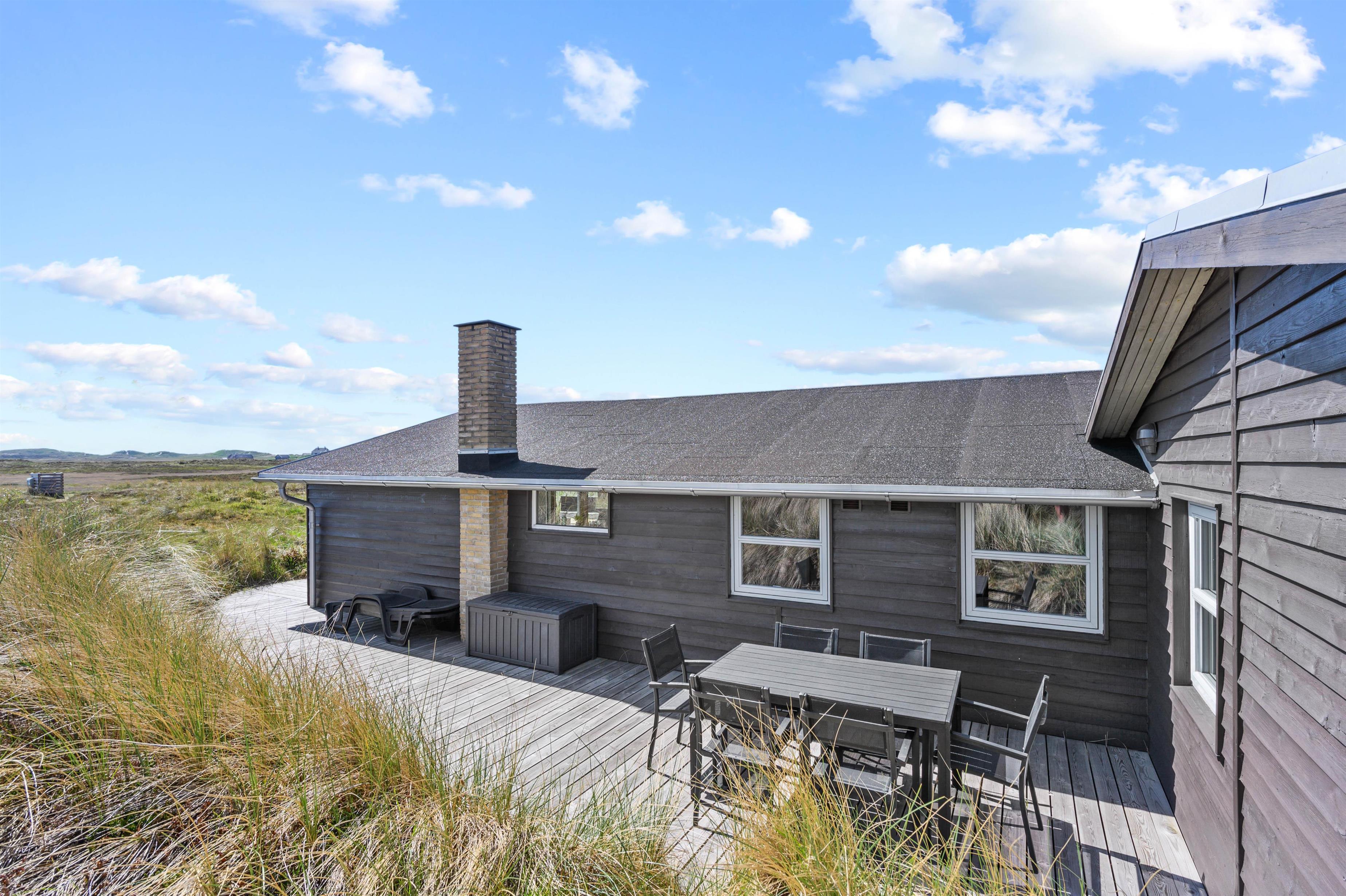 Hvis man er stresset og træt og trænger til en ferie med fred, ro og en smuk udsigt, så er dette hus perfekt. Mod syd og sydvest er landskabet helt åbent, og der er ikke mange huse i dette område. Der er en sti til Vesterhavet lige uden for døren, og havet kan både høres og duftes fra terrasserne omkring huset. Terrasserne er placeret rigtigt godt, så man kan følge solen omkring huset, og man kan ofte finde en krog med læ. Mod syd er terrassen delvis overdækket.