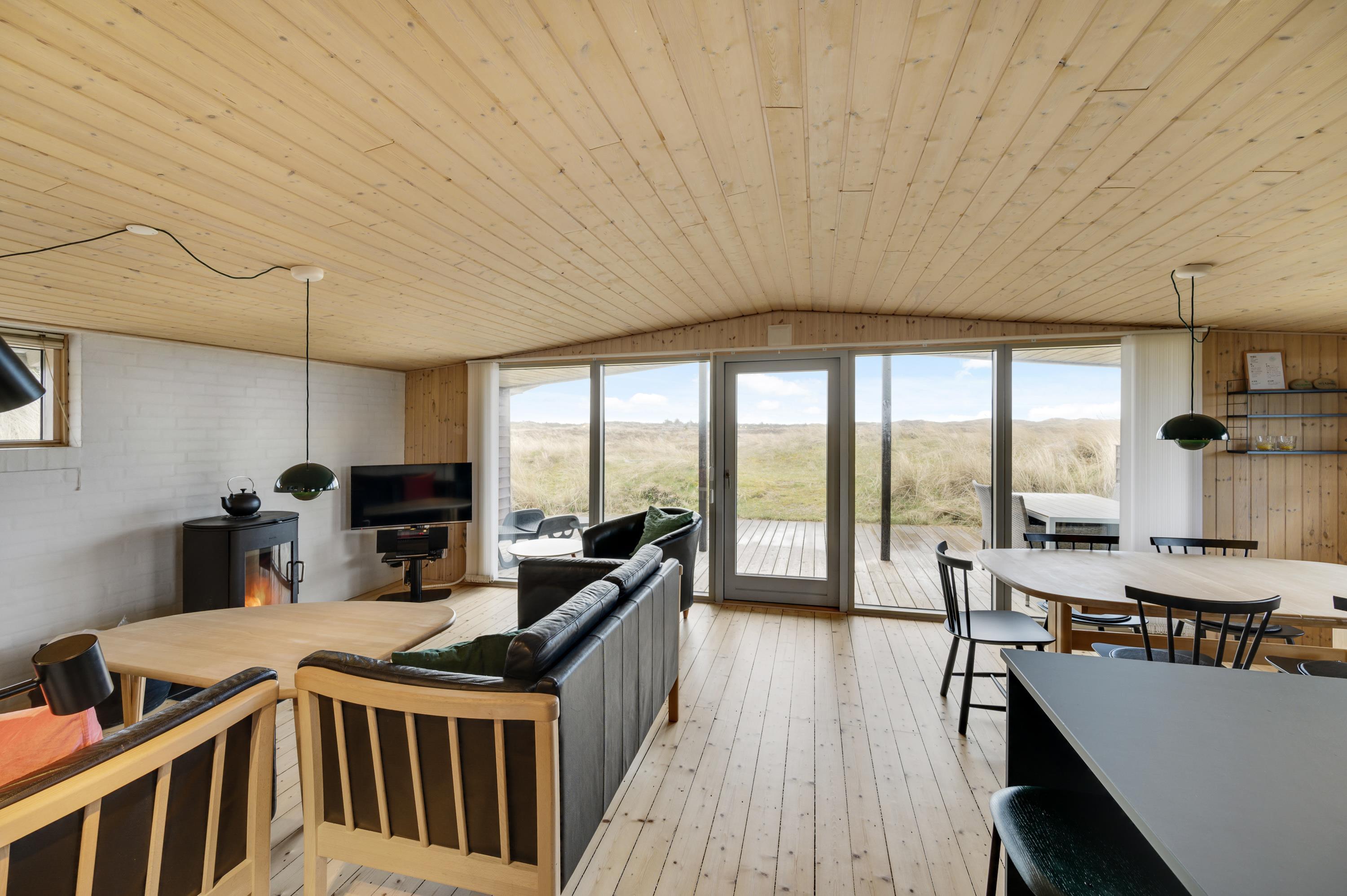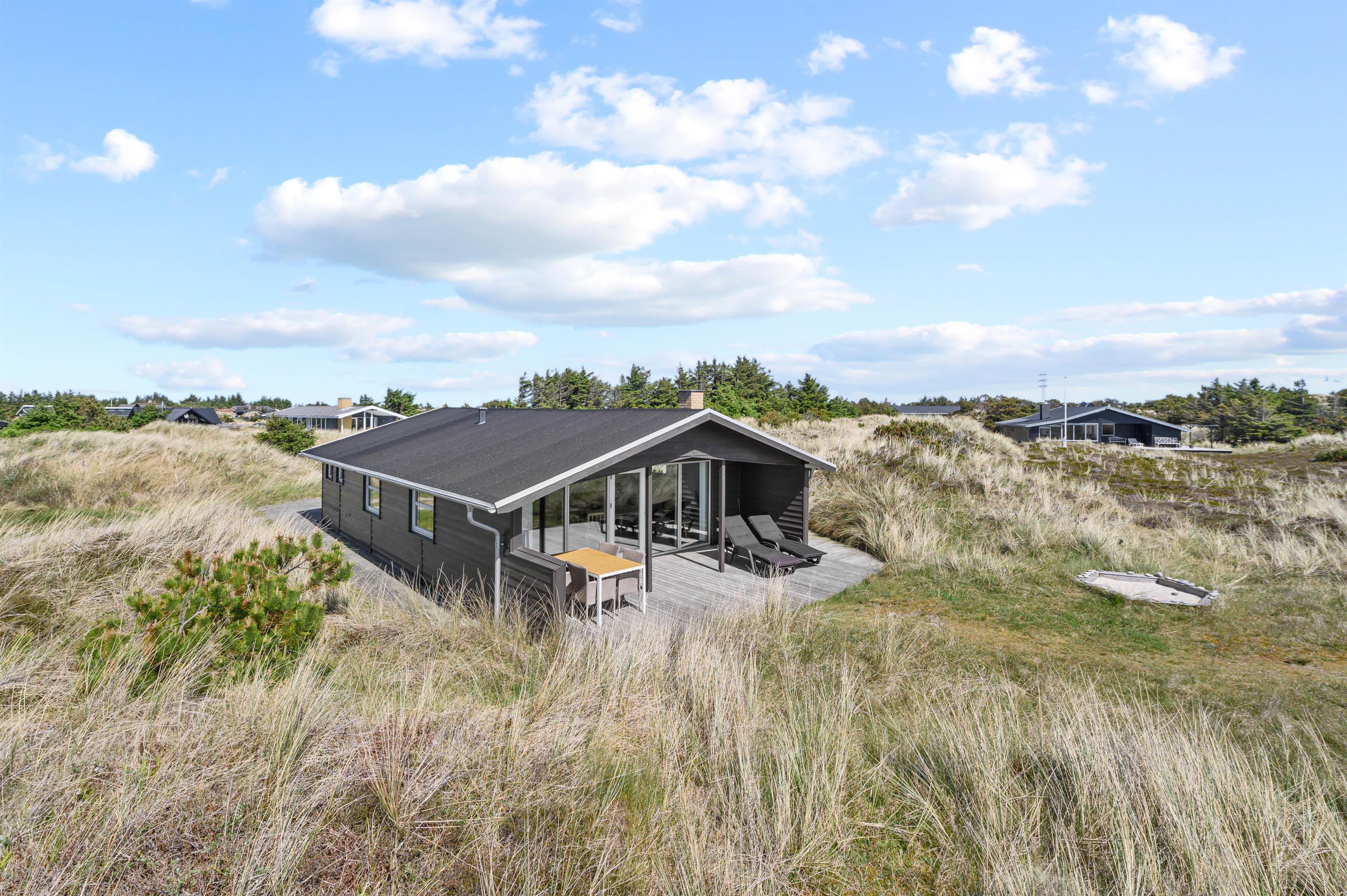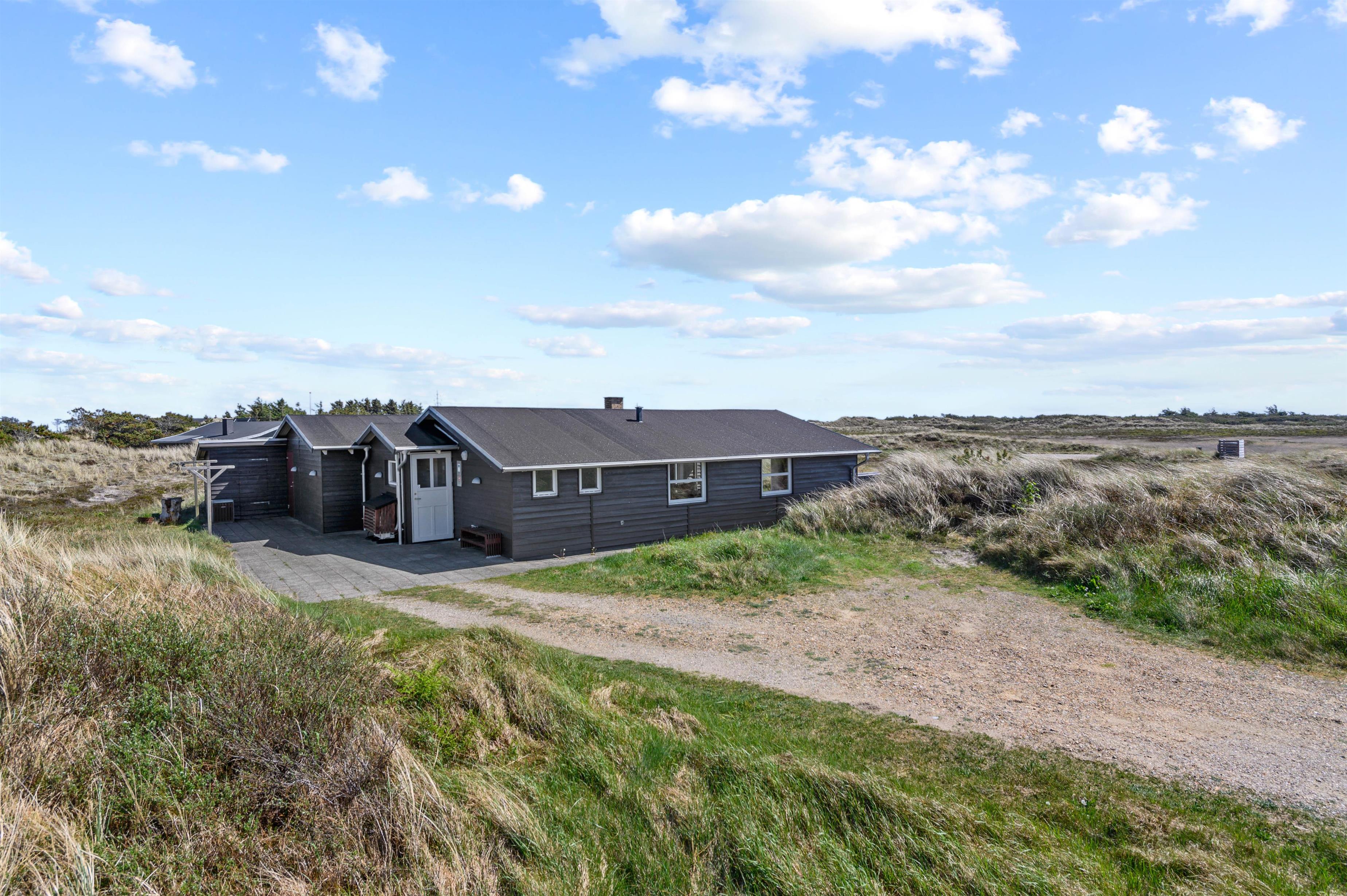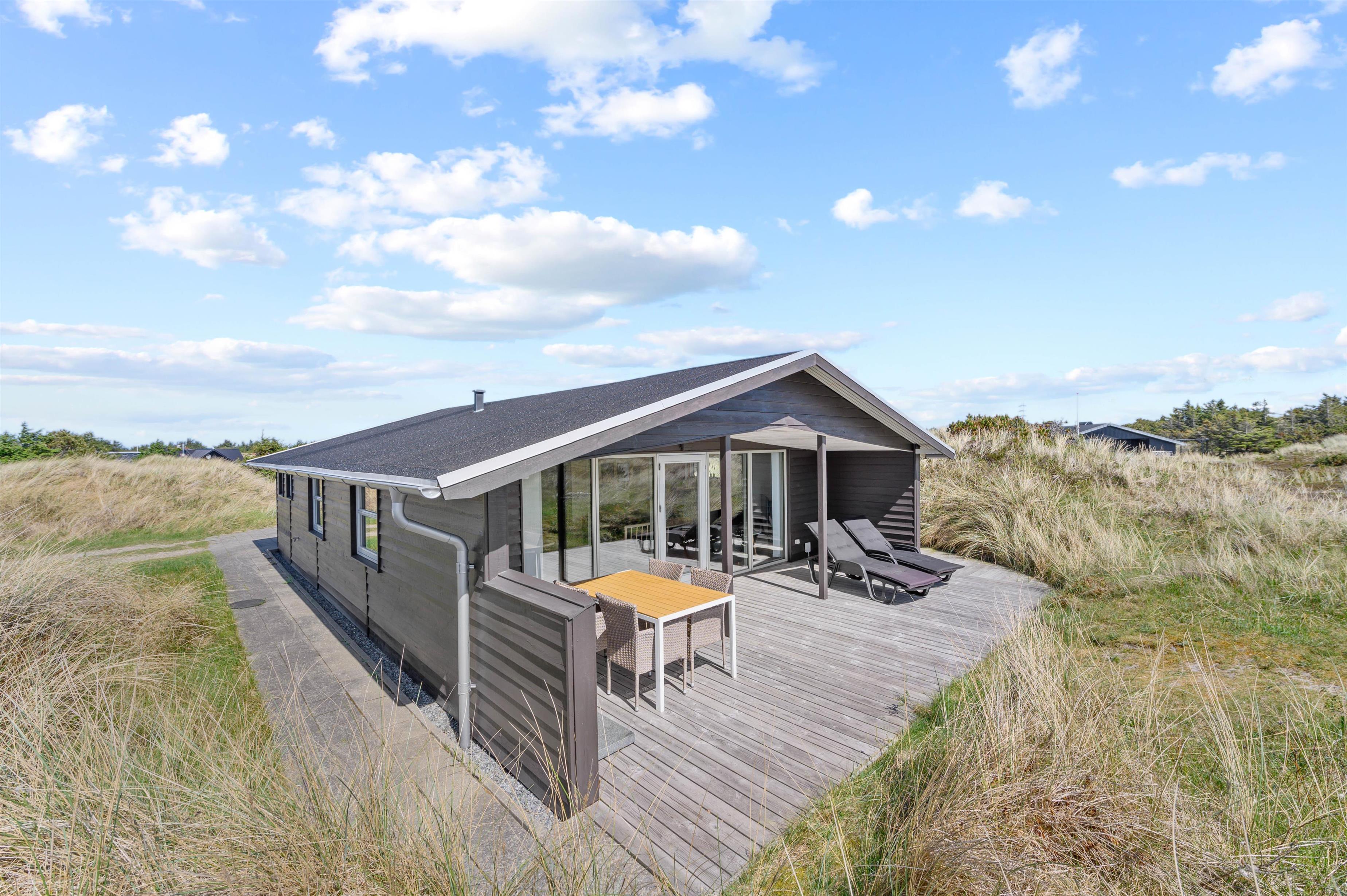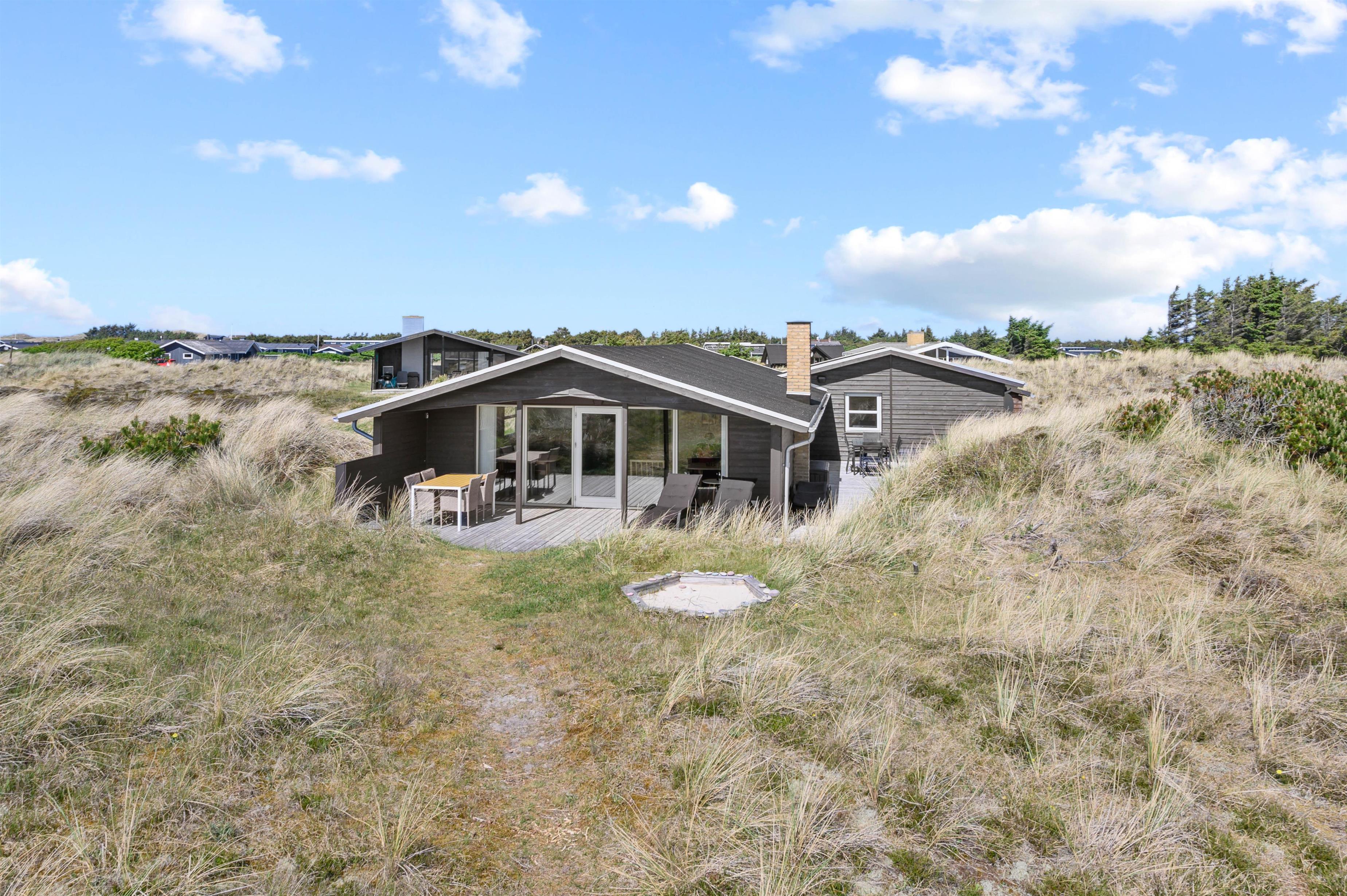 Hvis man er stresset og træt og trænger til en ferie med fred, ro og en smuk udsigt, så er dette hus perfekt. Mod syd og sydvest er landskabet helt åbent, og der er ikke mange huse i dette område. Der er en sti til Vesterhavet lige uden for døren, og havet kan både høres og duftes fra terrasserne omkring huset. Terrasserne er placeret rigtigt godt, så man kan følge solen omkring huset, og man kan ofte finde en krog med læ. Mod syd er terrassen delvis overdækket.