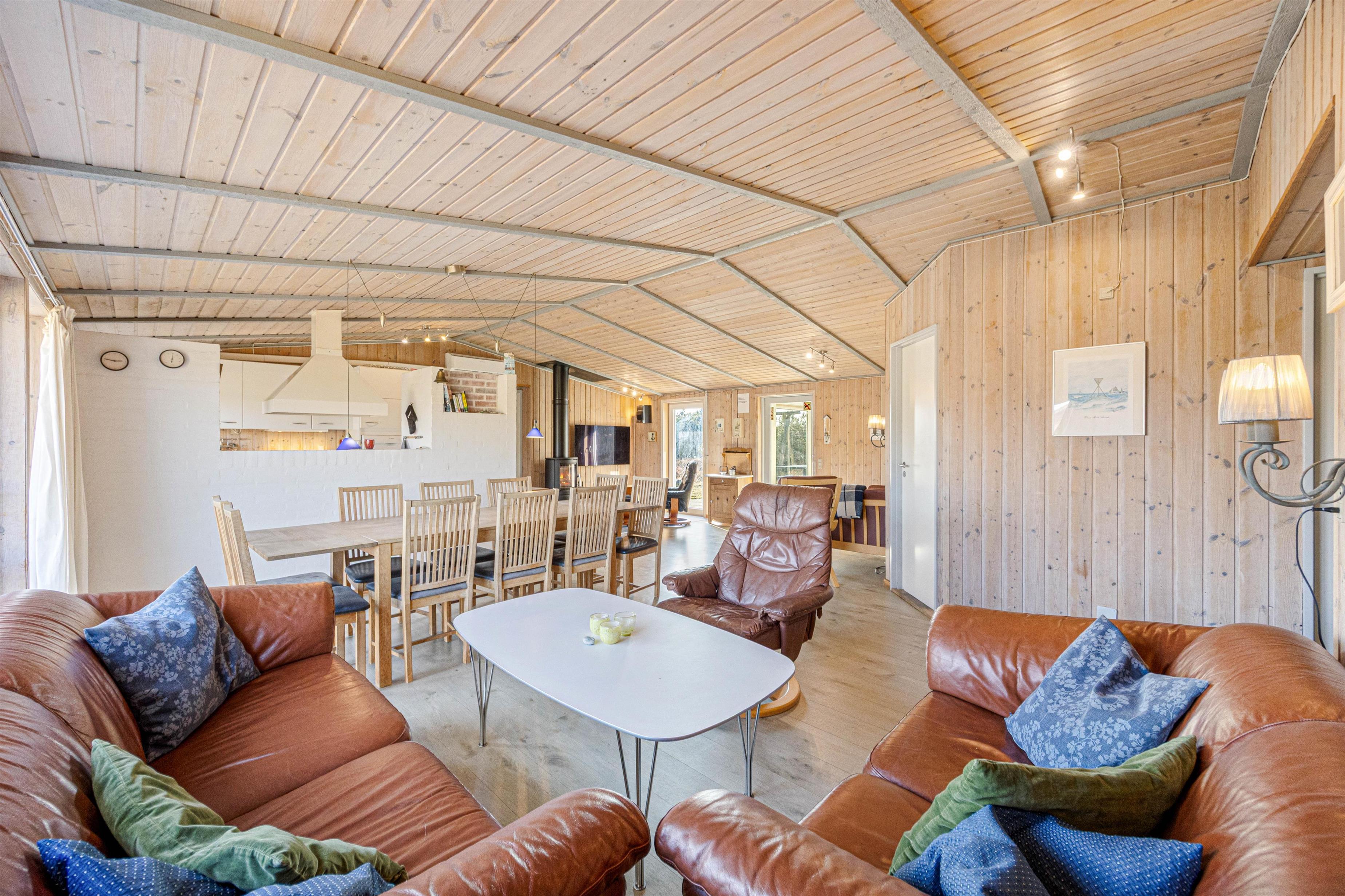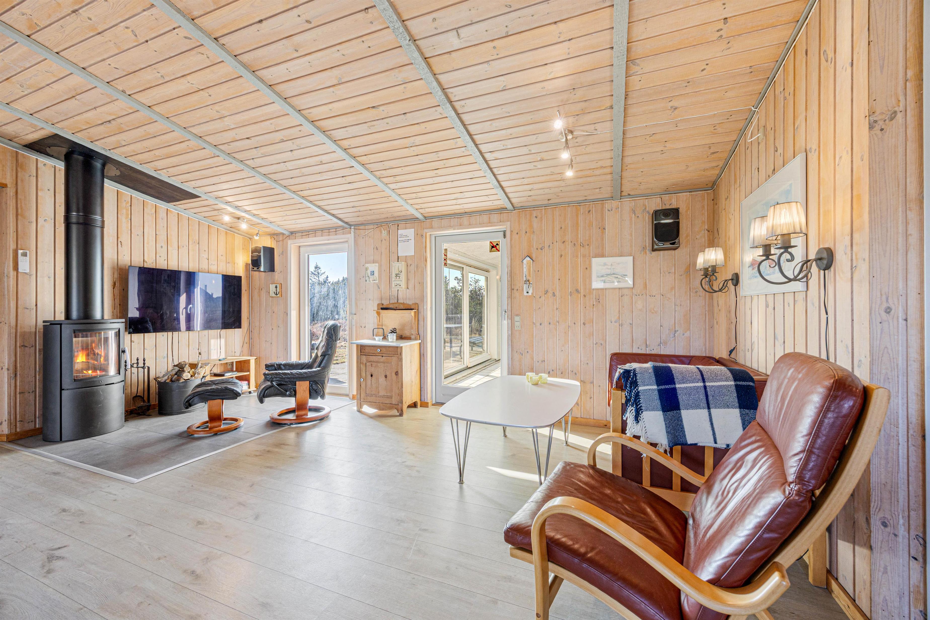 Sommerhusets hjerte er det åbne opholdsrum, hvor køkken, spiseplads og stue smelter sammen. Her kan I samles omkring spisebordet eller slappe af i sofaen med udsigt til naturen. Brændeovnen skaber en hyggelig stemning, mens varmepumpen sikrer en behagelig temperatur året rundt. Køkkenet er veludstyret med opvaskemaskine, så det praktiske hurtigt er klaret.
