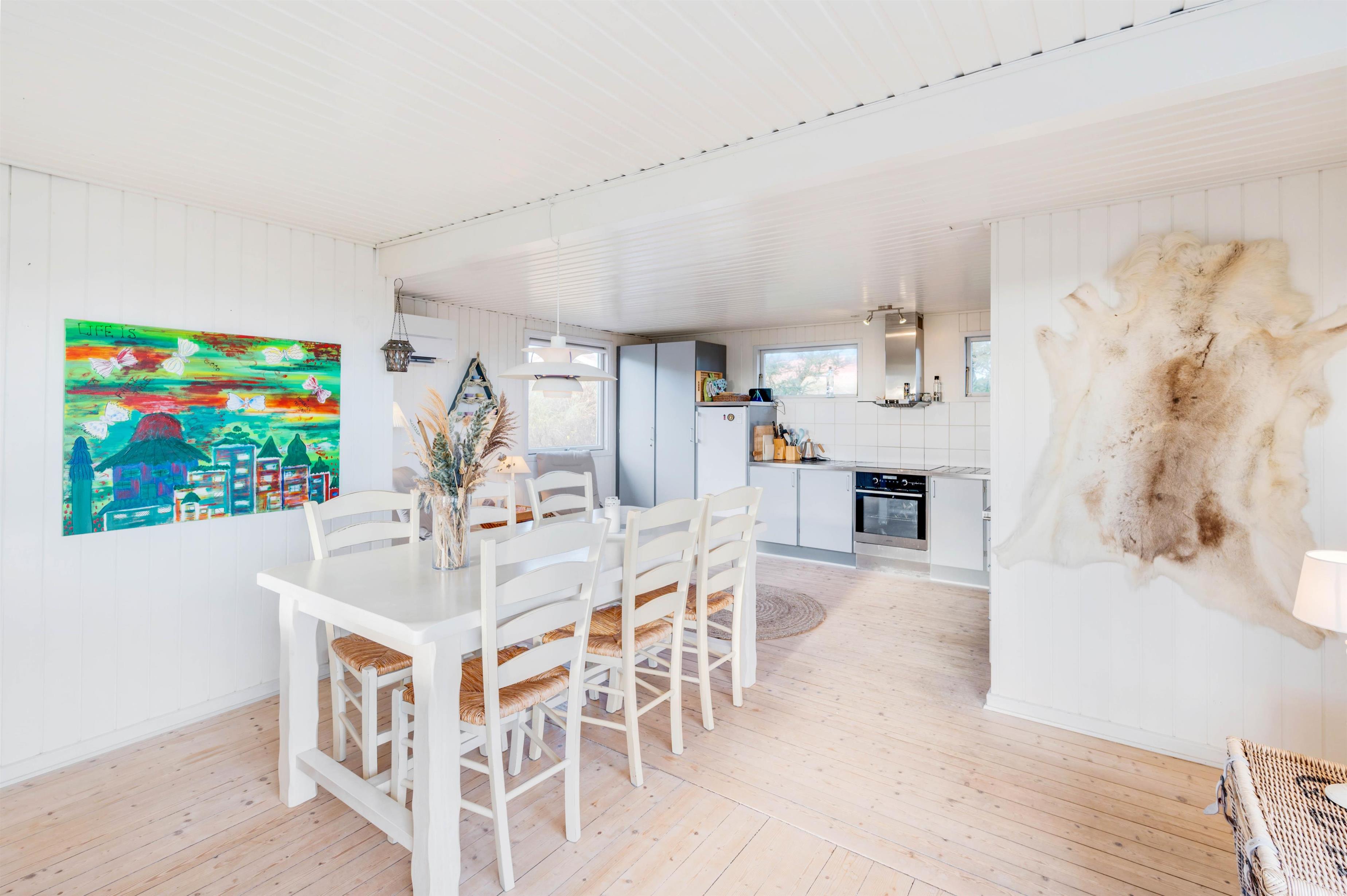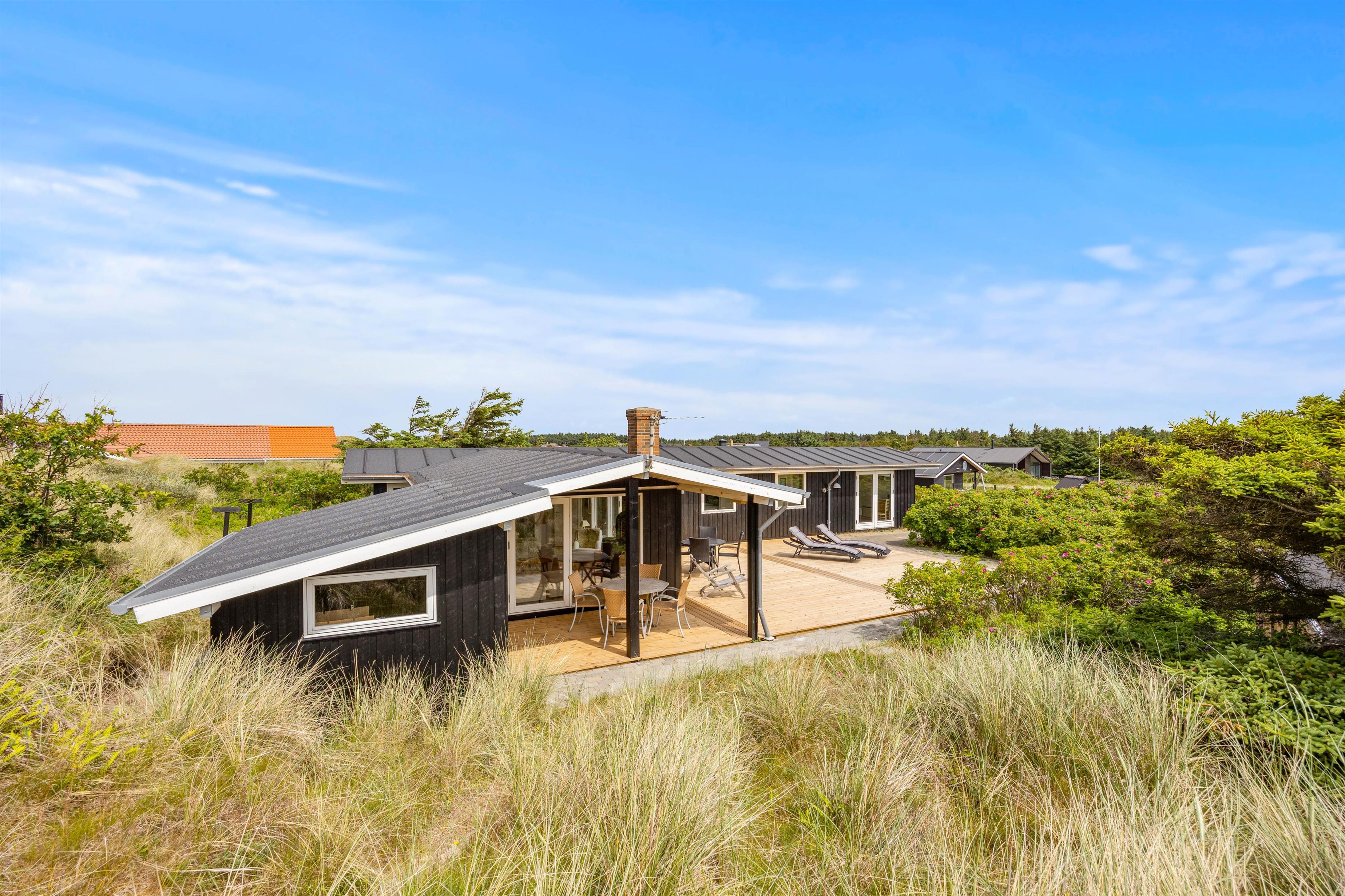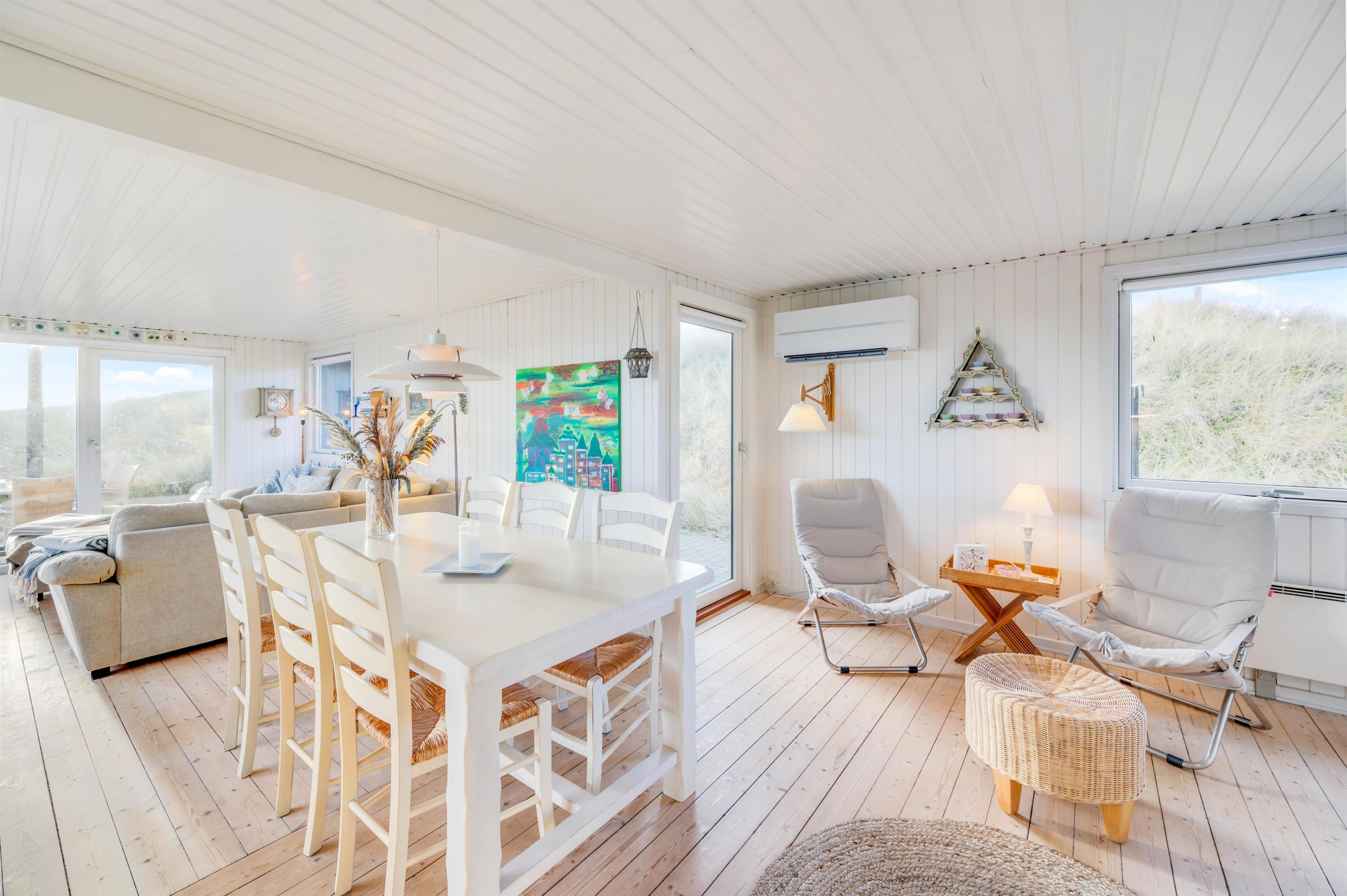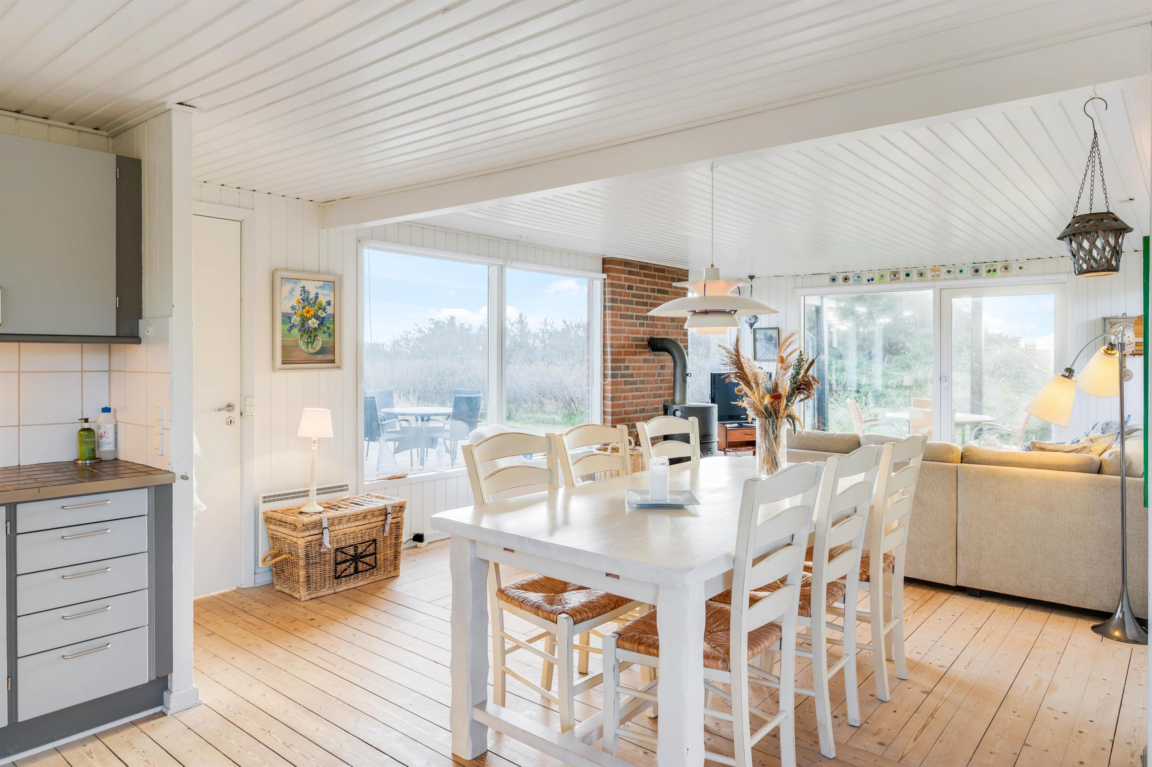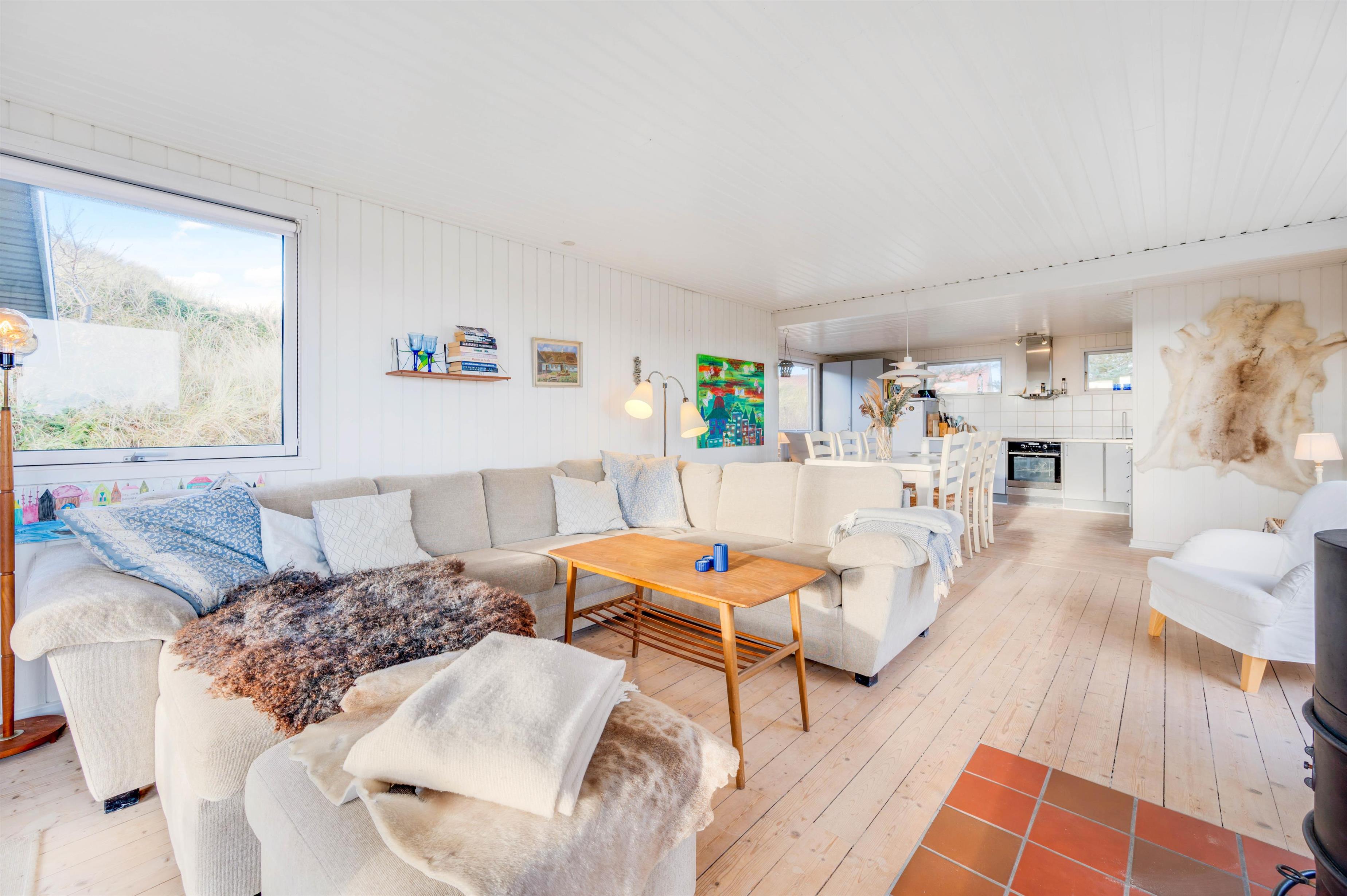 Dette sommerhus byder jer velkommen med den hyggelige indretning, hvor brændeovnen sørger for den sidste feriestemning. Fra det store vinduesparti i stuen får I både et dejligt lysindfald fra solens stråler og ikke mindst udsigt til det smukke klitlandskab. Derudover har sommerhuset 3 soveværelser og hele 2 badeværelser, hvor det ene er med gulvvarme. I kan være sikker på, at der ikke bliver kø om morgenen, og hvis I er to familier, kan hver familie have deres eget badeværelse.
