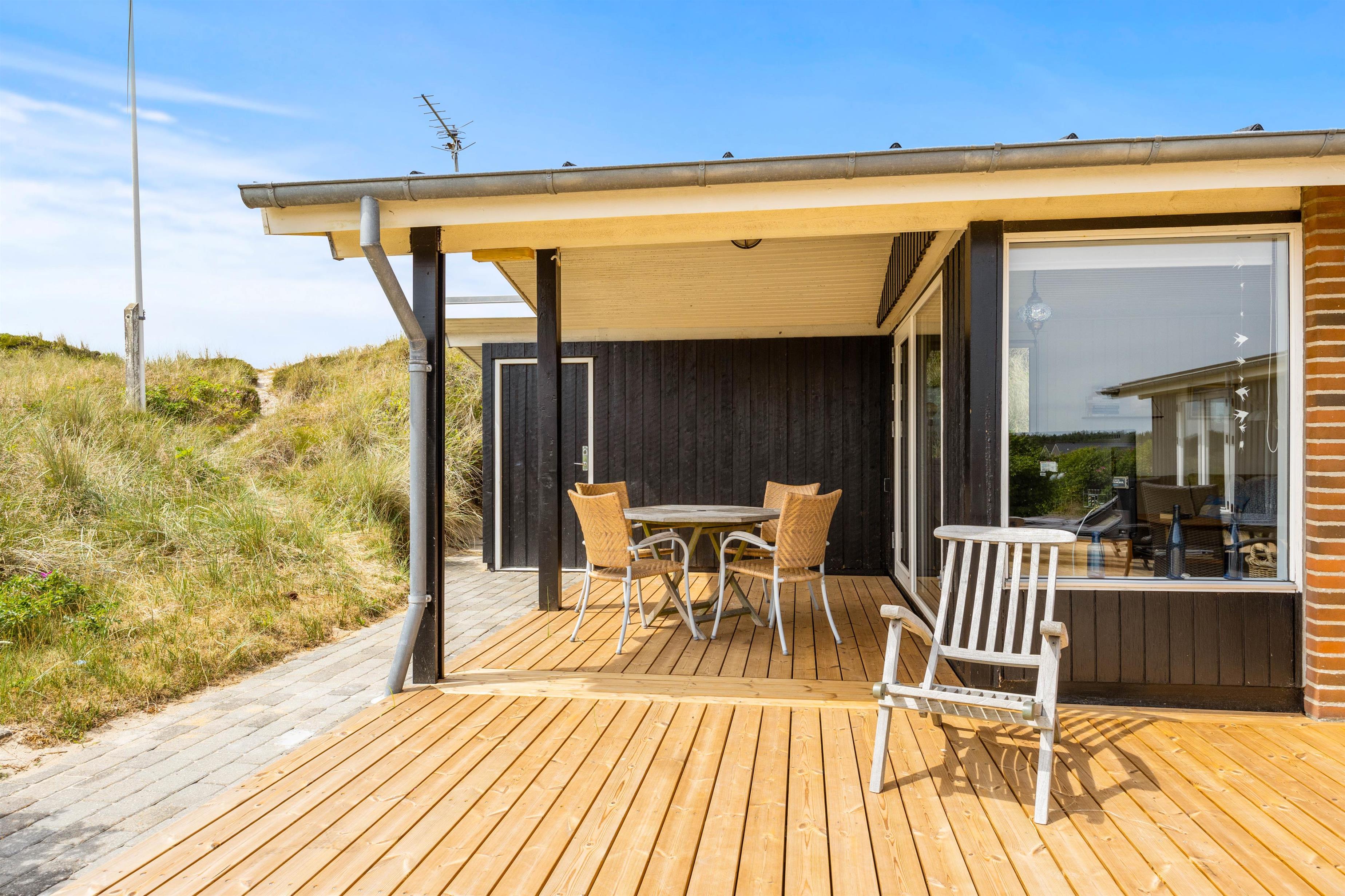Sommerhuset er placeret kun 450 meter fra stranden, så det kræver ikke mange minutter på gåben, og så har I nærmest fødderne dybt begravet i den bløde sandstrand. Ydermere er sommerhuset placeret ved første klitrække, så fra sommerhusets terrasse har I en helt fantastisk udsigt over det skønne naturområde og det omkringliggende klitlandskab. Selv ikke nabo-sommerhusene kan ødelægge denne udsigt. Så lav en kop morgenkaffe og nyd den til solopgangen på terrassen, mens familiens sovetryner sover længe.