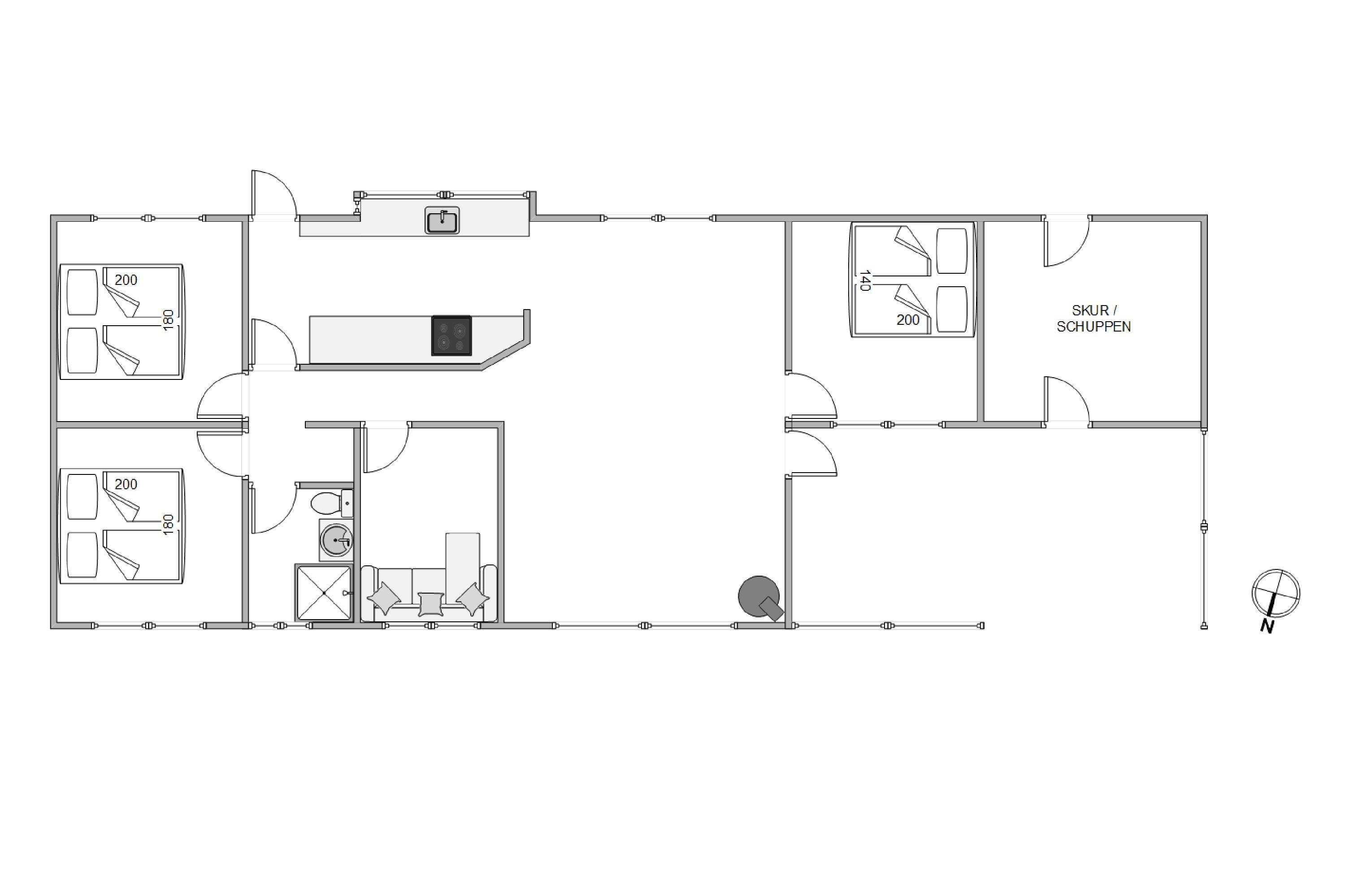 I dette sommerhus kan I folde jer ud på 3 gode soveværelser, hvoraf to har en dobbeltseng og det sidste en 3/4 seng. Og derudover finder I også et badeværelse.