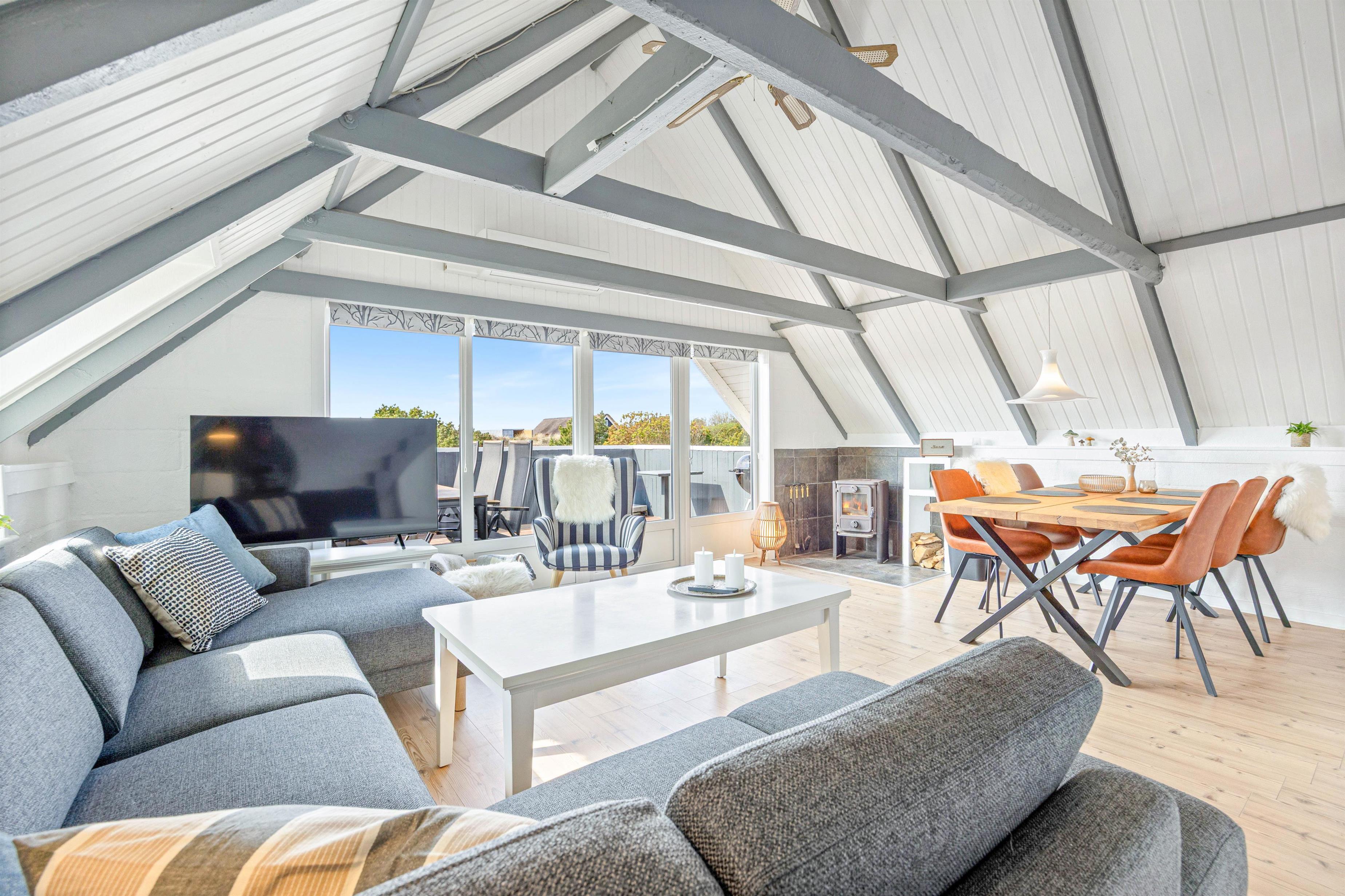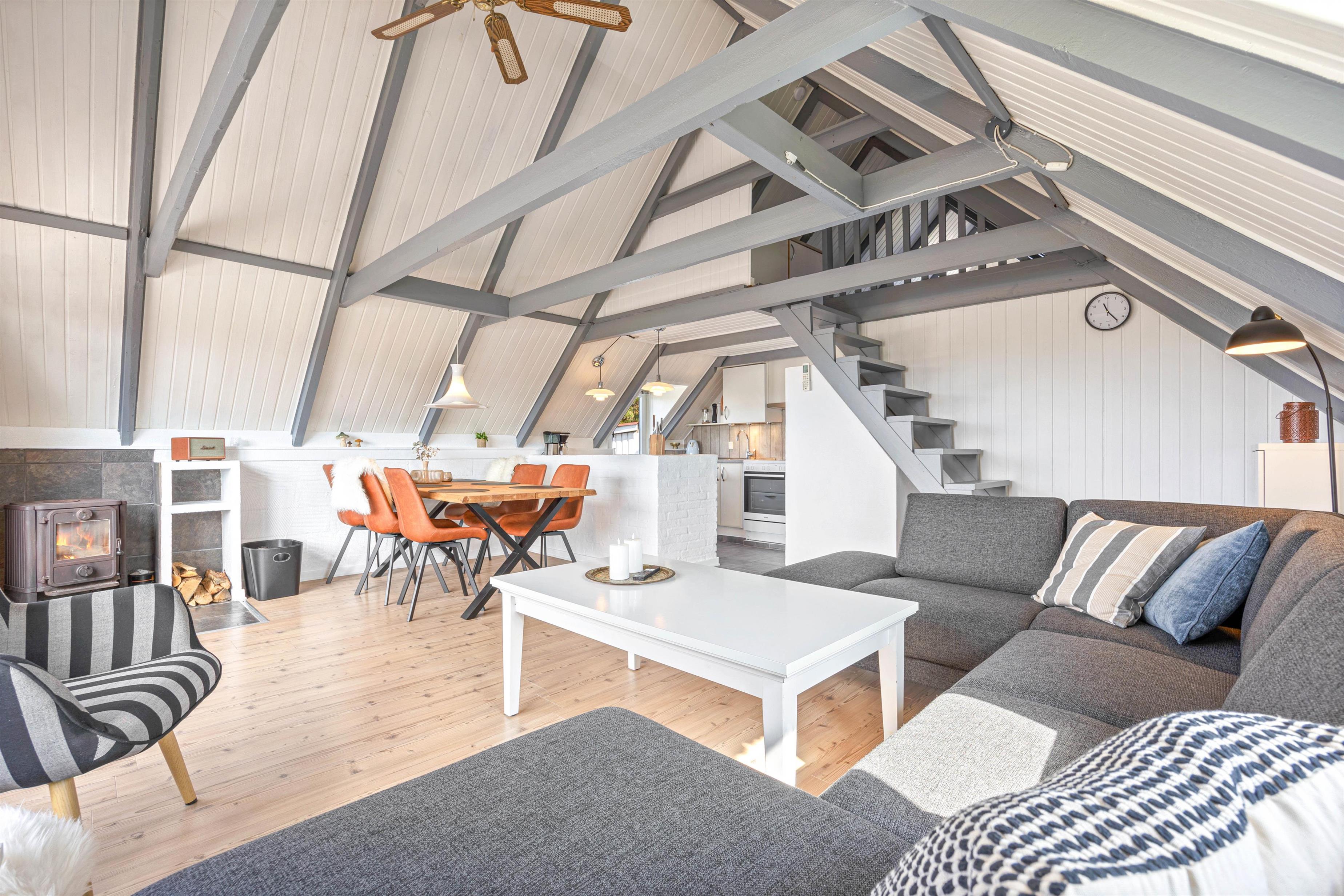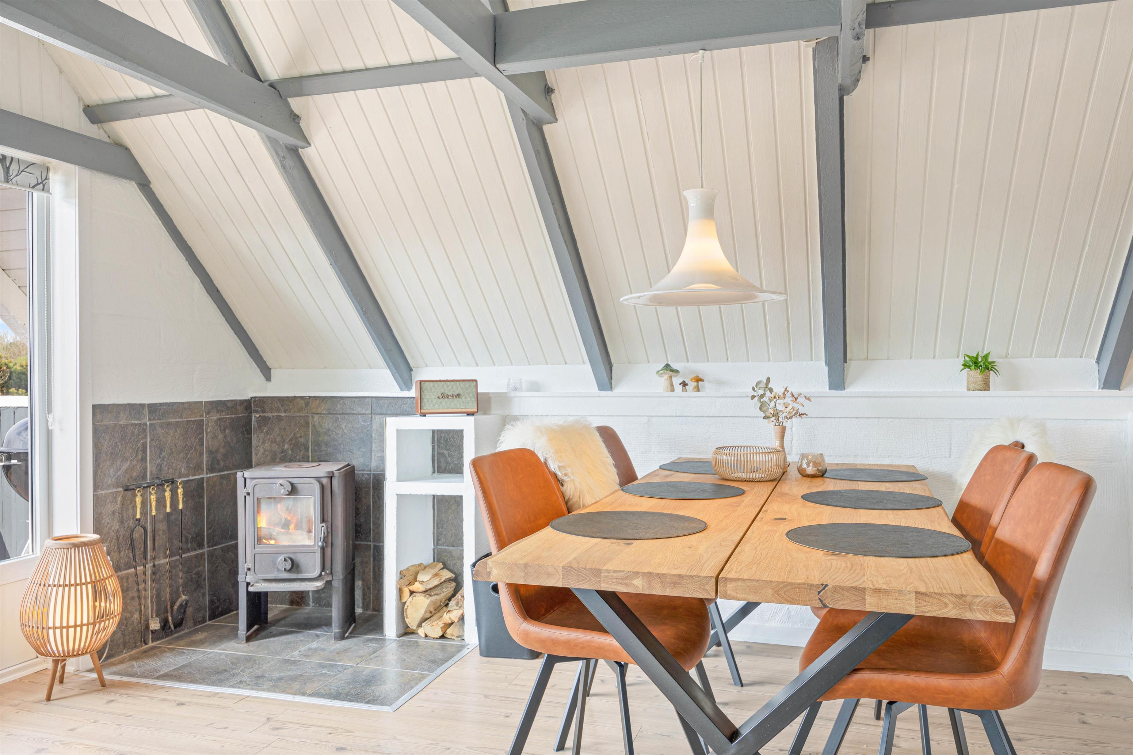 Den hyggelige stue er udstyret med en brændeovn, der skaber en hyggelig stemning på de køligere aftener. Derudover er der også en varmepumpe i sommerhuset, så I er sikret en dejlig inde temperatur.
