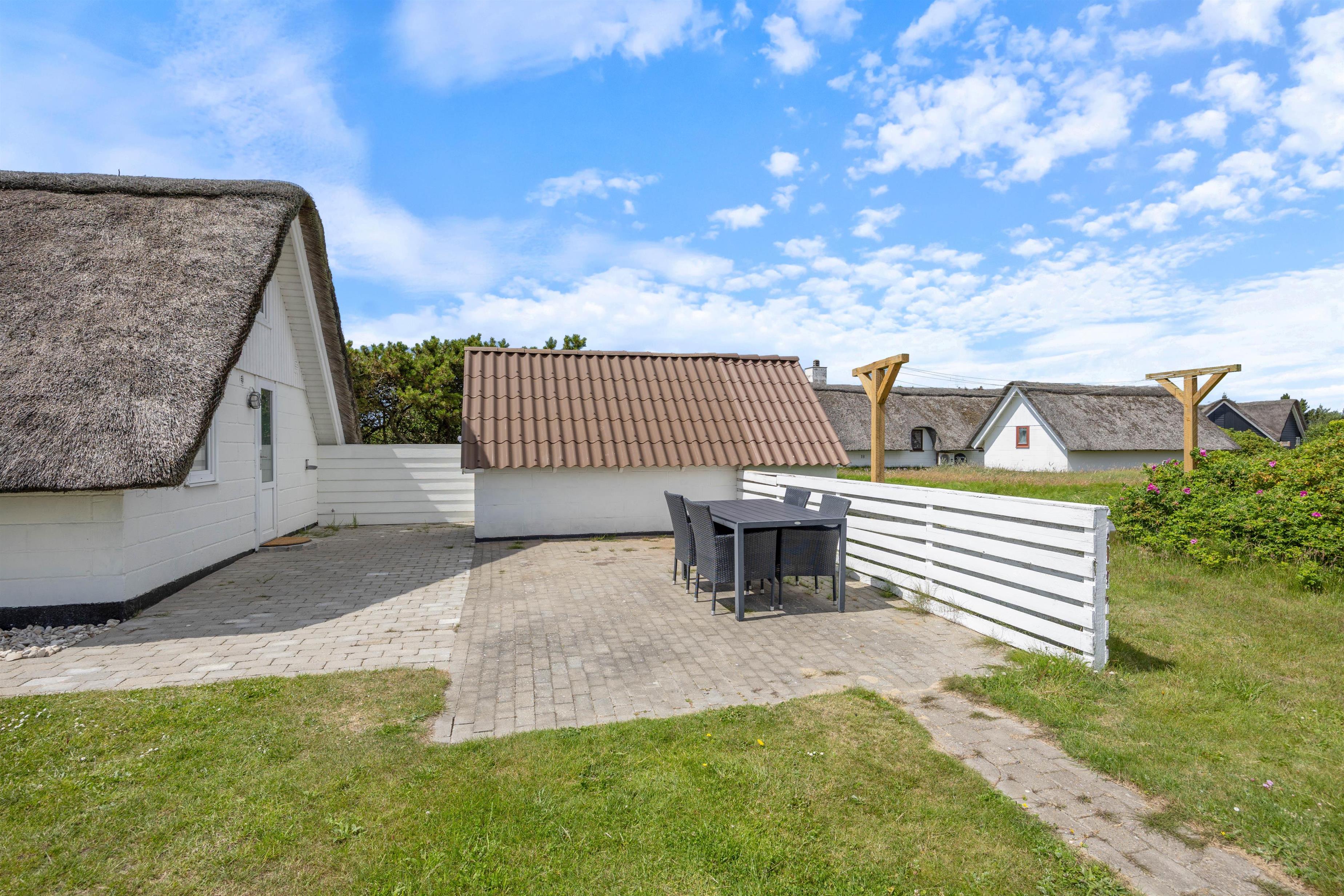 Udenfor finder I en afskærmet og lukket terrasse, ideel til stille stunder med en kop kaffe i solskinnet eller fælles middage og hyggelige aftener, mens hunden kan løbe frit rundt på terrassen. Havemøblerne indbyder til udendørs afslapning, mens grillen står klar til at levere lækre måltider på de lange, lyse aftener.